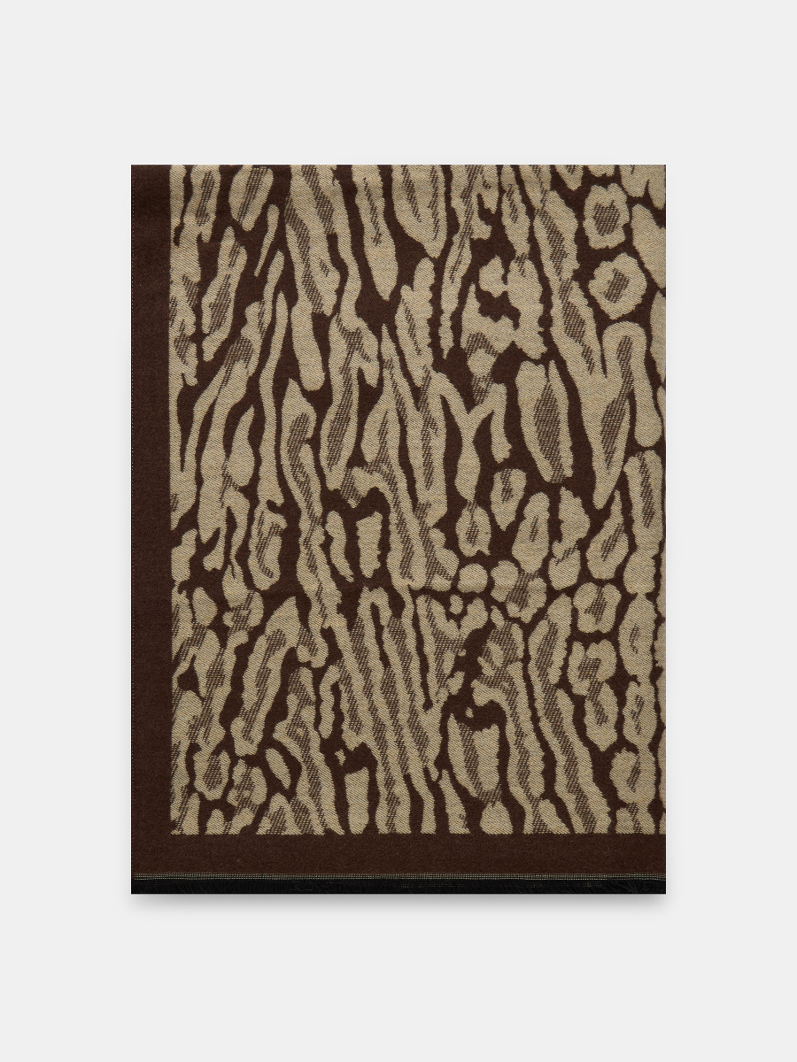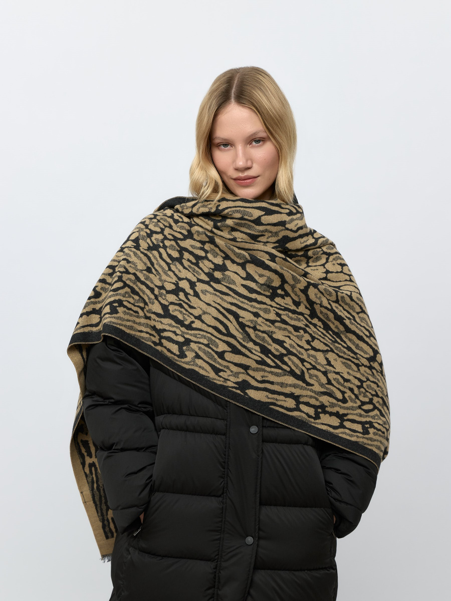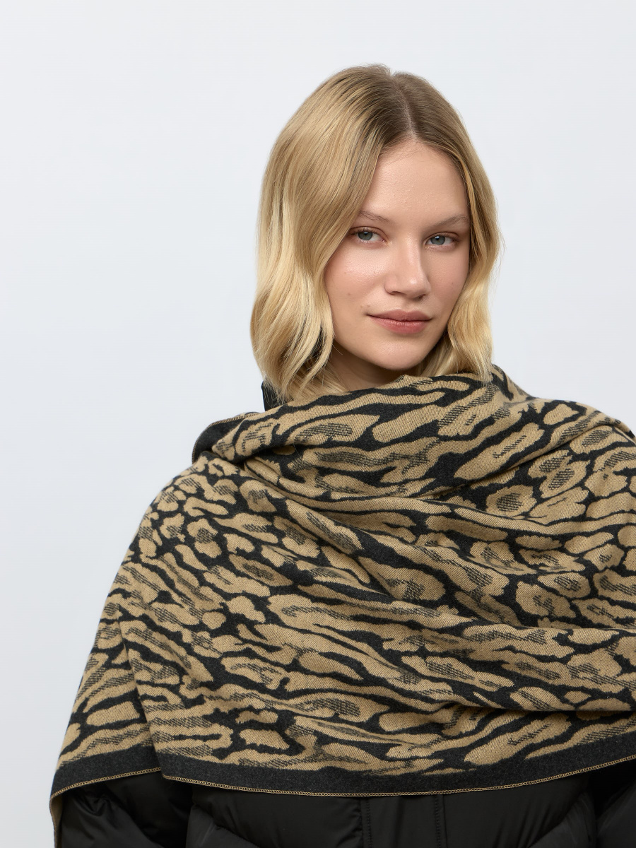 Акцентный двухсторонний палантин с крупным анималистическим принтом и шелковистой бахромой. Красиво стилизуется оформленными складками на любую сторону. Легкое согревающее полотно с вискозой и шерстью укрывает от холодного ветра. Размер изделия: 70x190 см.