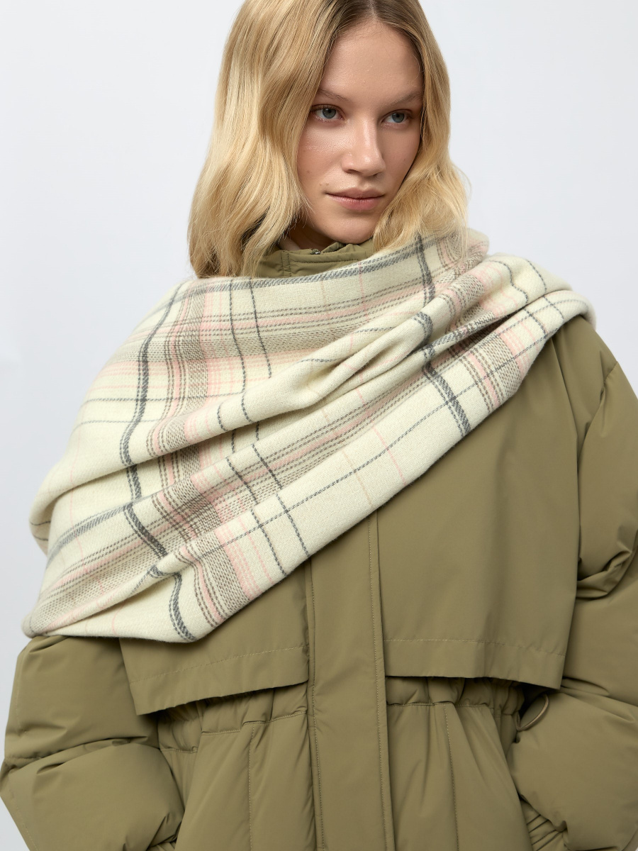 Объемный палантин с витой бахромой и мягким акцентным принтом в крупную тонкую клетку. Ключевые оттенки рисунка: молочный, бежевый, розовый, серый. Плотное полотно с добавлением шерсти — легкое и тактильное. Красиво стилизуется под ремень, а также драпируется объемными волнами по плечам. Размер изделия: 70x190 см.