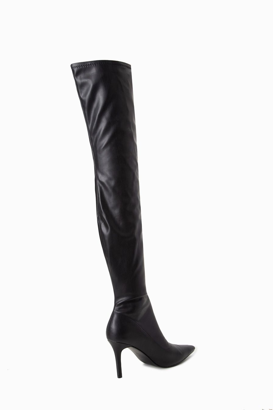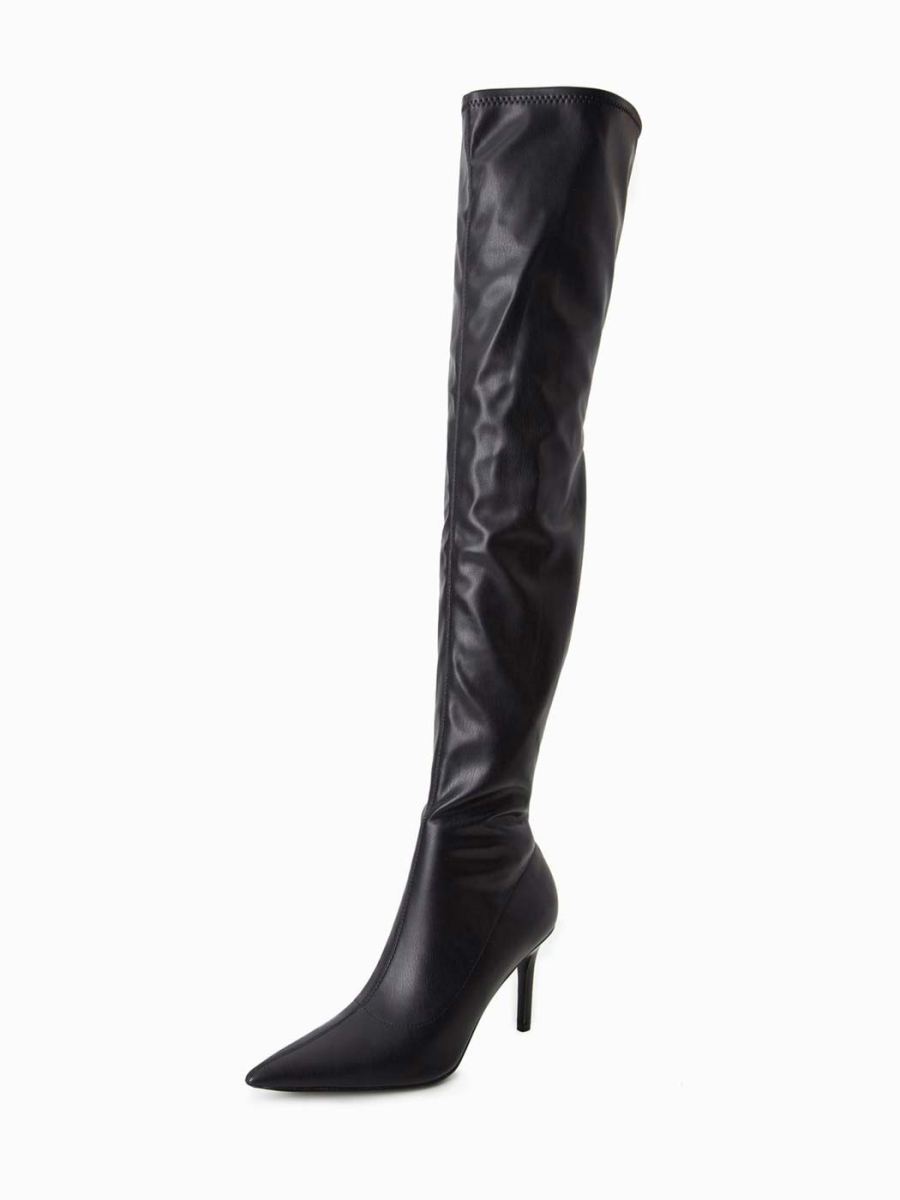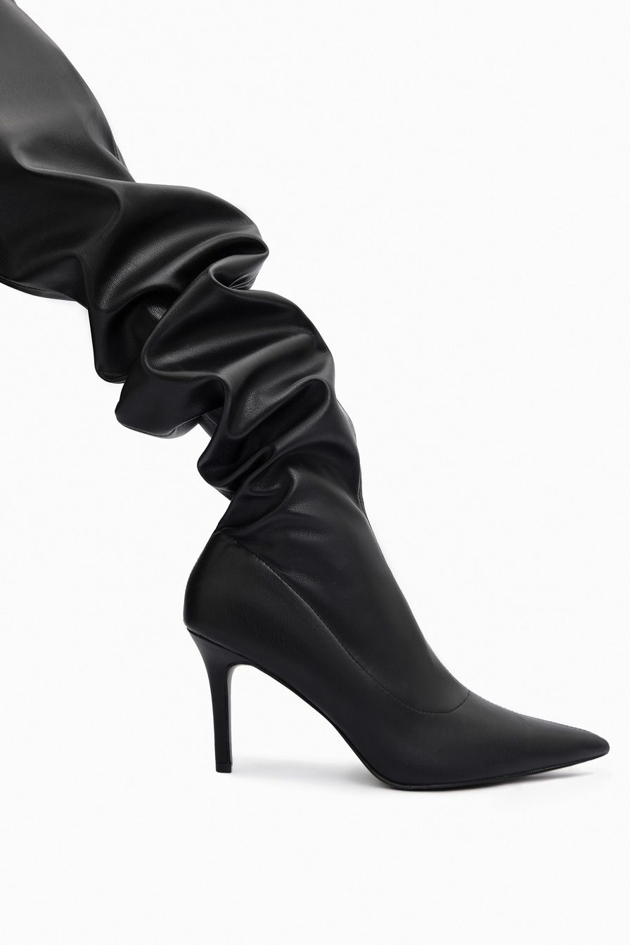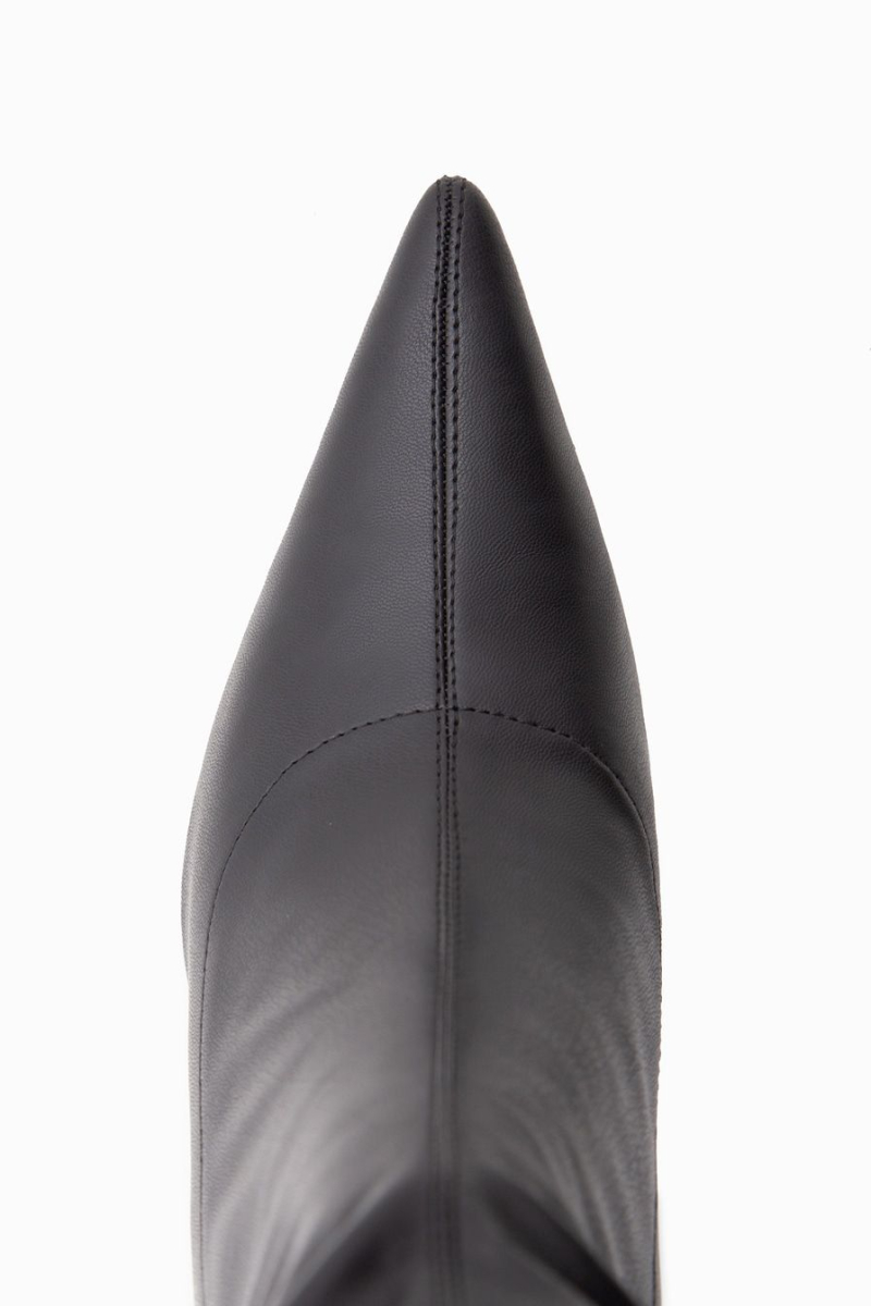 Черные ботфорты из стрейча – мягкого, эластичного материала кожаной фактуры, который хорошо растягивается и принимает форму ноги. Модель с острым мысом дополнена высоким каблуком и мягкой байковой подкладкой.