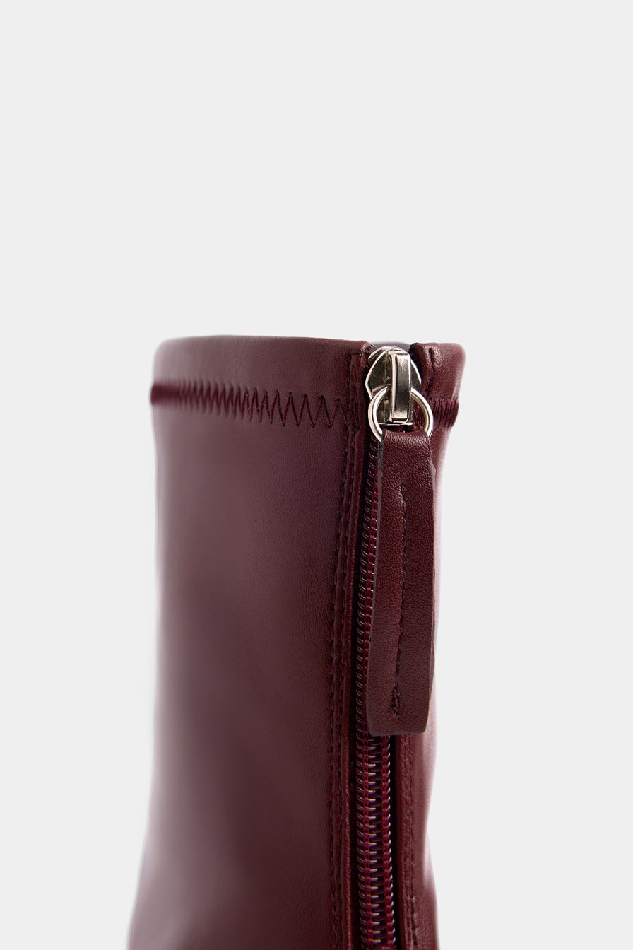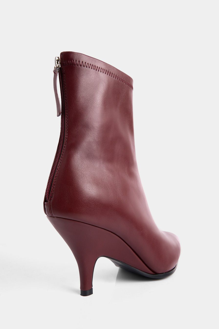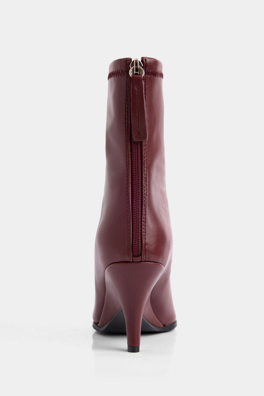 Бордовые ботильоны выполнены из стрейча – мягкого, эластичного материала кожаной фактуры, который хорошо растягивается и принимает форму ноги. Модель с острым мысом дополнена высоким каблуком, застежкой-молнией и мягкой байковой подкладкой.