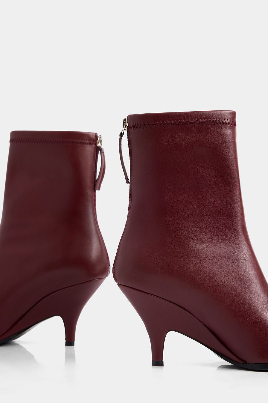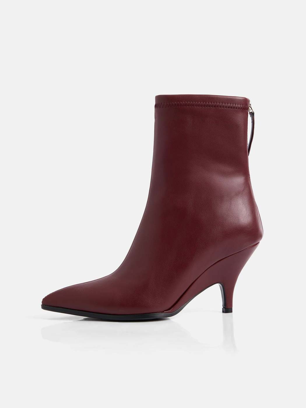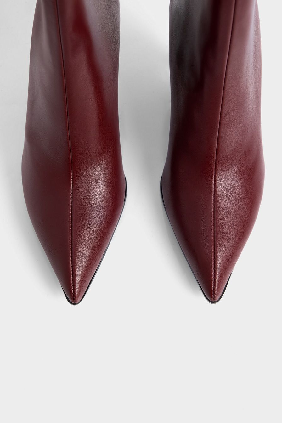 Бордовые ботильоны выполнены из стрейча – мягкого, эластичного материала кожаной фактуры, который хорошо растягивается и принимает форму ноги. Модель с острым мысом дополнена высоким каблуком, застежкой-молнией и мягкой байковой подкладкой.