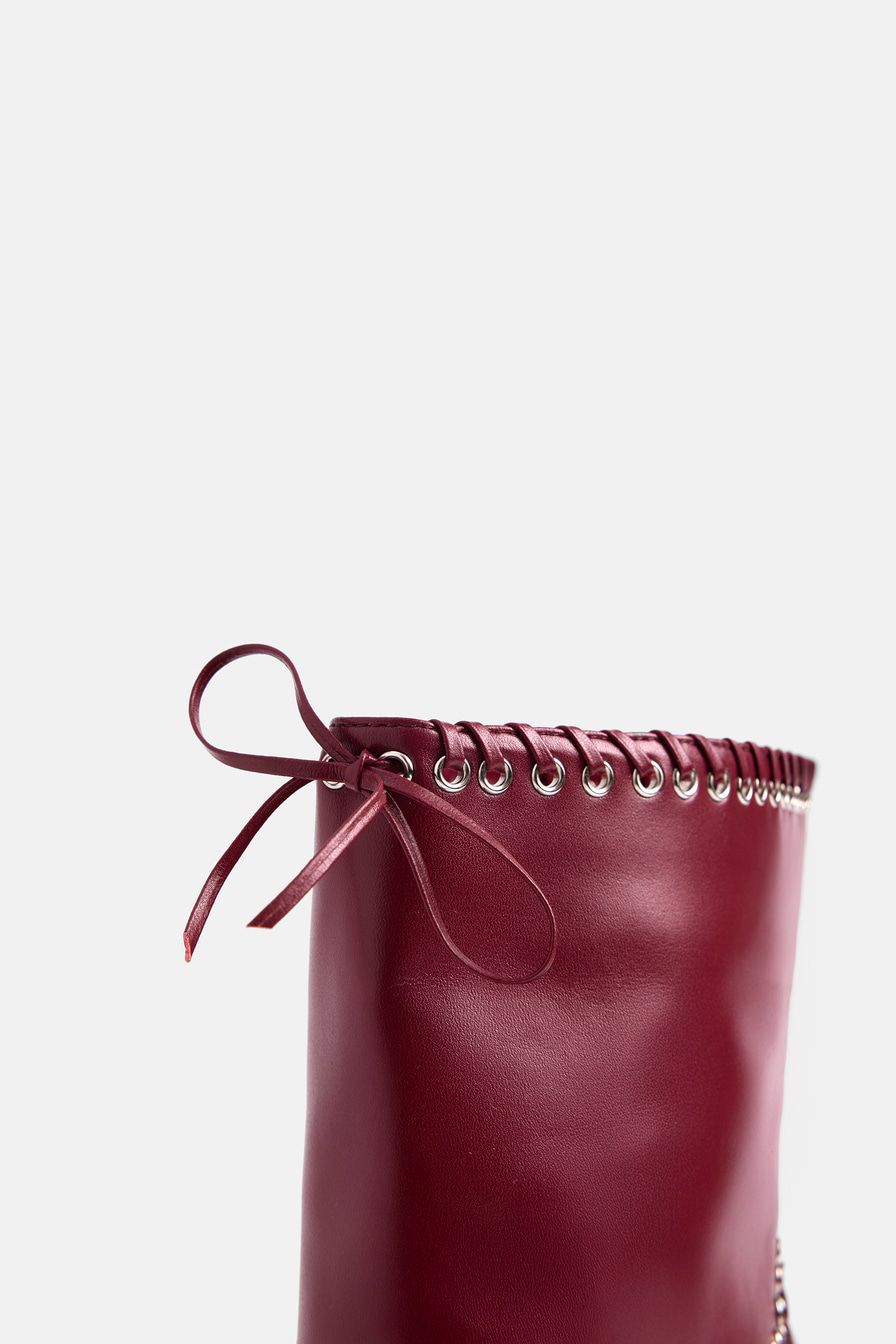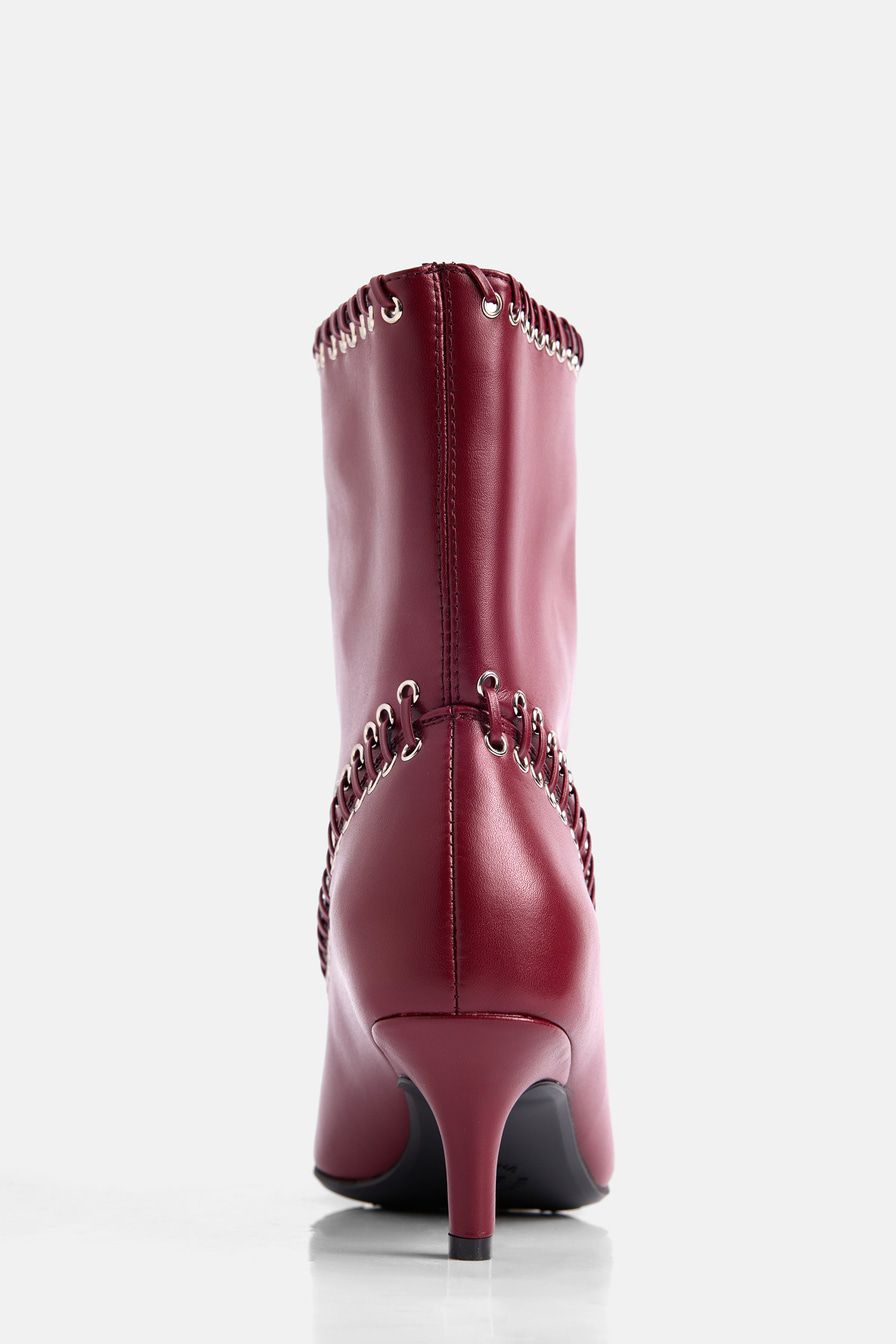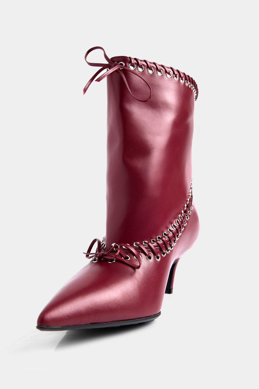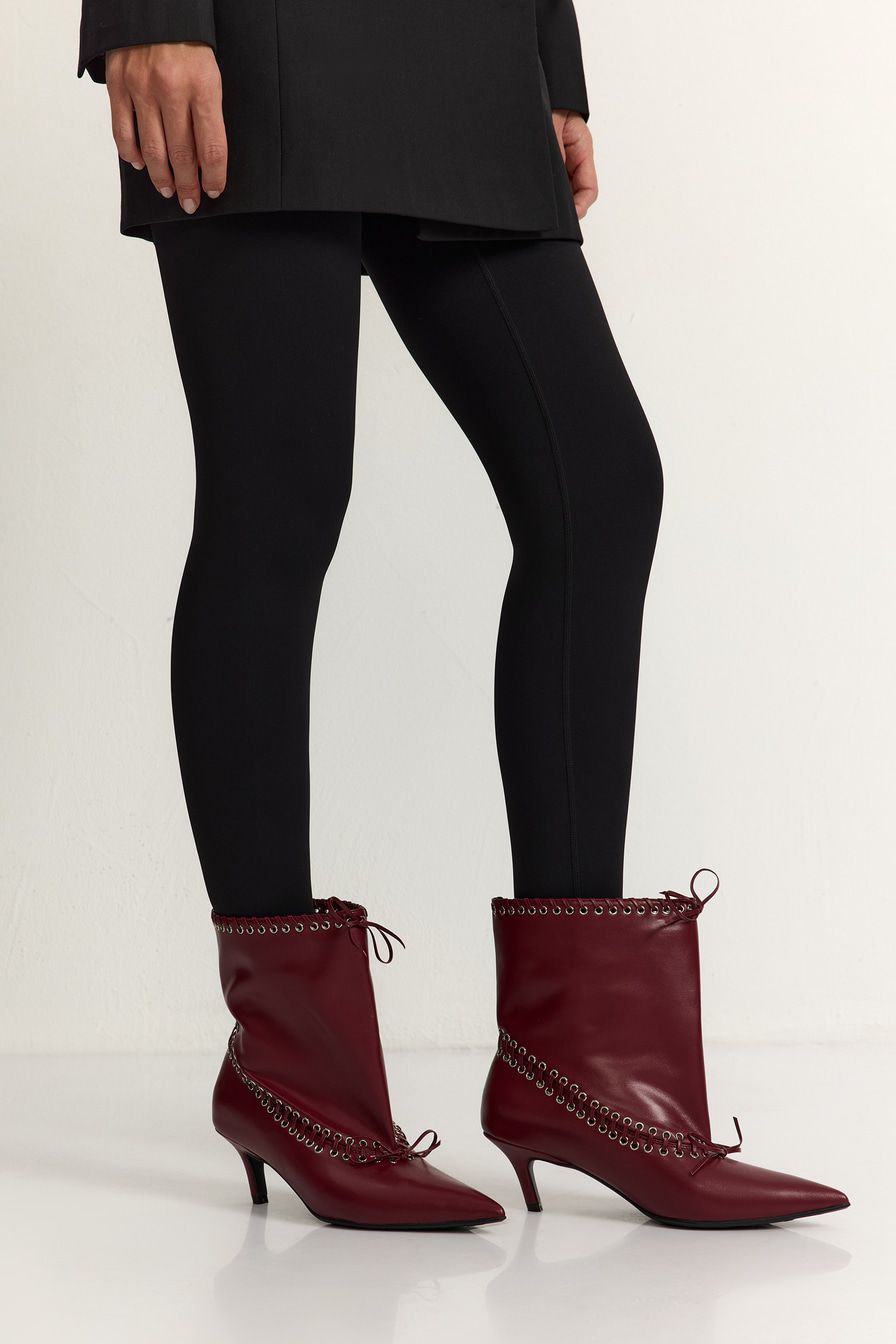 Бордовые ботильоны со свободным голенищем выполнены из микрофибры – высокопрочного заменителя натуральной кожи на основе микроволокон. Ботильоны декорированы люверсами и шнуровкой.