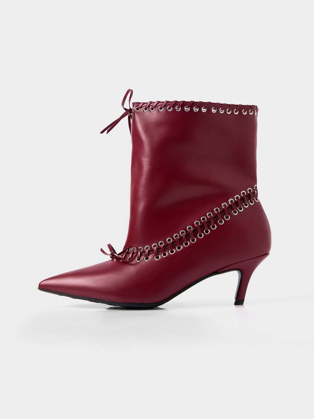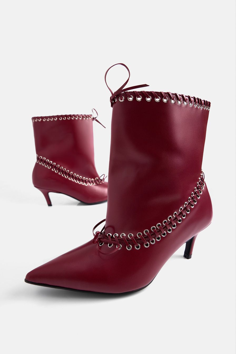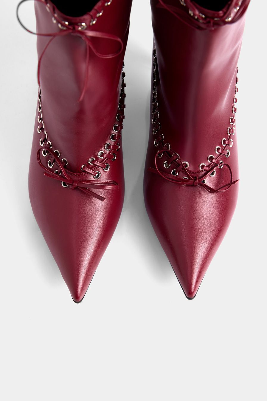 Бордовые ботильоны со свободным голенищем выполнены из микрофибры – высокопрочного заменителя натуральной кожи на основе микроволокон. Ботильоны декорированы люверсами и шнуровкой.