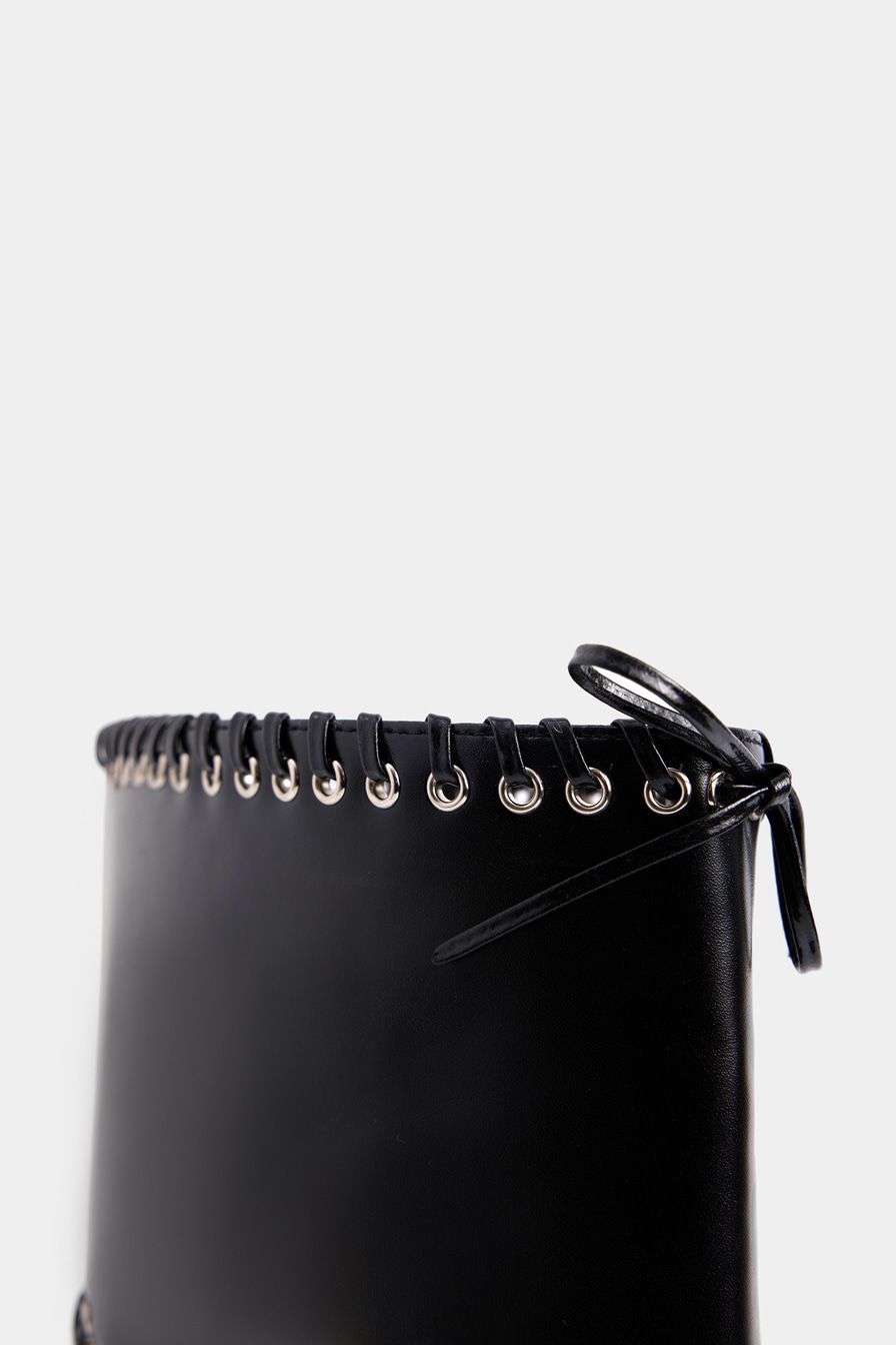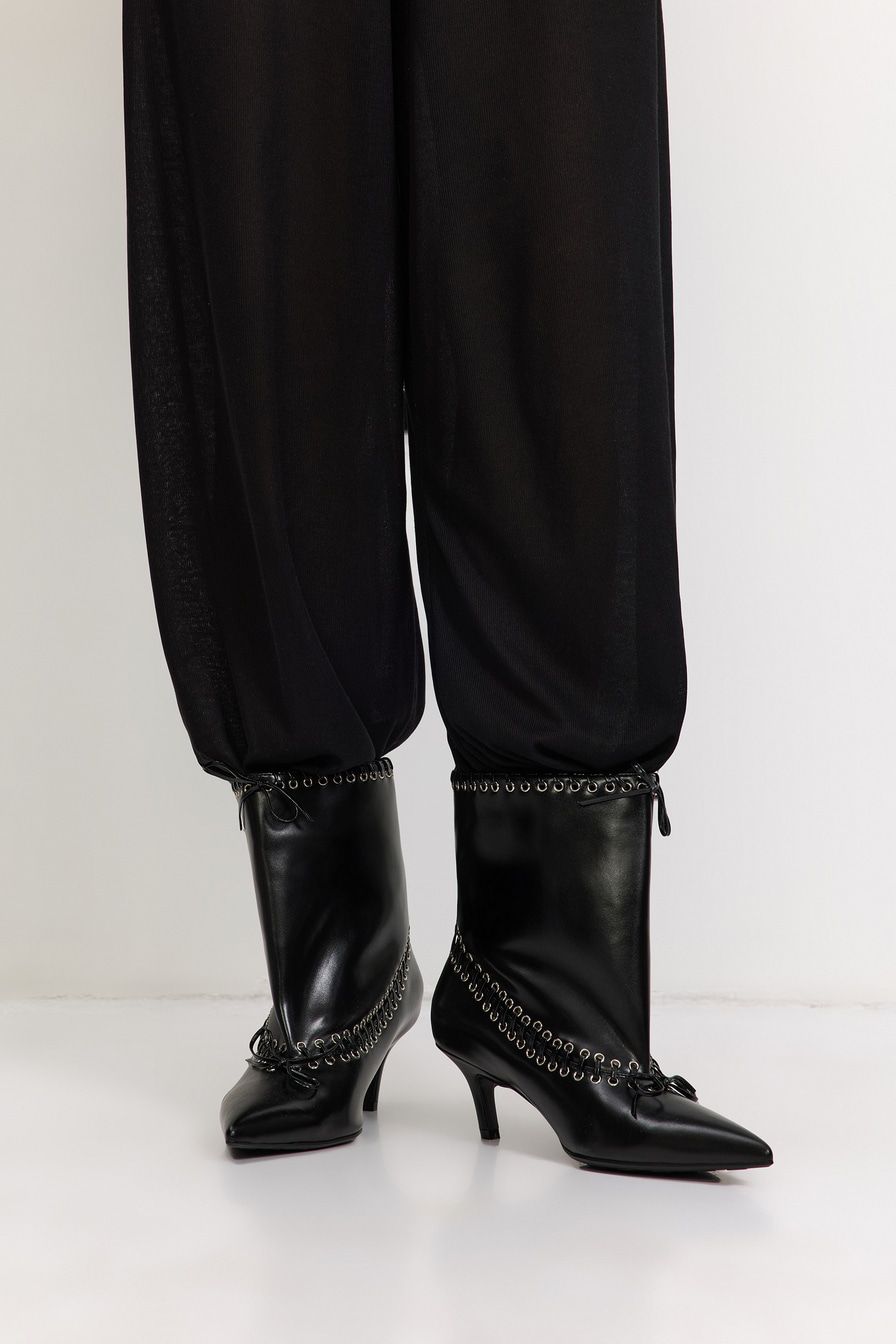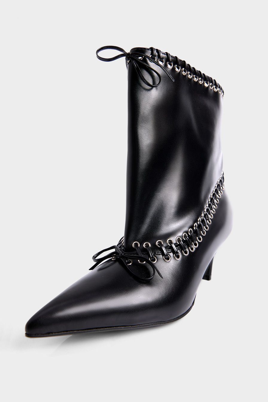 Черные ботильоны со свободным голенищем выполнены из микрофибры – высокопрочного заменителя натуральной кожи на основе микроволокон. Ботильоны декорированы люверсами и шнуровкой.