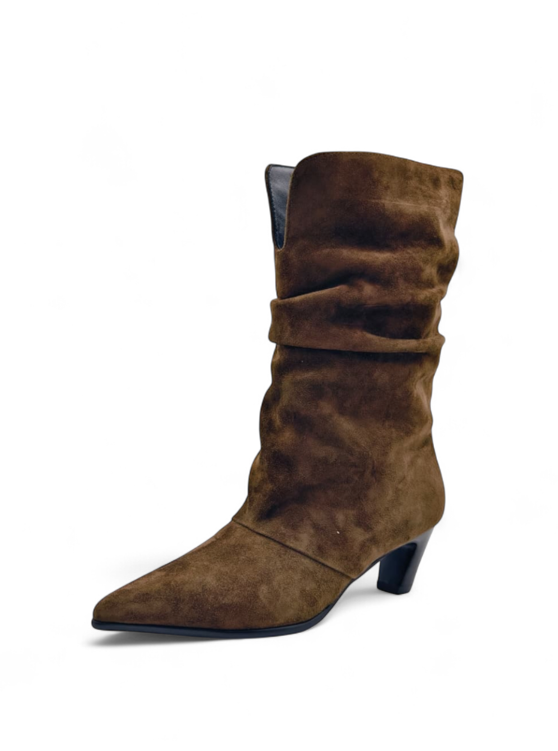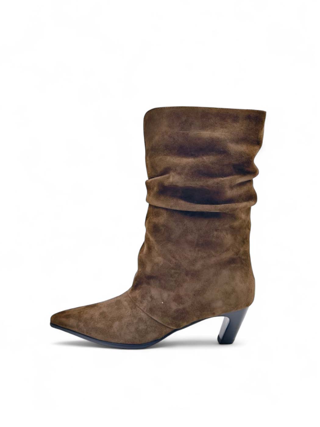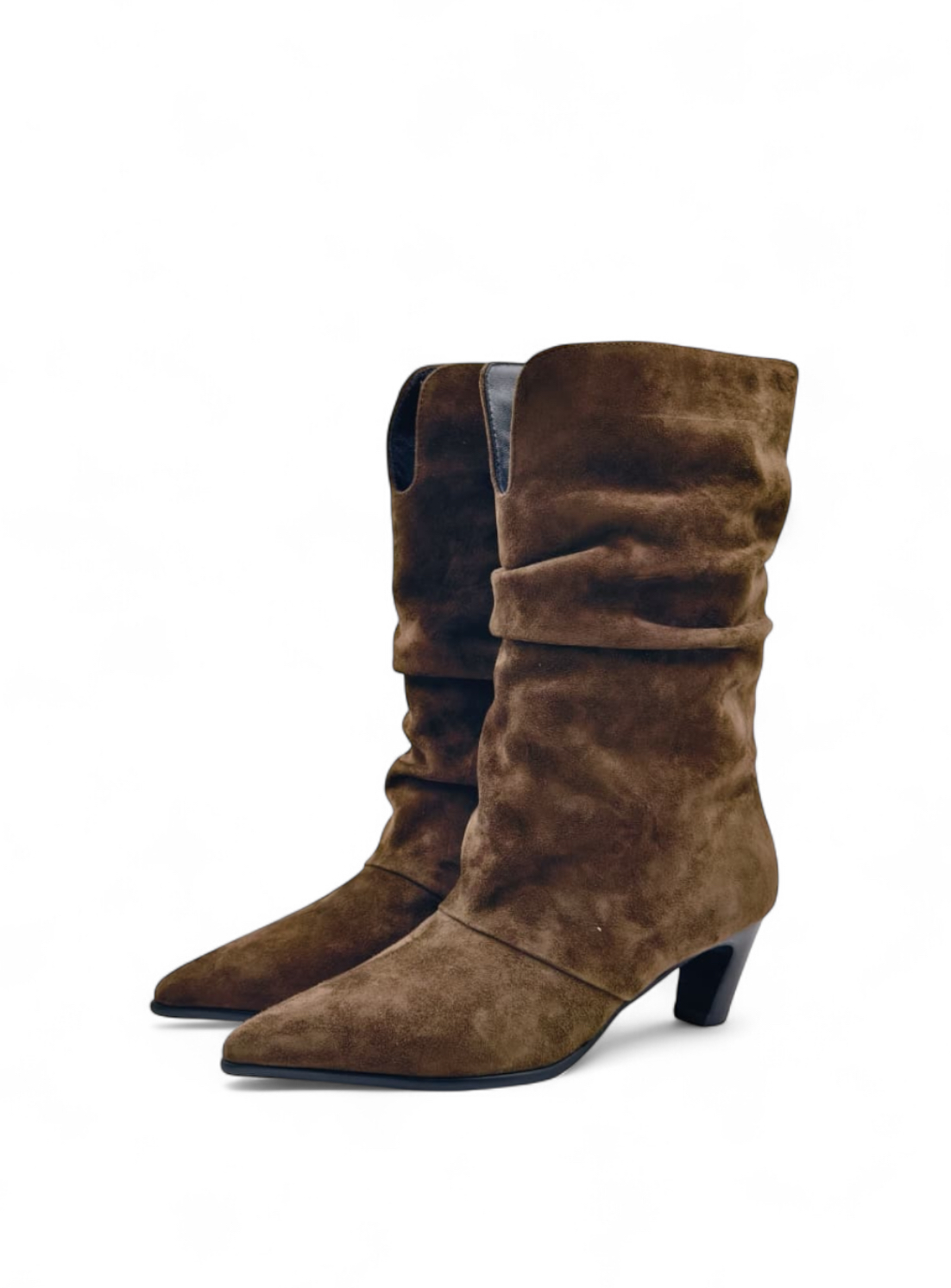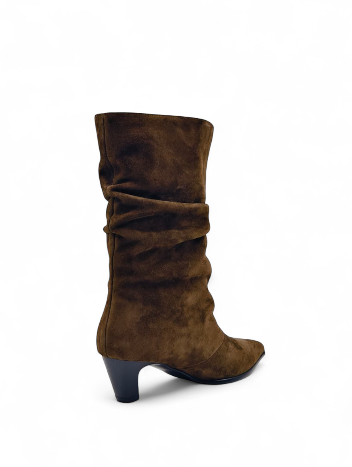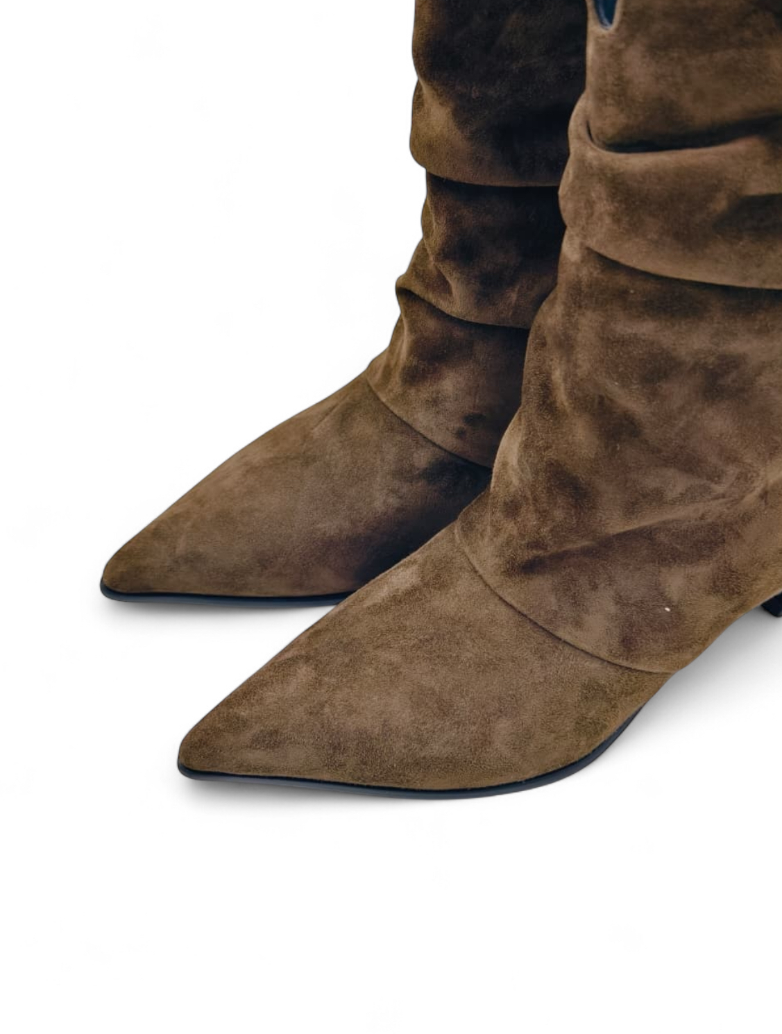 Сапоги из натуральной замши на небольшом каблуке с драпировкой - идеальный вариант для переменчивой погоды.