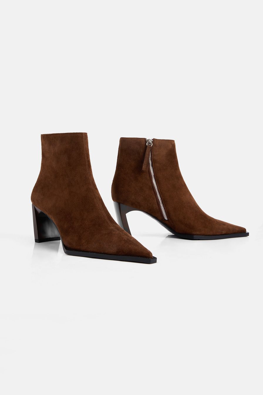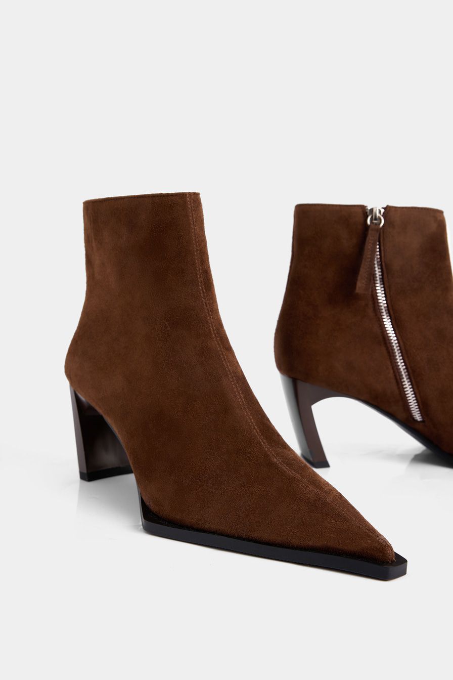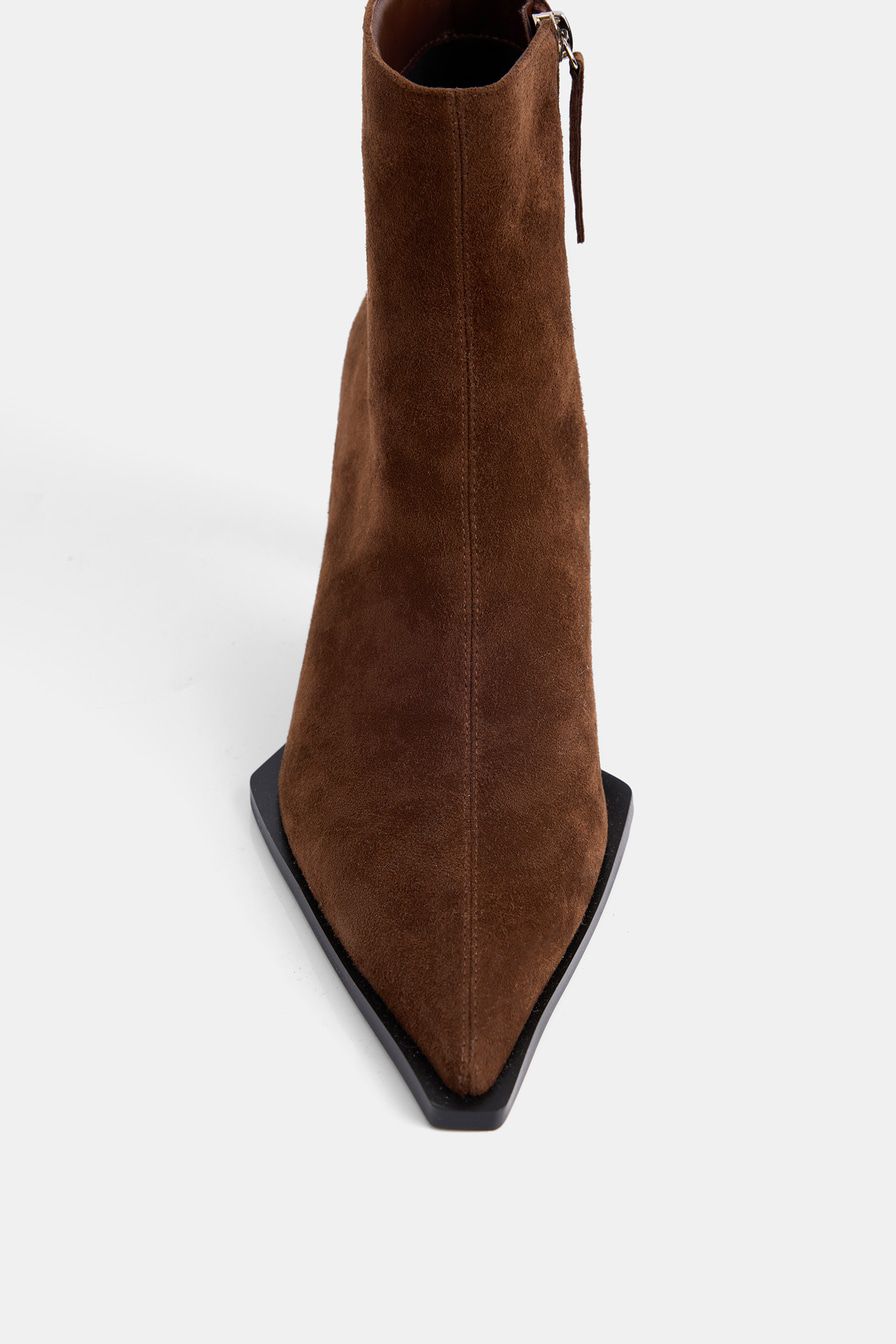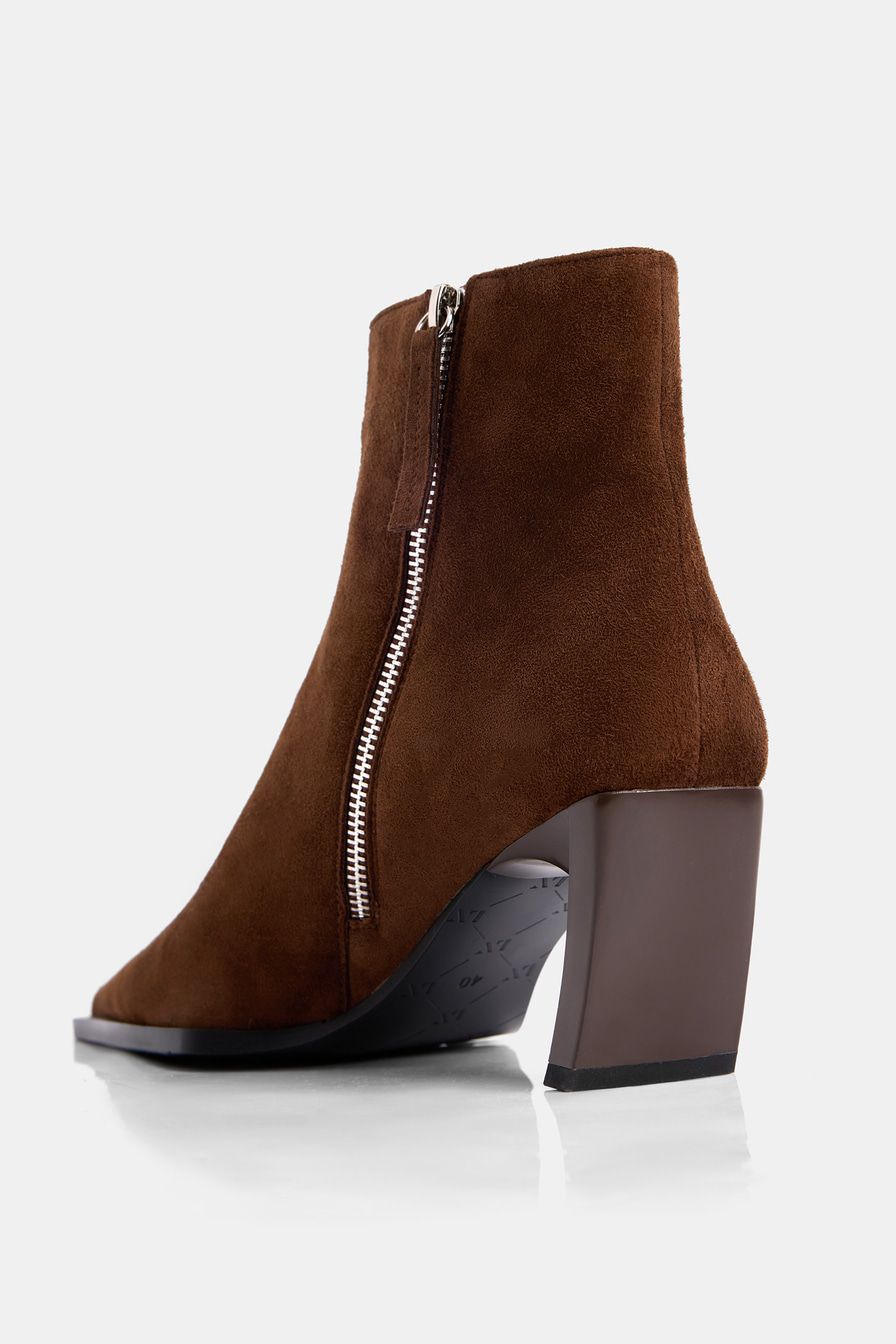 Коричневые ботильоны из натуральной замши – модель с острым мысом. Ботильоны дополнены высоким широким каблуком, застежкой-молнией и мягкой байковой подкладкой.
