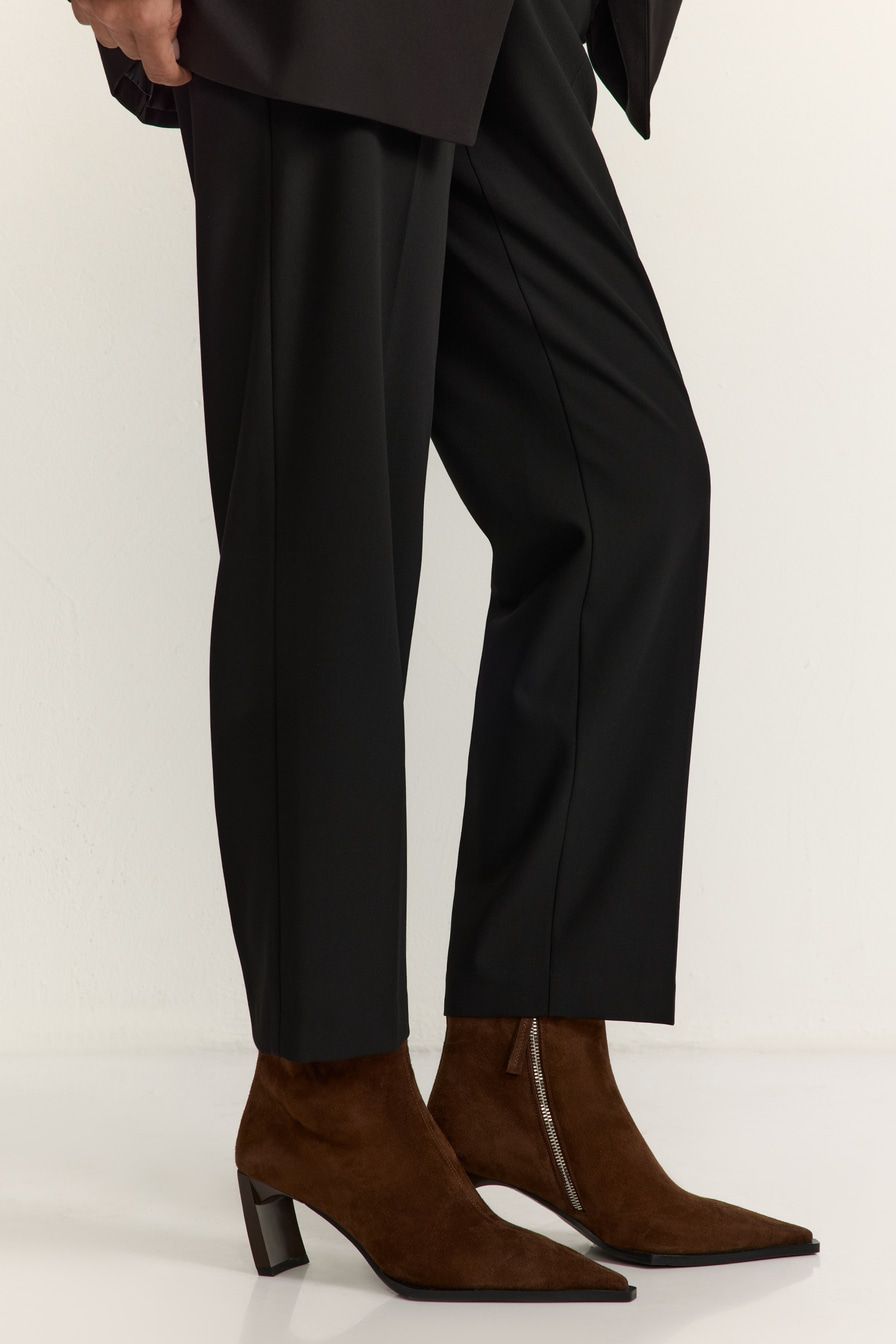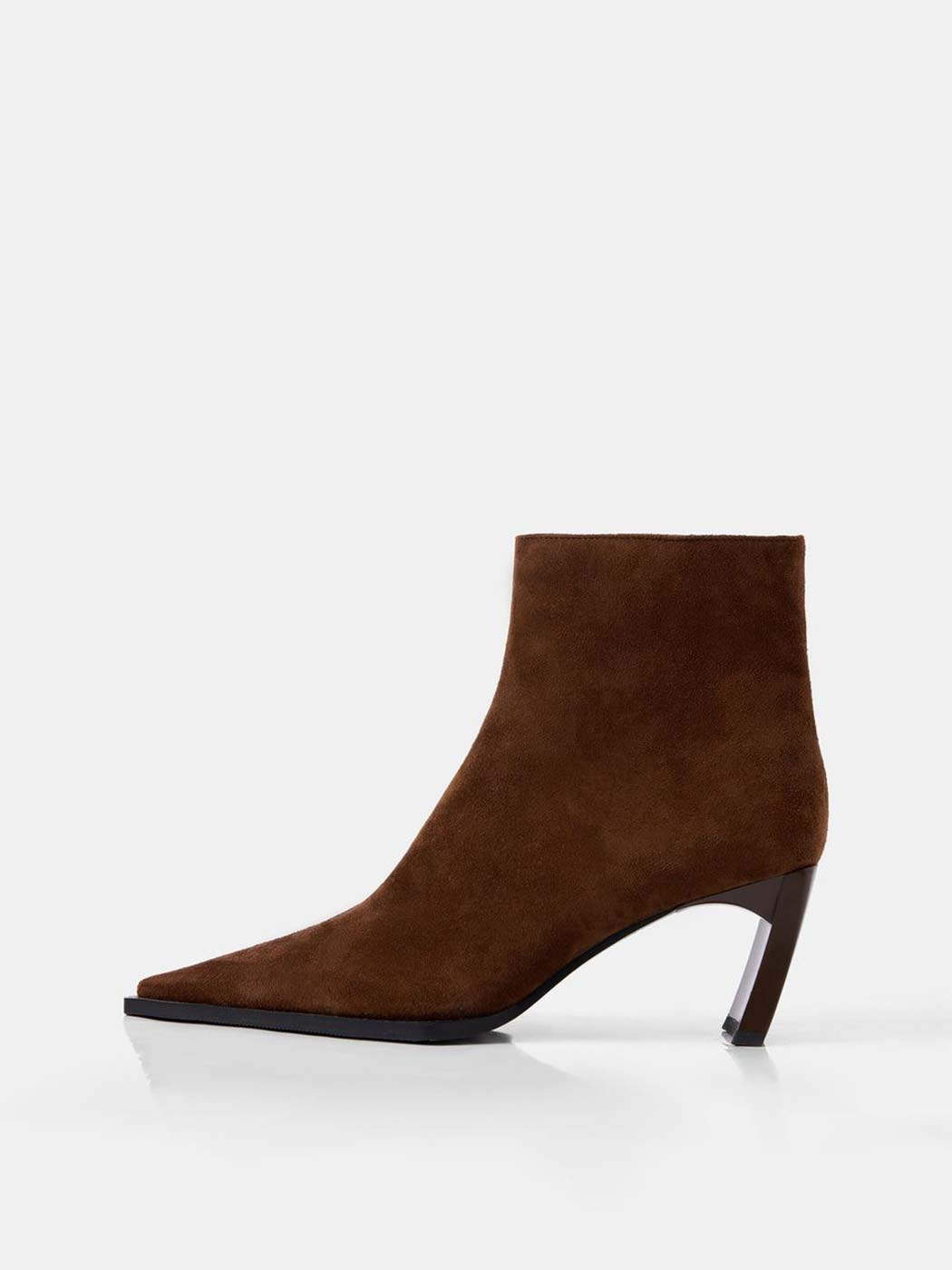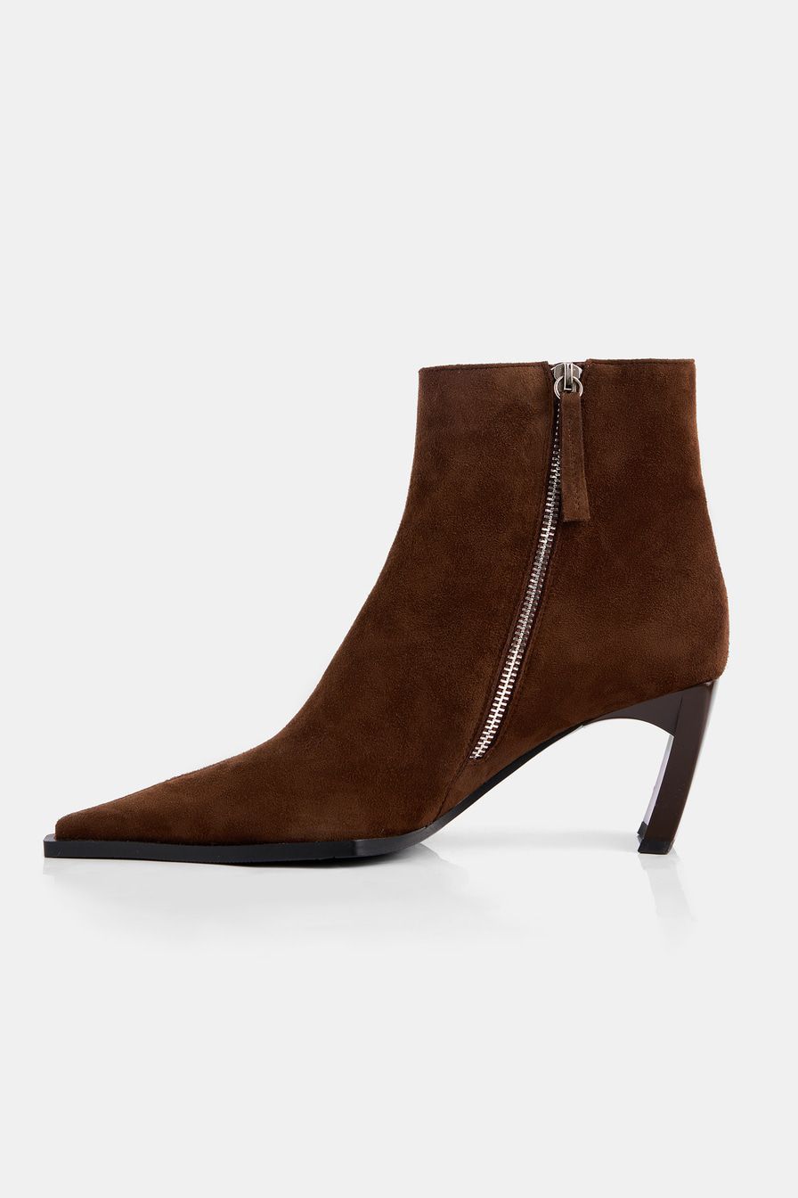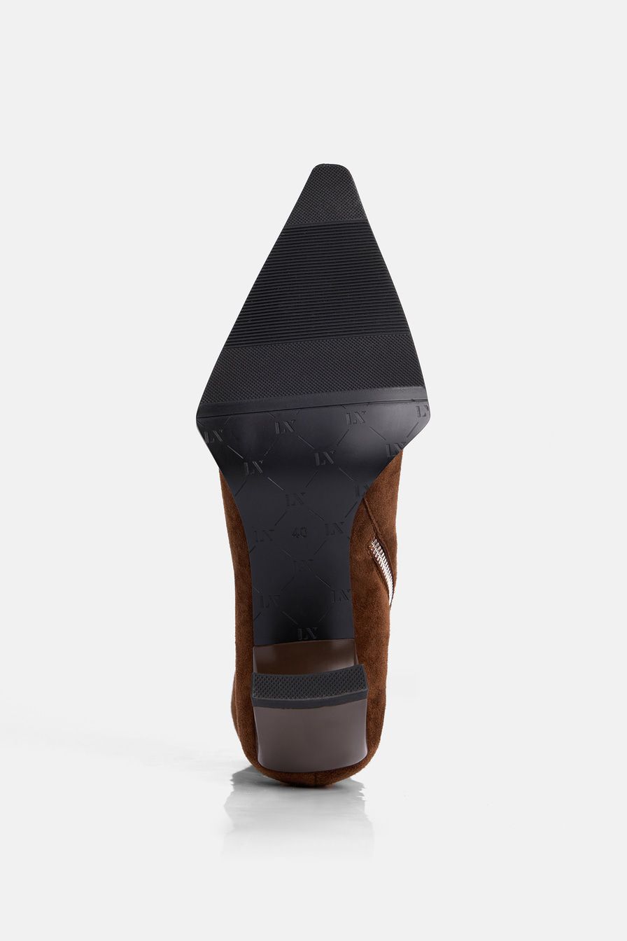 Коричневые ботильоны из натуральной замши – модель с острым мысом. Ботильоны дополнены высоким широким каблуком, застежкой-молнией и мягкой байковой подкладкой.
