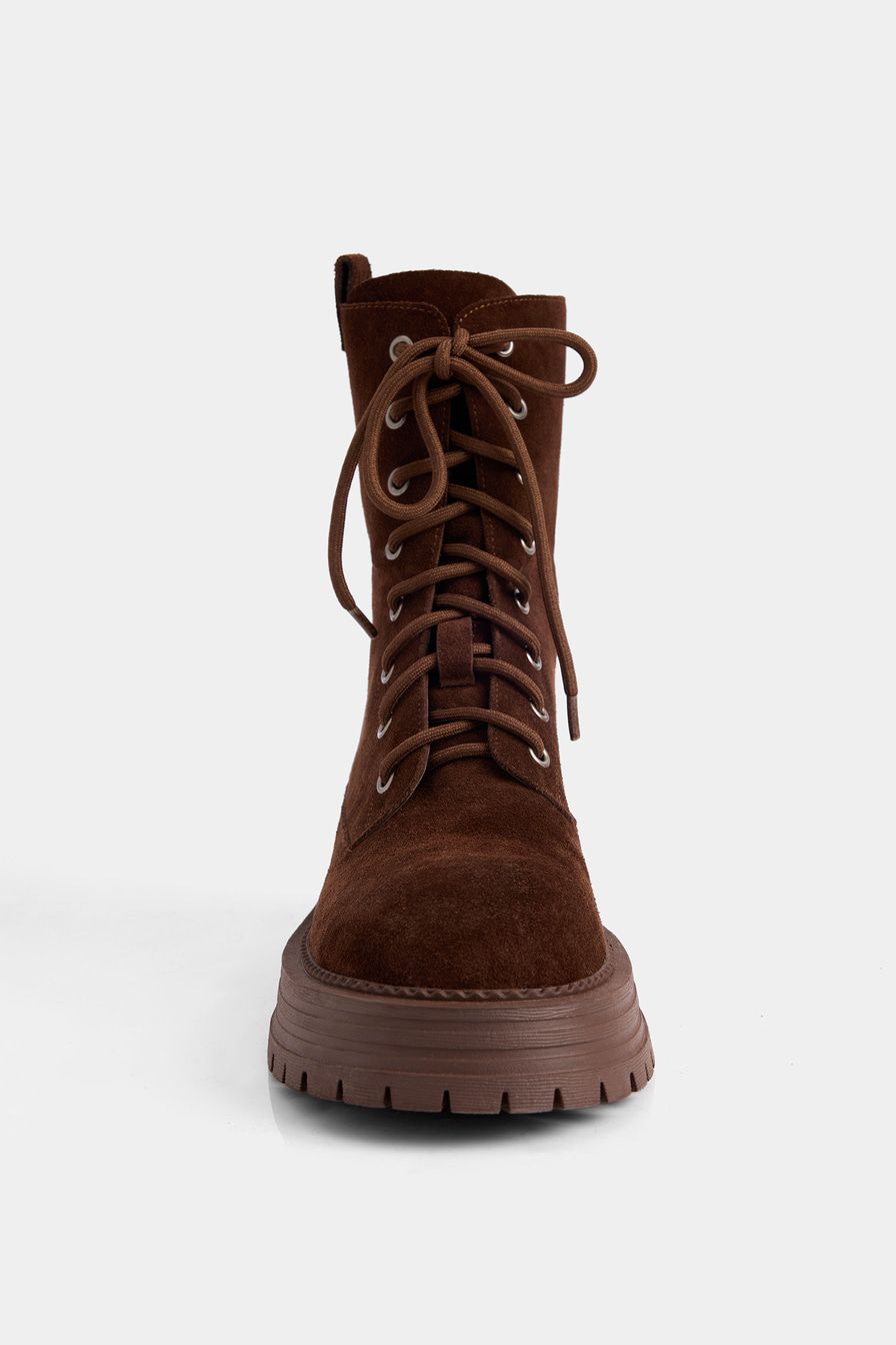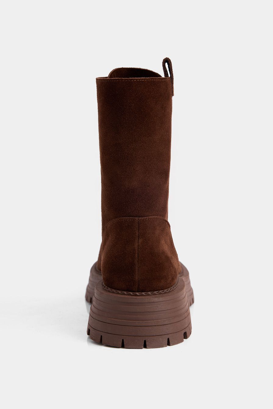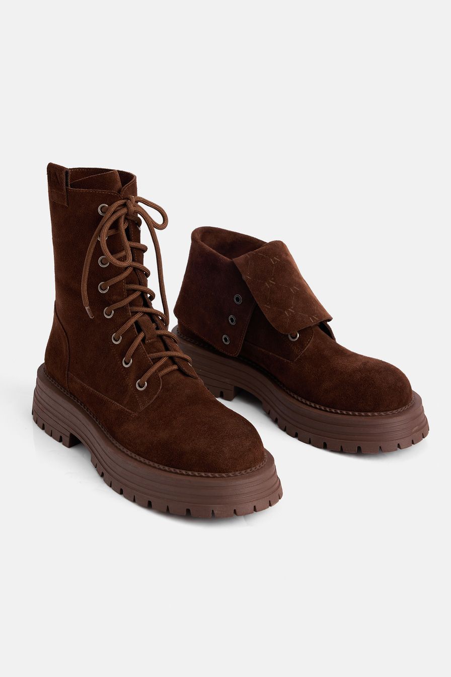 Высокие ботинки коричневого цвета выполнены из натуральной замши, дополнены шнуровкой, массивной платформой и кожаной подкладкой. Ботинки можно носить в застегнутом виде или сделав отворот.