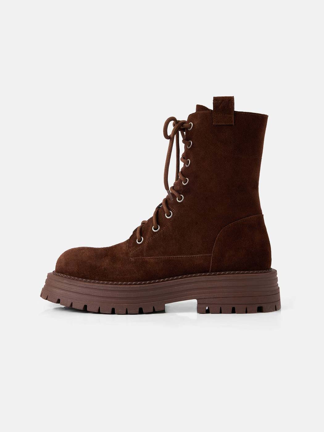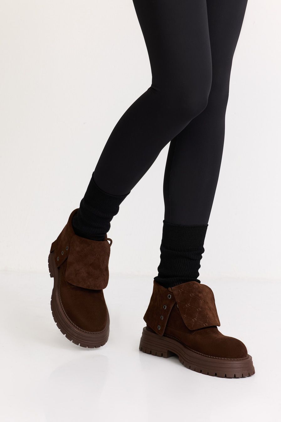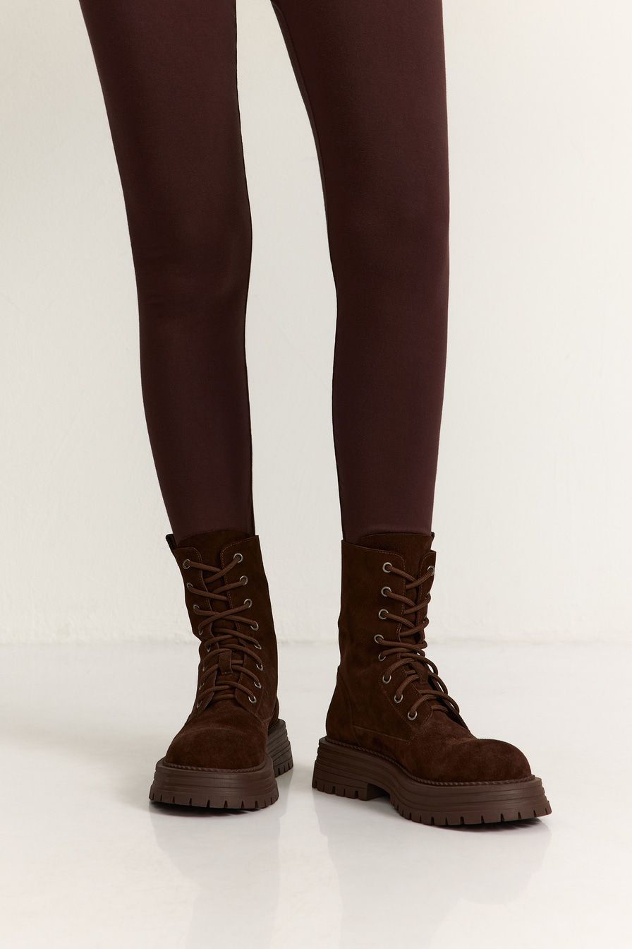 Высокие ботинки коричневого цвета выполнены из натуральной замши, дополнены шнуровкой, массивной платформой и кожаной подкладкой. Ботинки можно носить в застегнутом виде или сделав отворот.