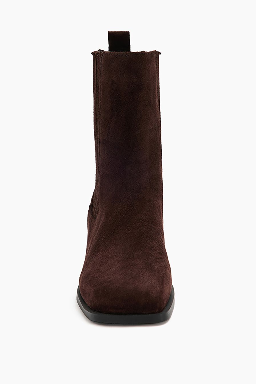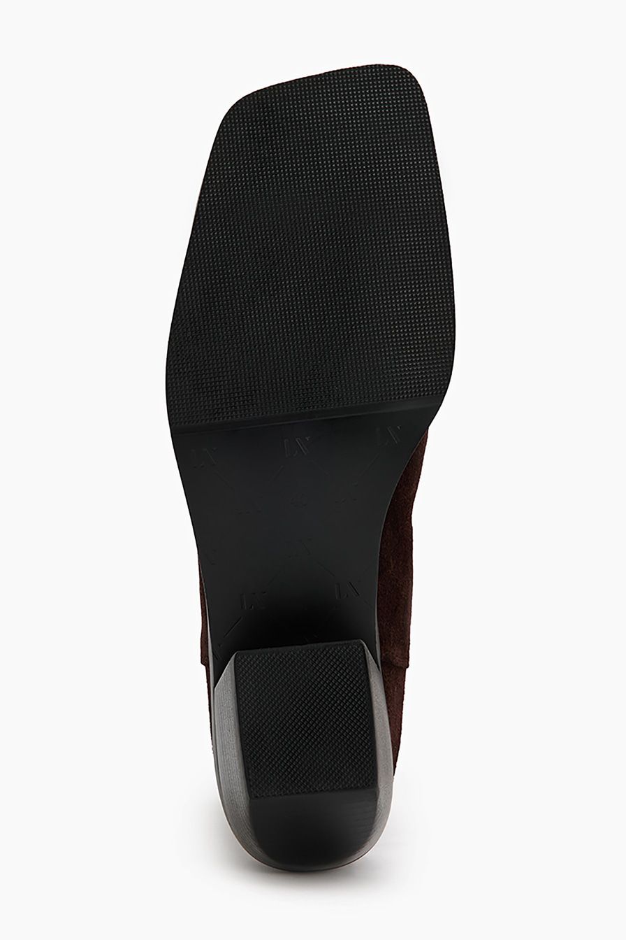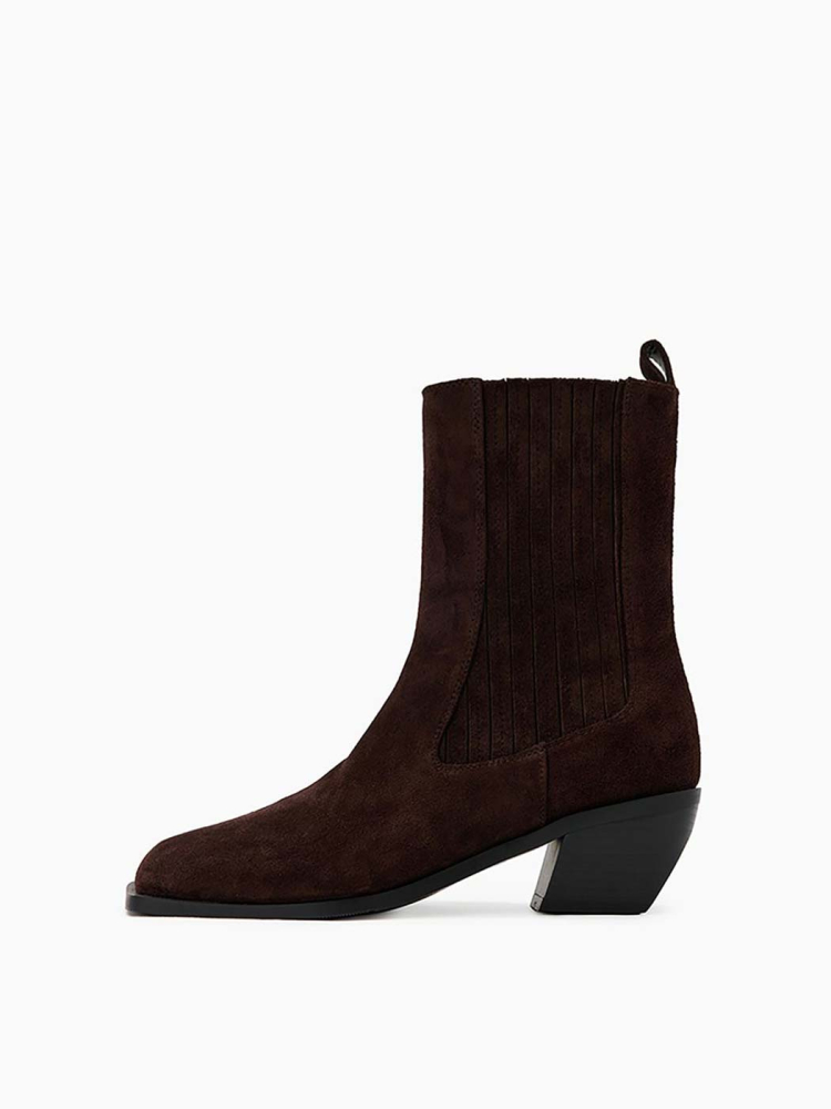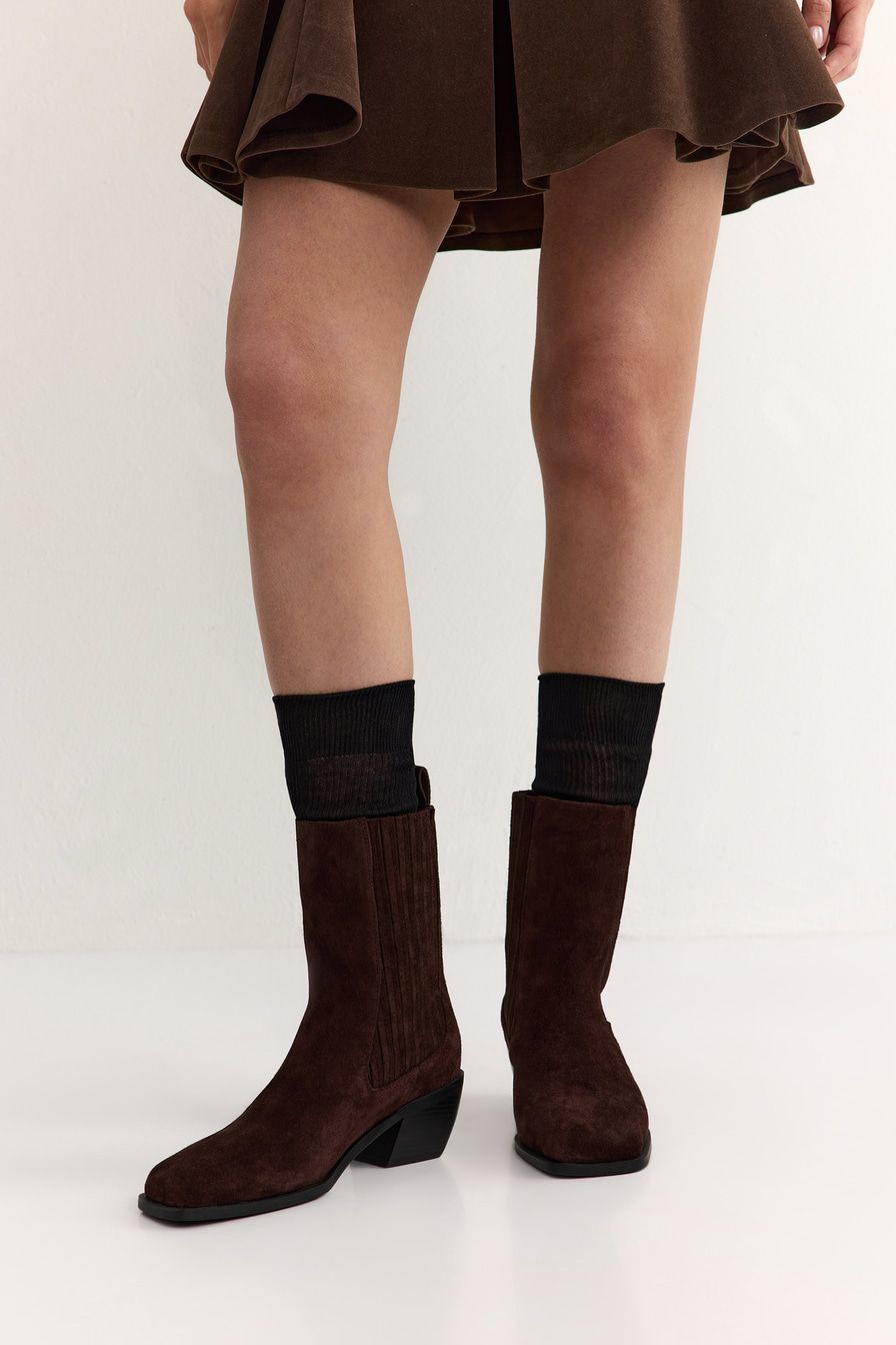 Коричневые ботинки-челси из натуральной замши – модель с квадратным мысом на широком скошенном каблуке. Пара дополнена мягкой байковой подкладкой.