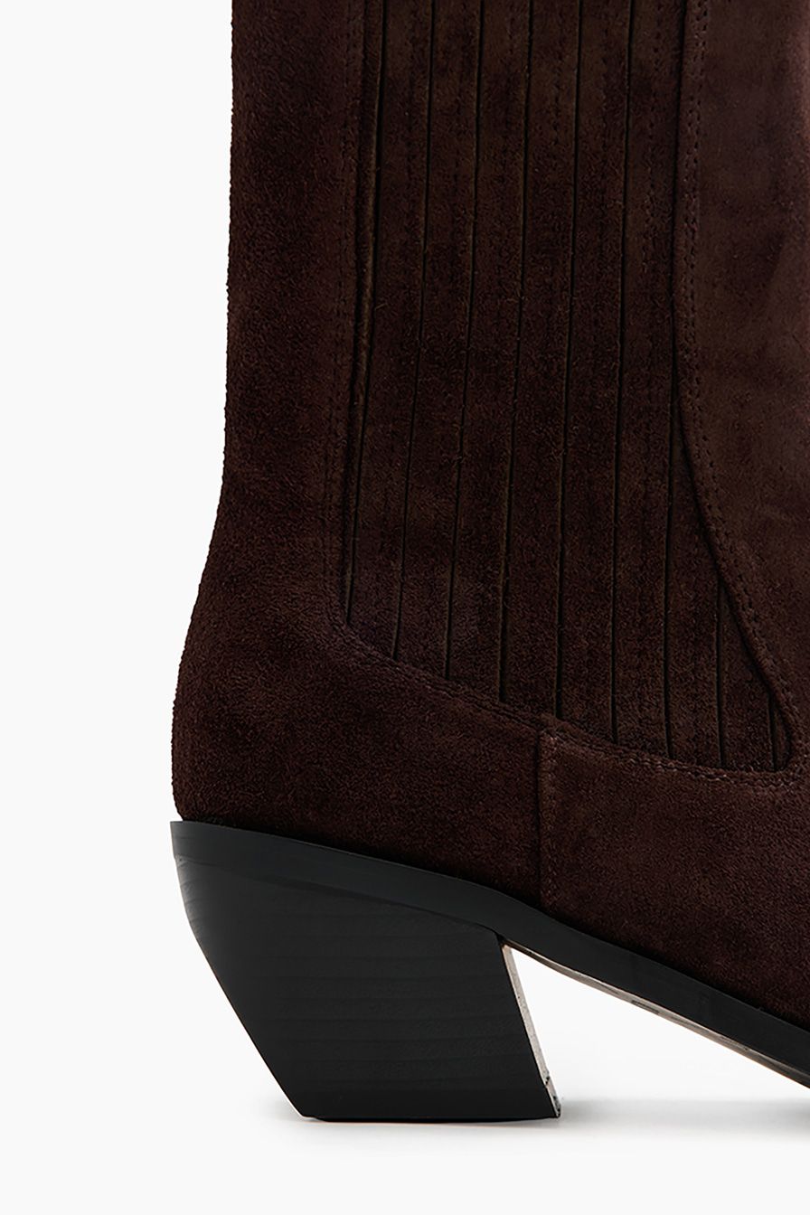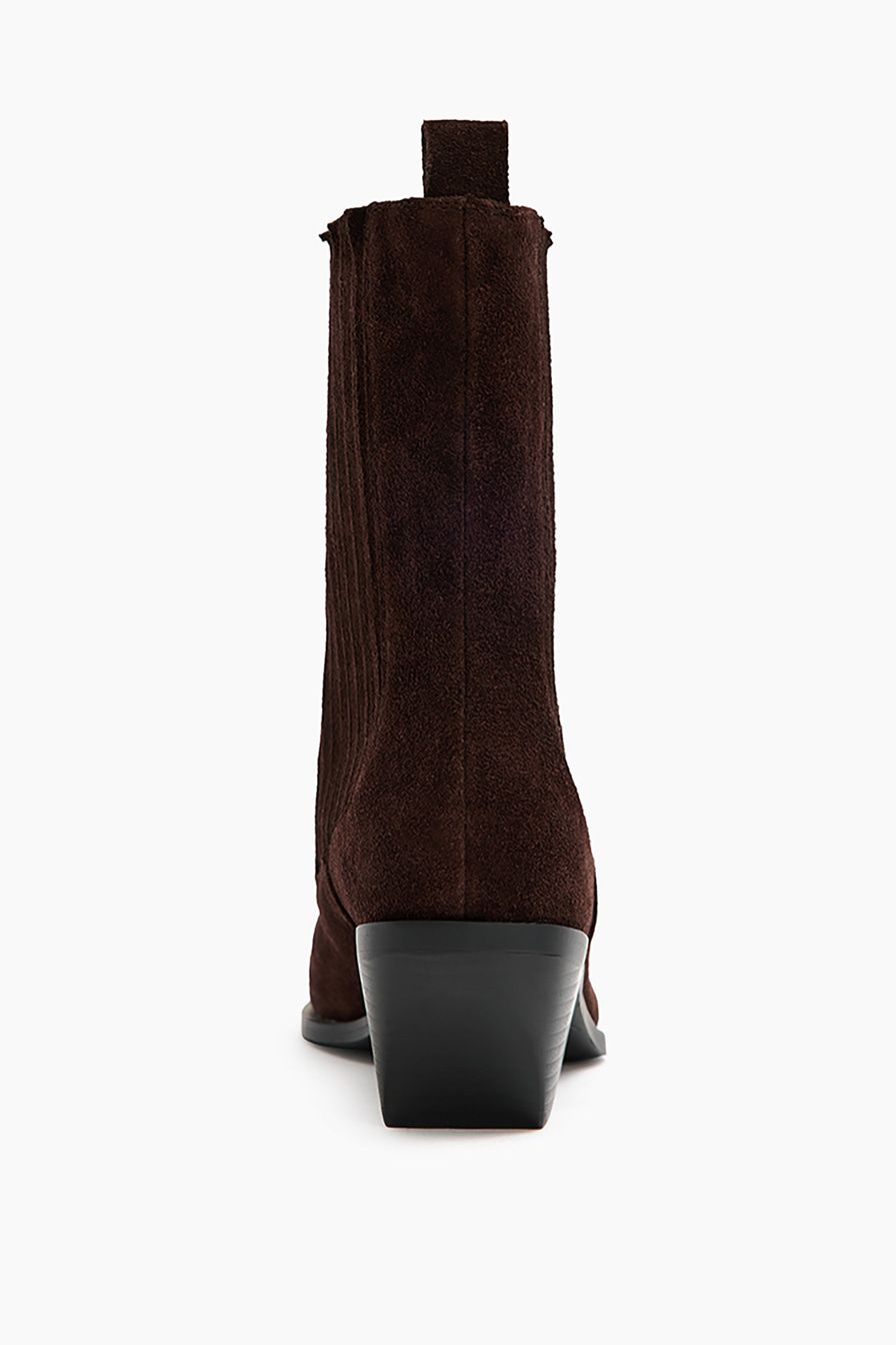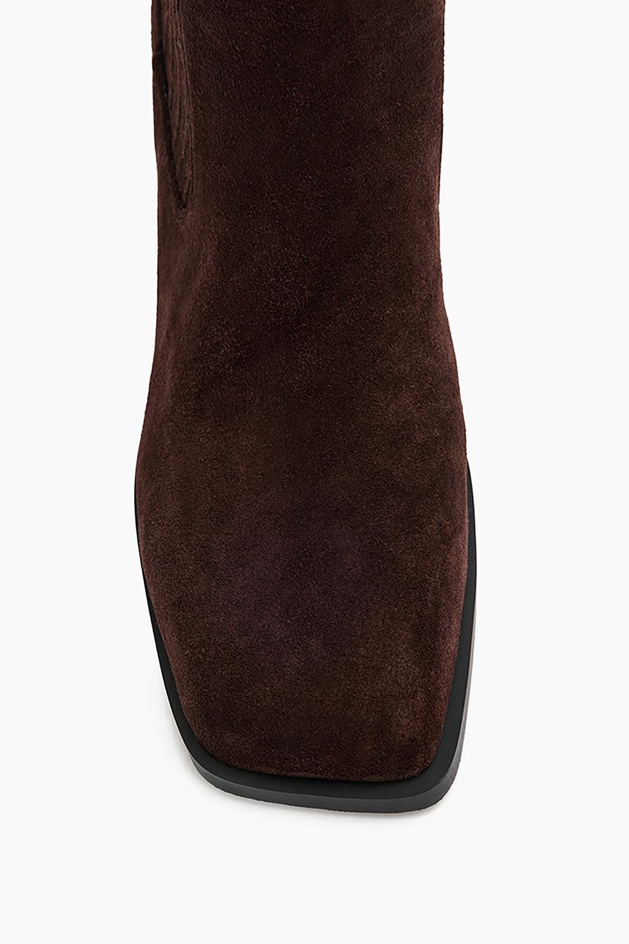Коричневые ботинки-челси из натуральной замши – модель с квадратным мысом на широком скошенном каблуке. Пара дополнена мягкой байковой подкладкой.