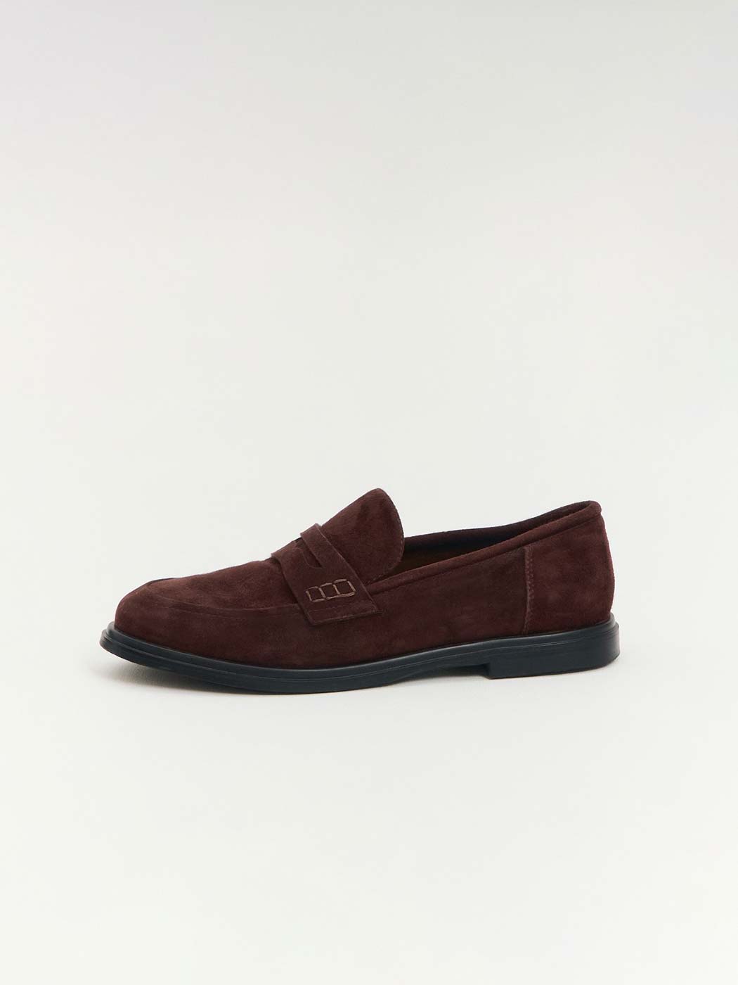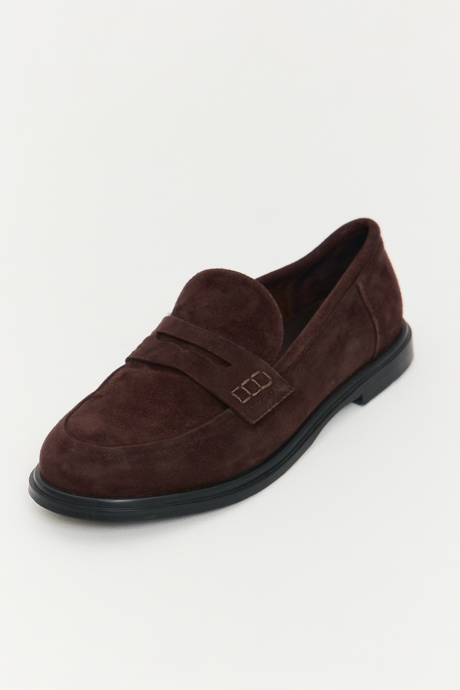 Пенни-лоферы из мягкой натуральной замши. Союзку модели дополнили перемычкой с фигурным вырезом, а округлый мыс подчеркнули рельефным швом. Сочетая в себе удобство и стильный дизайн, лоферы органично дополнят любой повседневный образ.