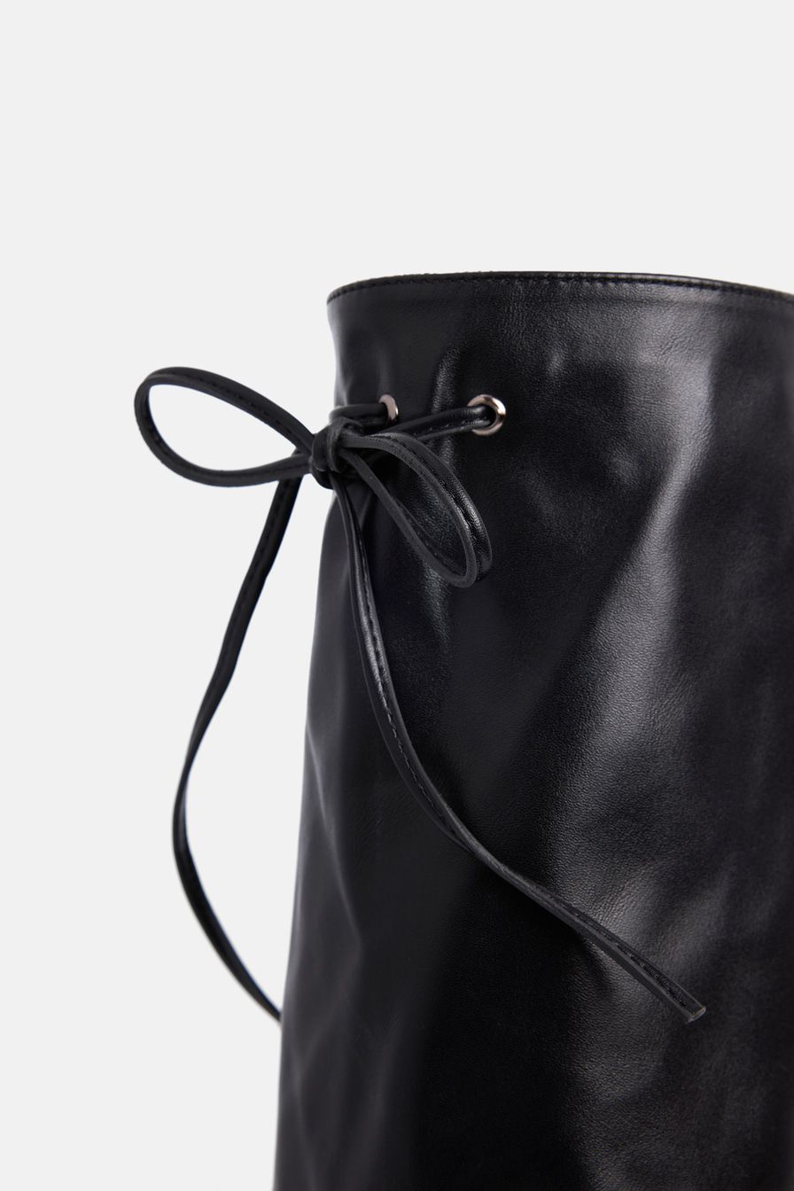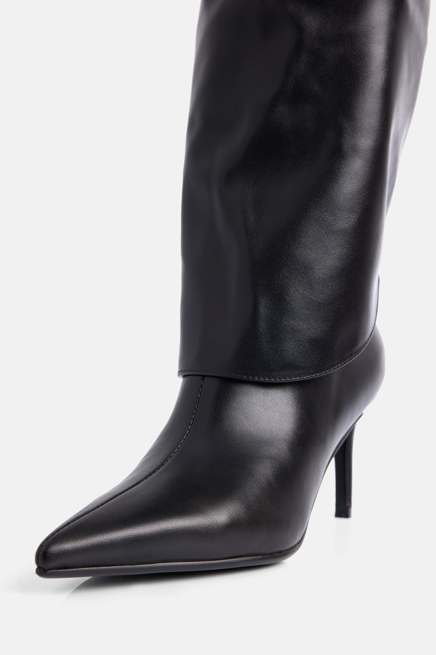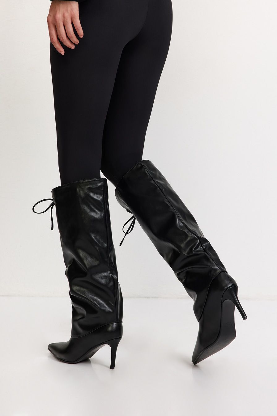 Черные сапоги из экокожи – модель с острым мысом на высоком каблуке. Широкое голенище можно выпрямить или спустить, превратив пару в полусапоги с напуском.