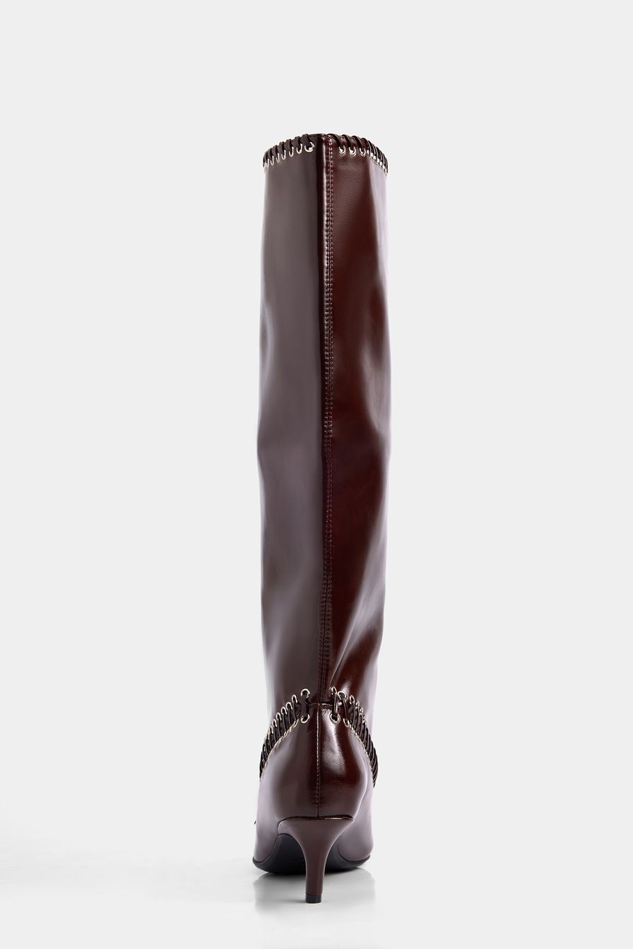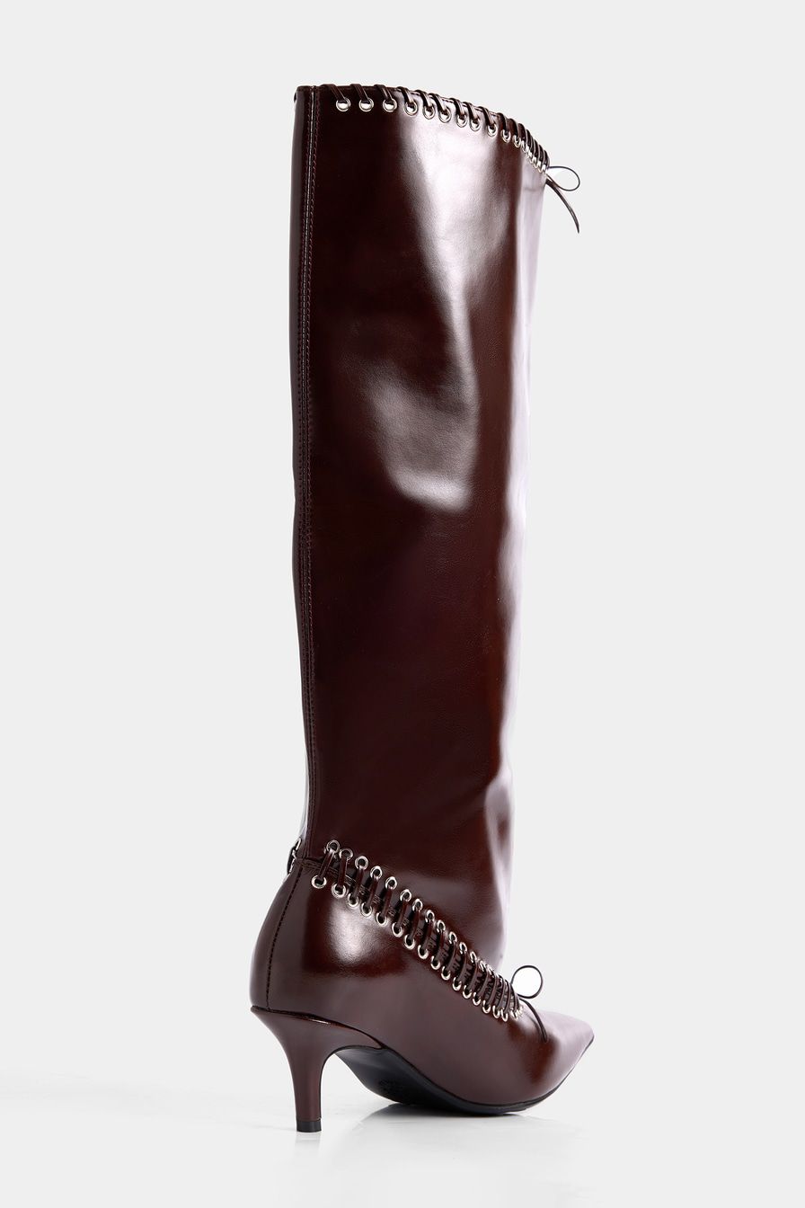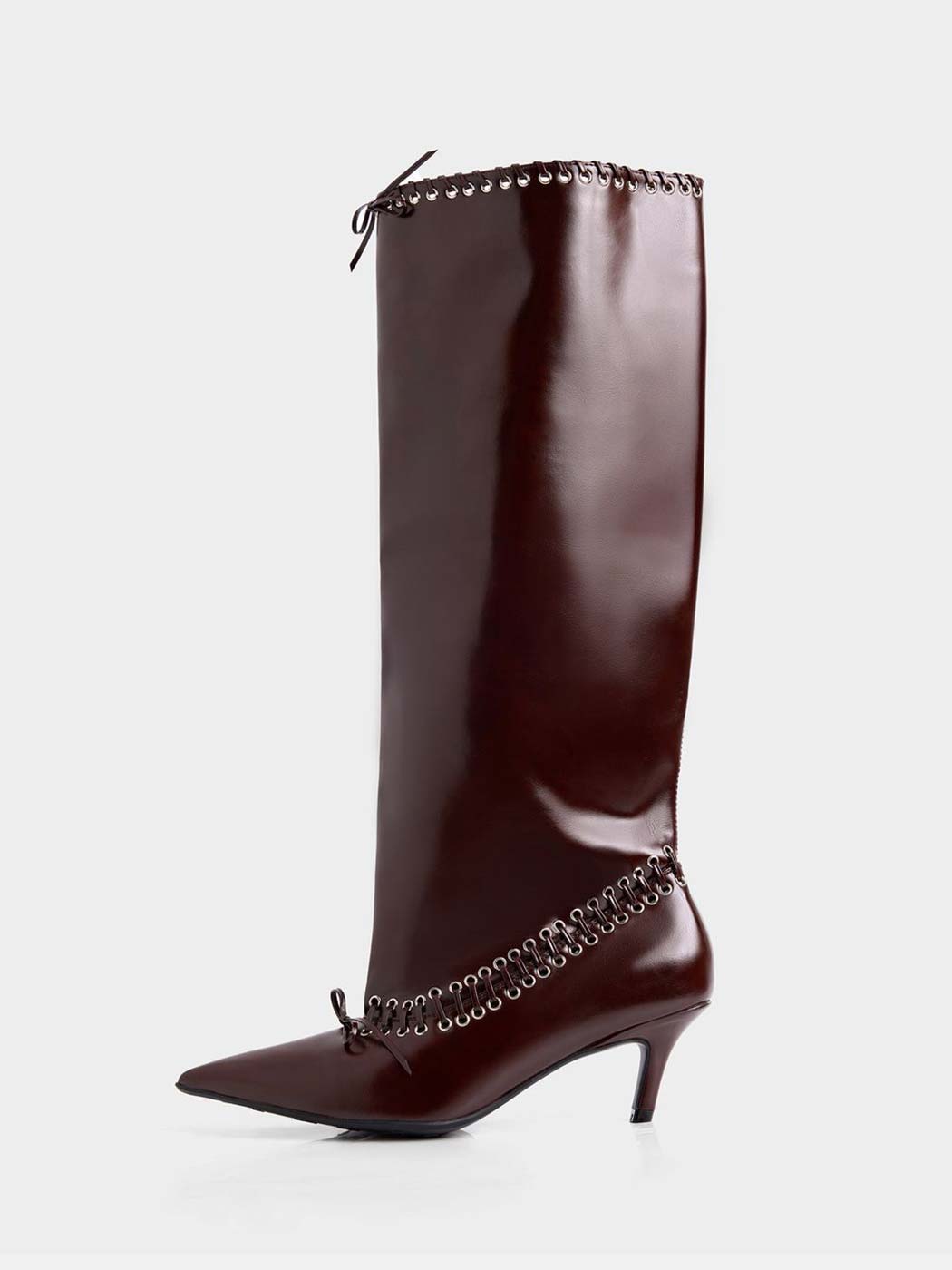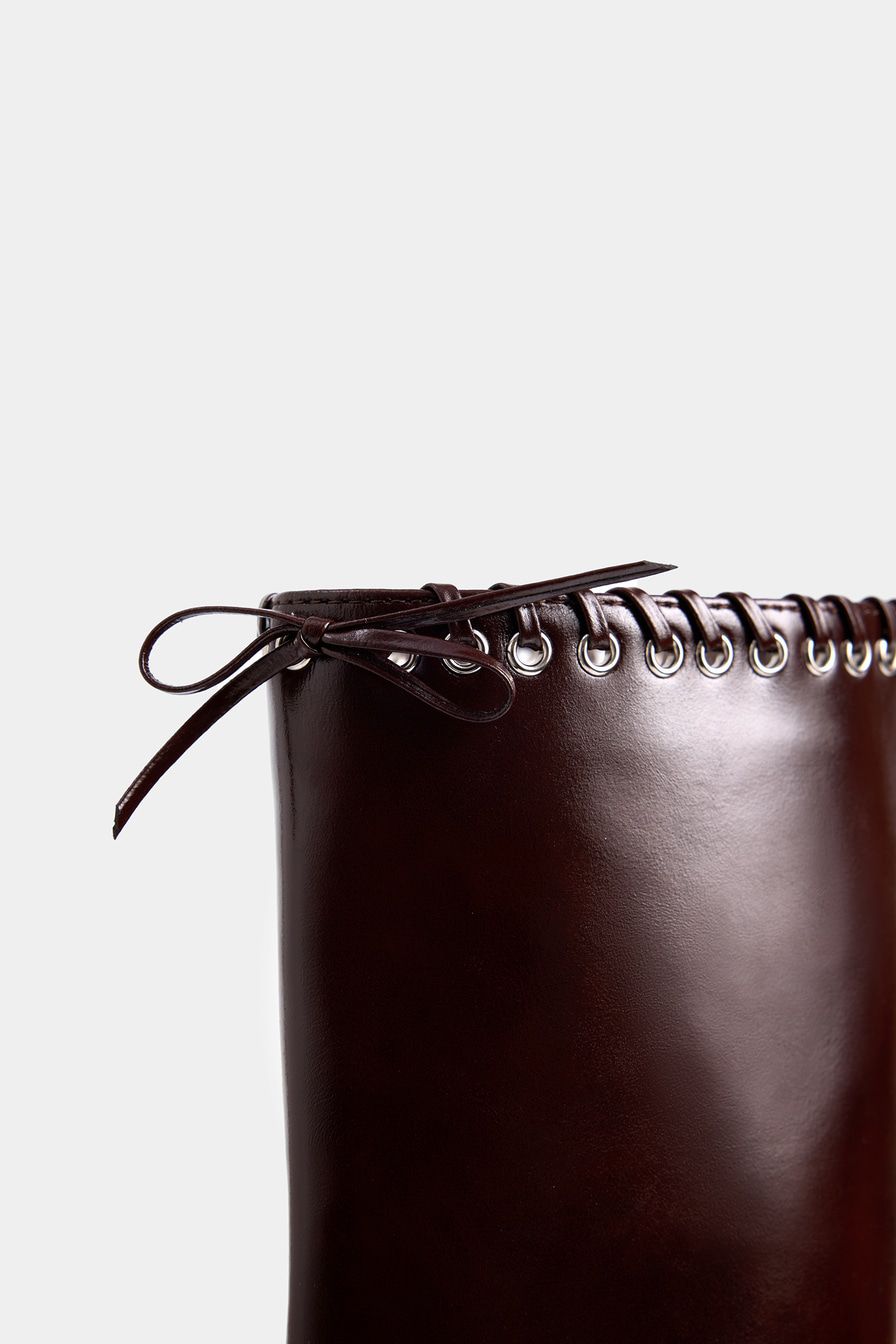 Высокие темно-коричневые сапоги со свободным голенищем выполнены из микрофибры – высокопрочного заменителя натуральной кожи на основе микроволокон. Сапоги декорированы люверсами и шнуровкой.