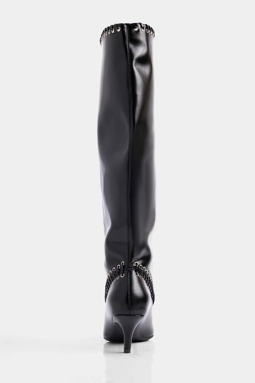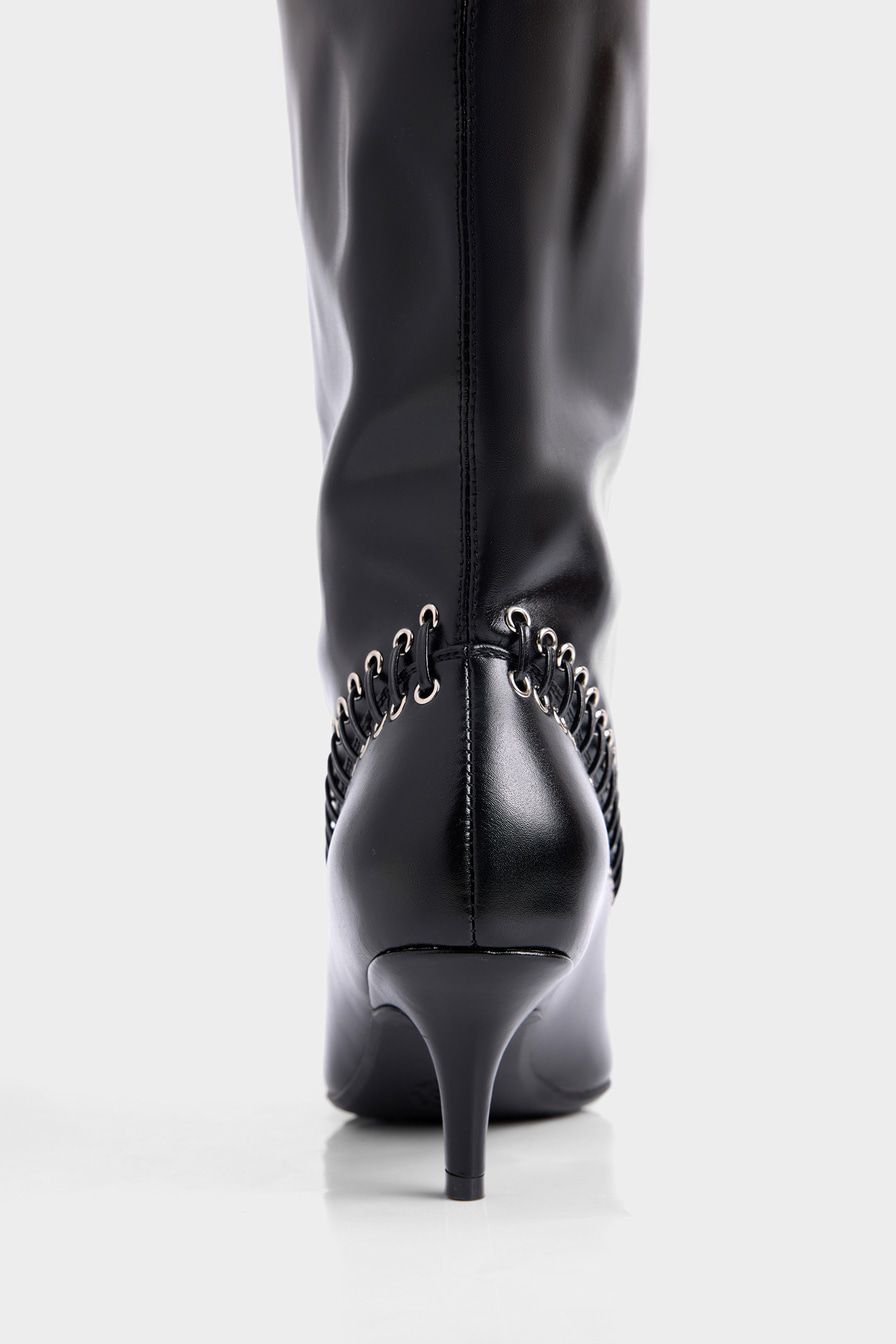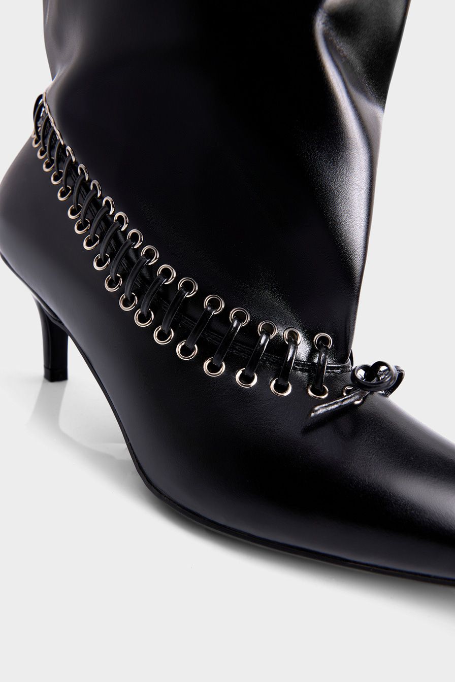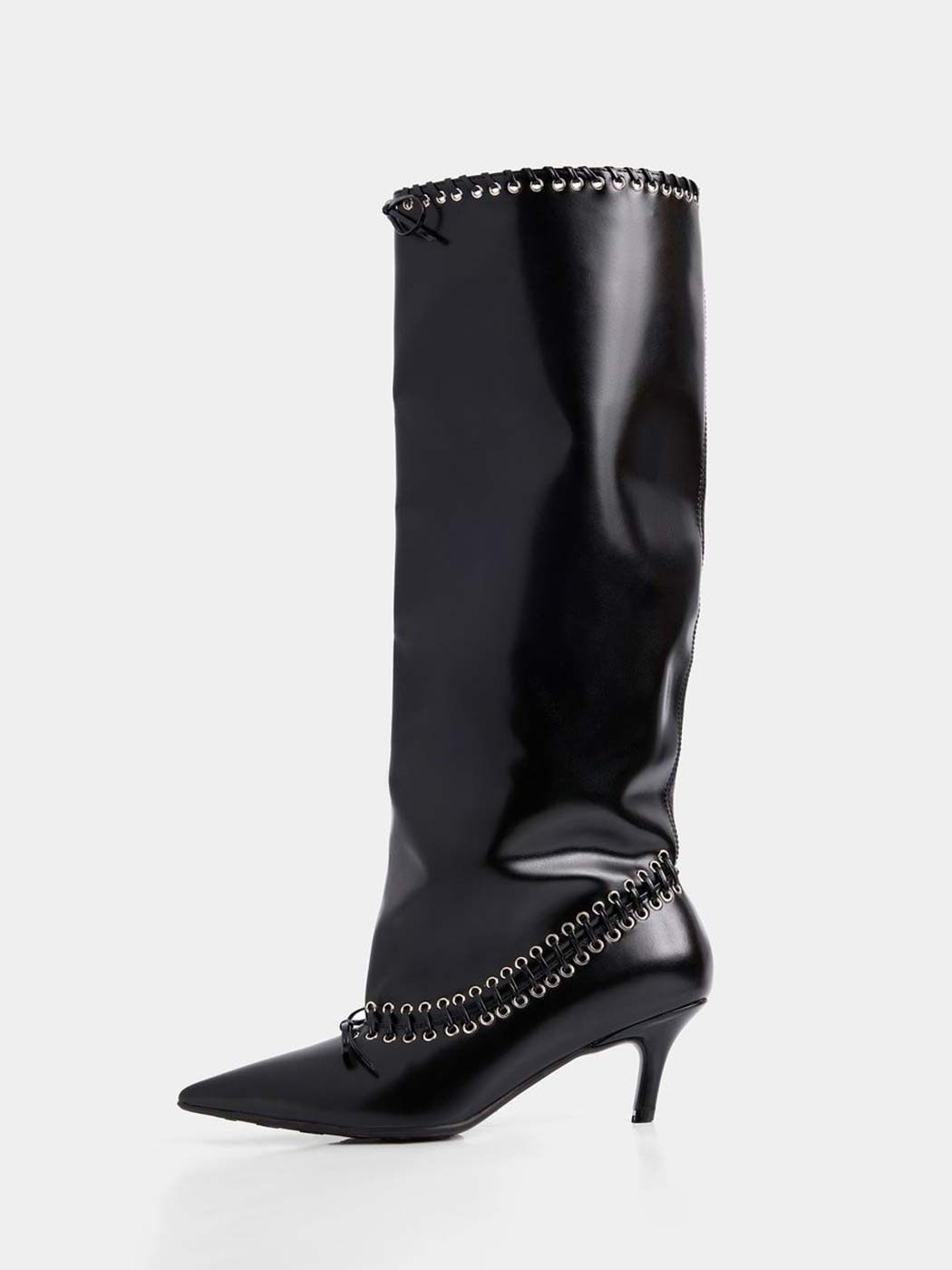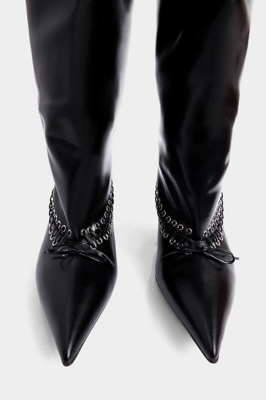 Высокие черные сапоги со свободным голенищем выполнены из микрофибры – высокопрочного заменителя натуральной кожи на основе микроволокон. Сапоги декорированы люверсами и шнуровкой.