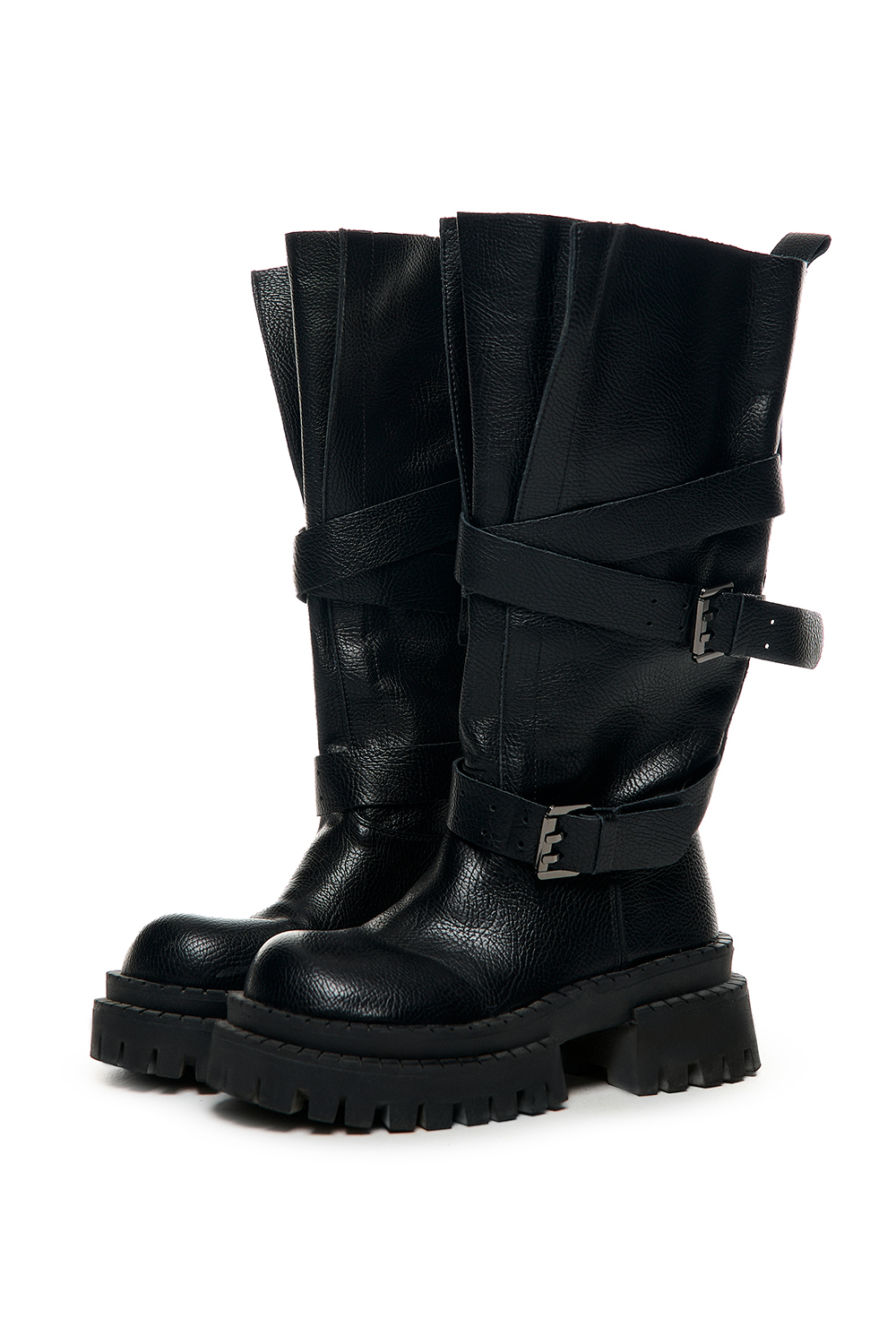Сапоги на низком ходу выполнены из крупнозернистого материала, дополнены активной металлической фурнитурой и перекрёстными ремешками. Эффектная модель в стиле «гранж» с округлым объёмным носком, выраженной фактурной подошвой, пряжкой и фронтальными складками. Вариантов стилизации сапог может быть множество: от брюк из эко-кожи и свитшотов до романтических платьев, когда можно сыграть на эффектном контрасте стилей и фактур ткани.