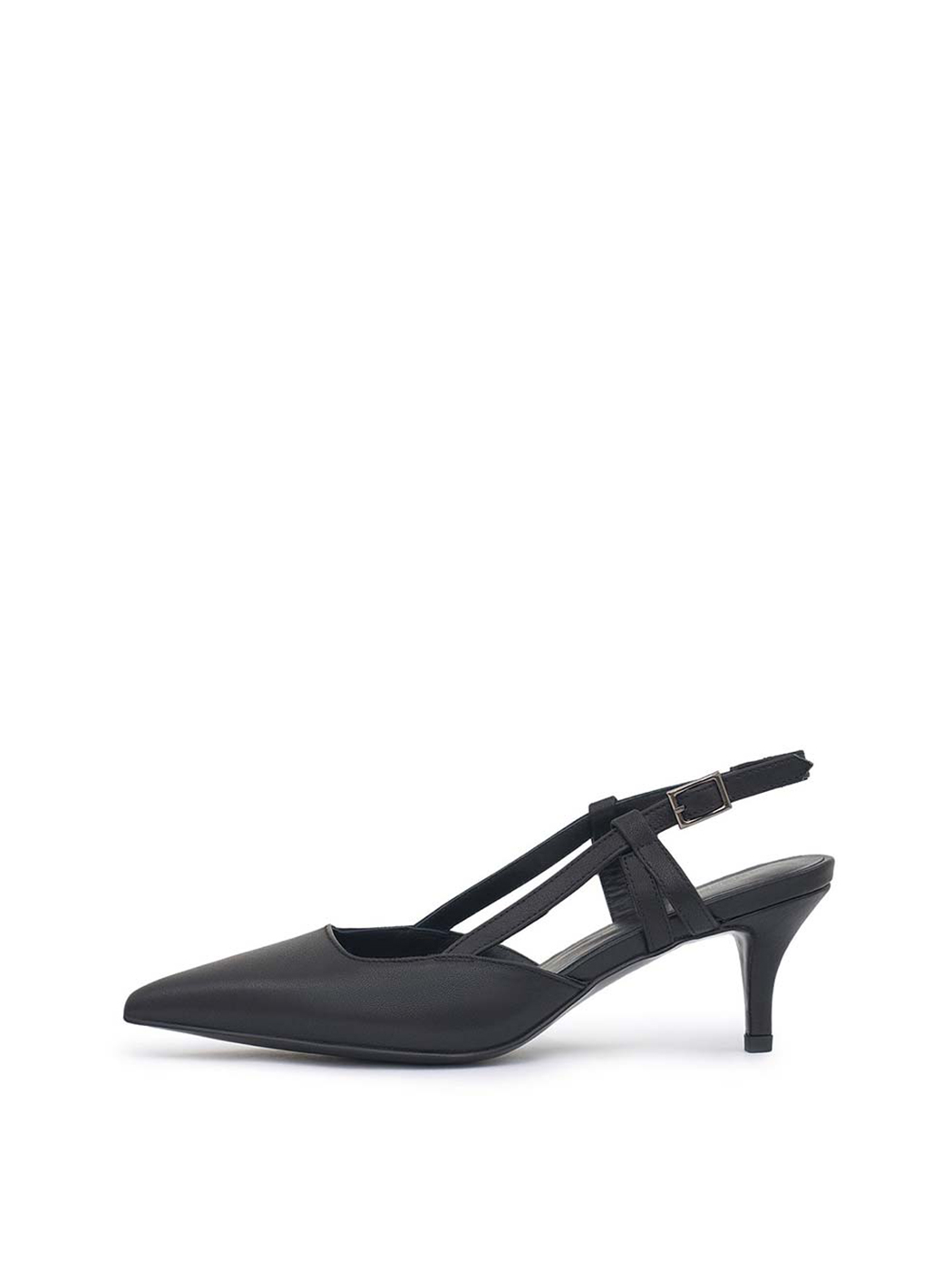 Туфли-слингбэки с заостренной носочной частью станут акцентным элементом образа. Модель выполнена из натуральной кожи гладкой фактуры в классическом черном цвете. Конструкция из узкого регулируемого ремня комфортно фиксирует пару на ноге, а невысокий скульптурный каблук визуально вытягивает силуэт.