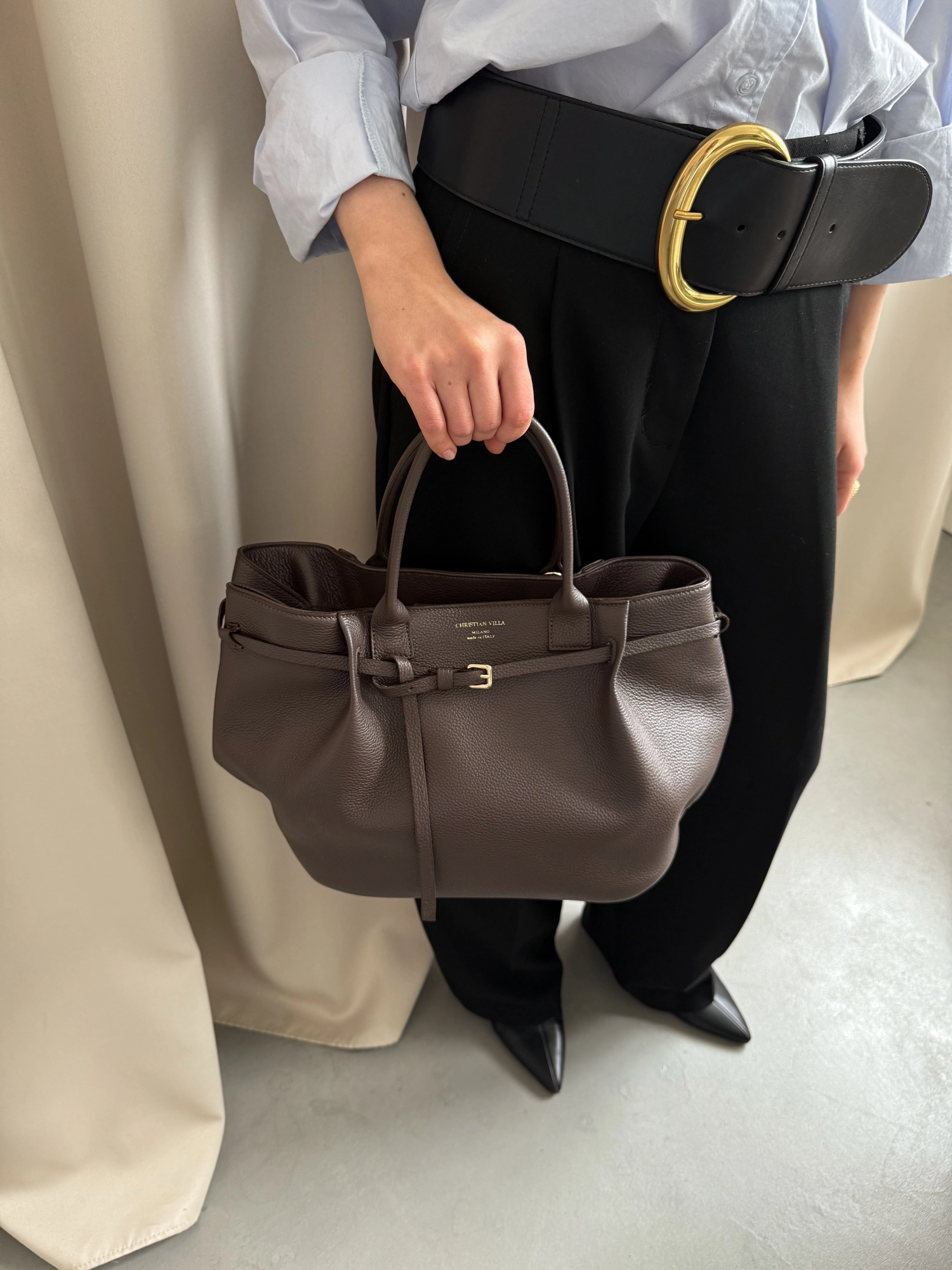 Сумка выполнена из мягкой натуральной кожи. Имеет интересную форму. Не смотря на свой размер, является достаточно вместительной моделью, что поможет носить с собой все самое необходимое каждый день.