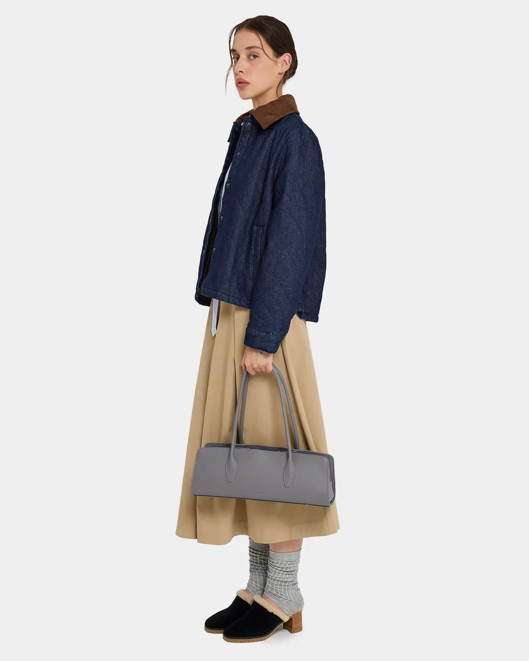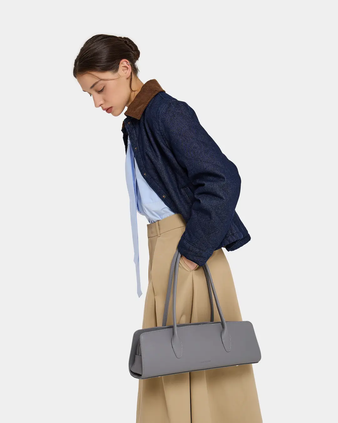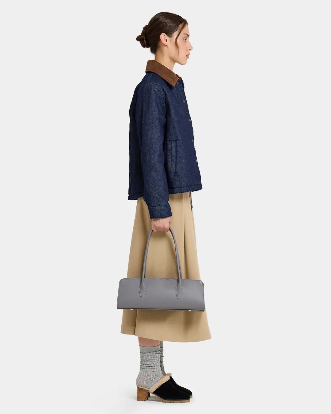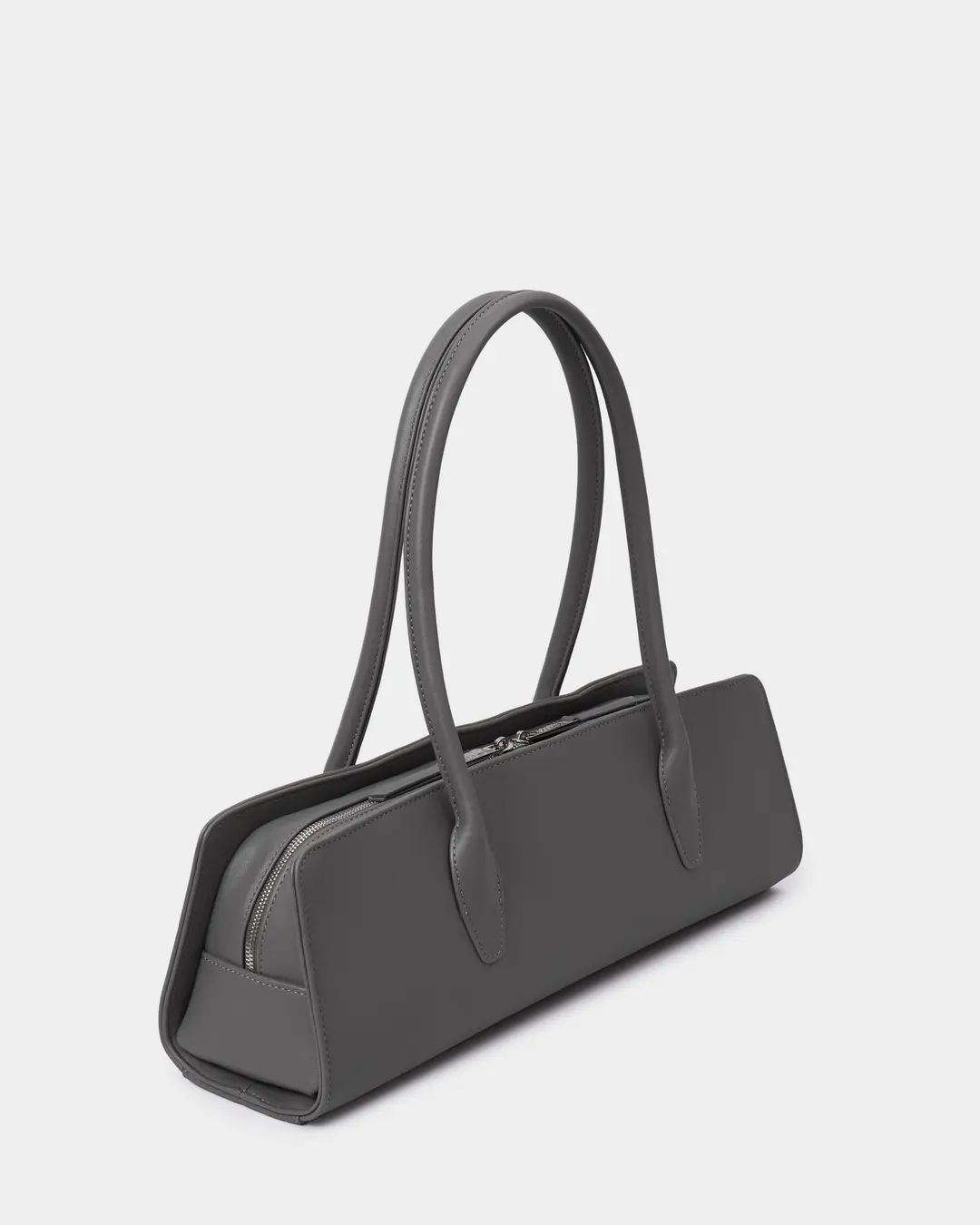 Утончённая сумка-такса с тонкими ручками из экокожи в сером цвете
