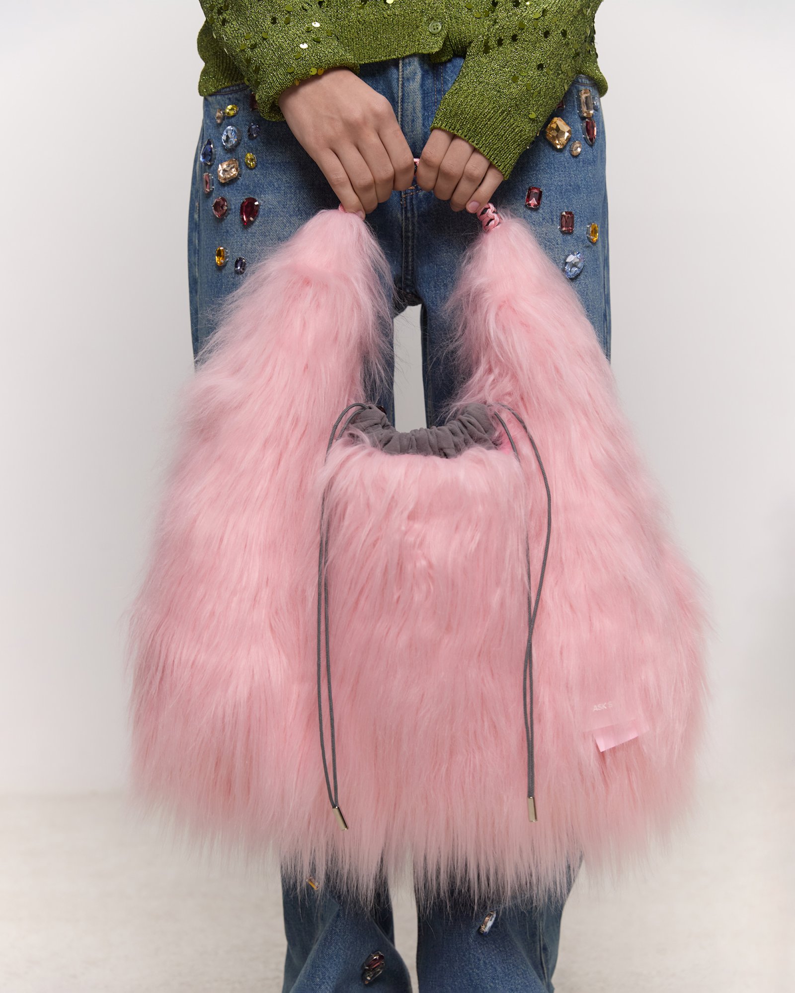 Синтезия модных спортивных элементов и нежной уютной фактуры. Внутренний текстильный мешок затягивается на кулиску и крепится к сумке карабинами – при желании его можно снять.