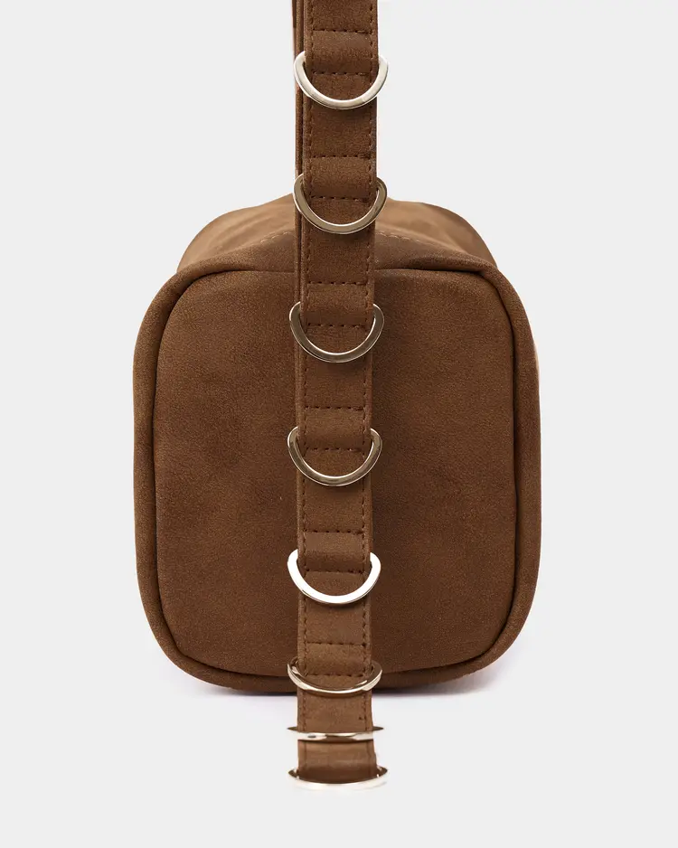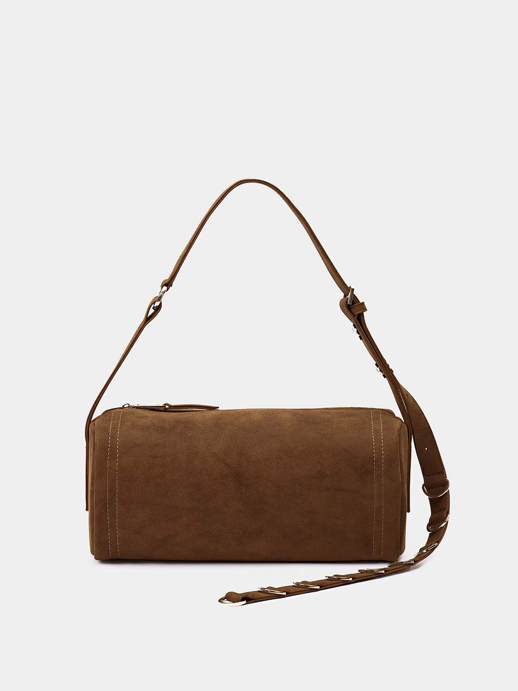 Горизонтально вытянутая мягкая прямоугольная сумка из замшевой экокожи, с акцентным ремнем с полукольцами и контрастной строчкой