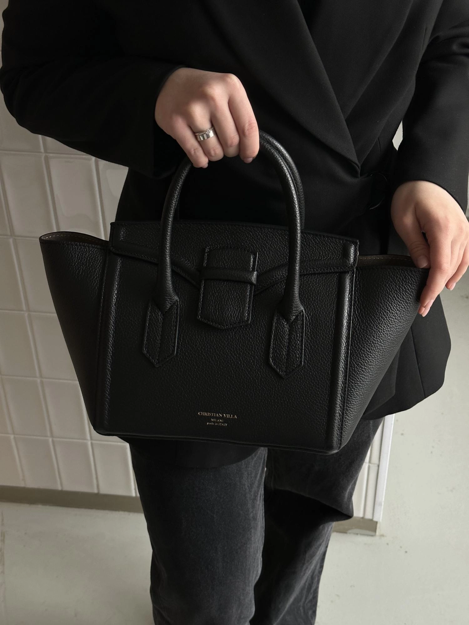 Сумка выполнена из натуральной кожи, закрывается перекидным клапаном на фурнитуру. Внутри одно отделение и два боковых кармана. Сумочка носится на плече, на сгибе руки или в руке.
