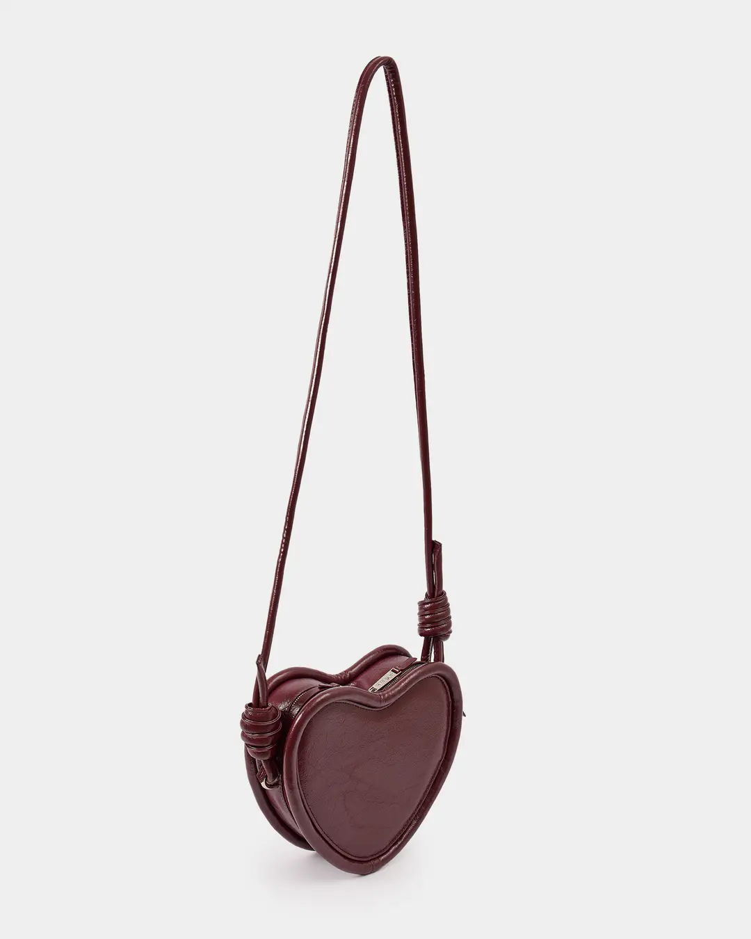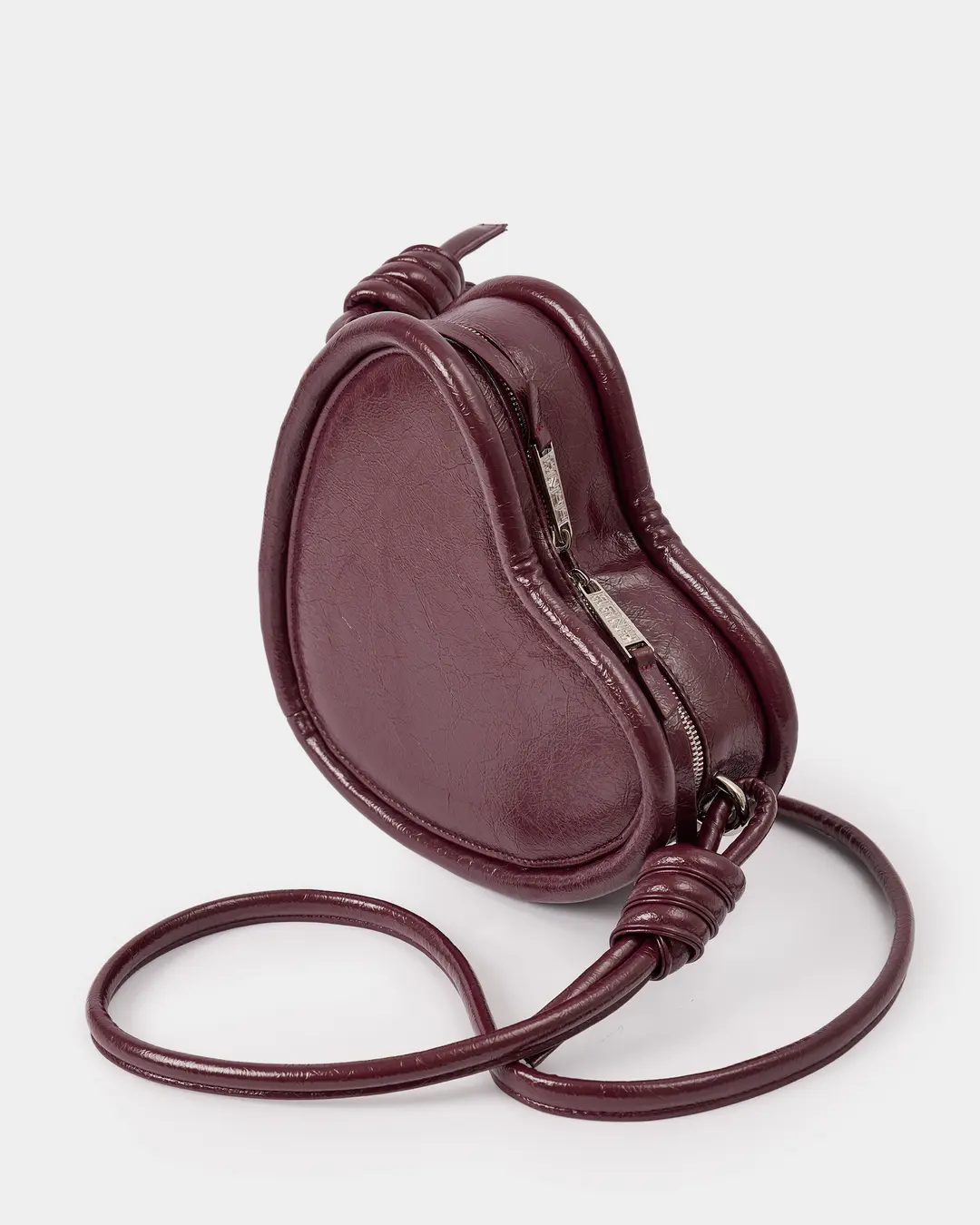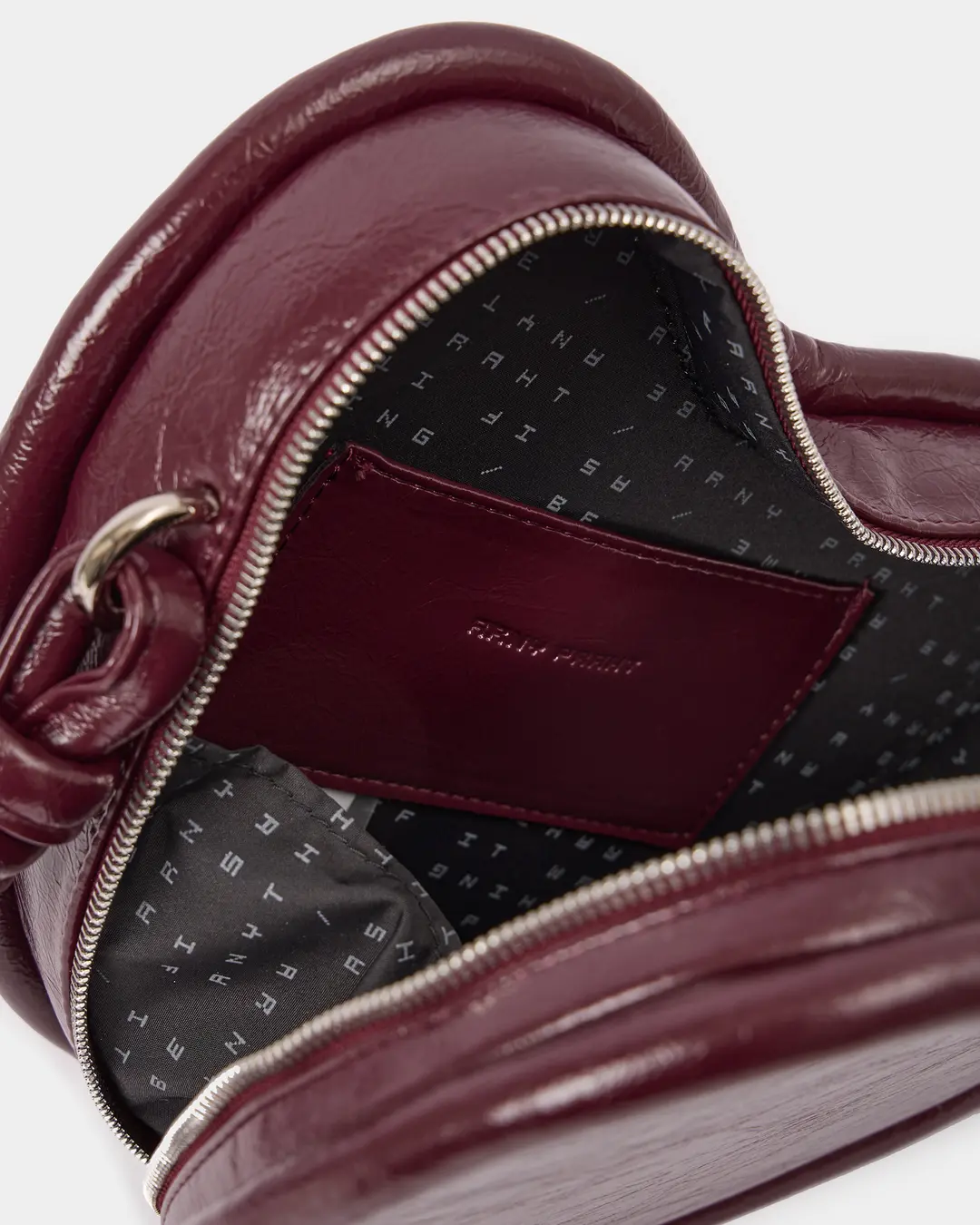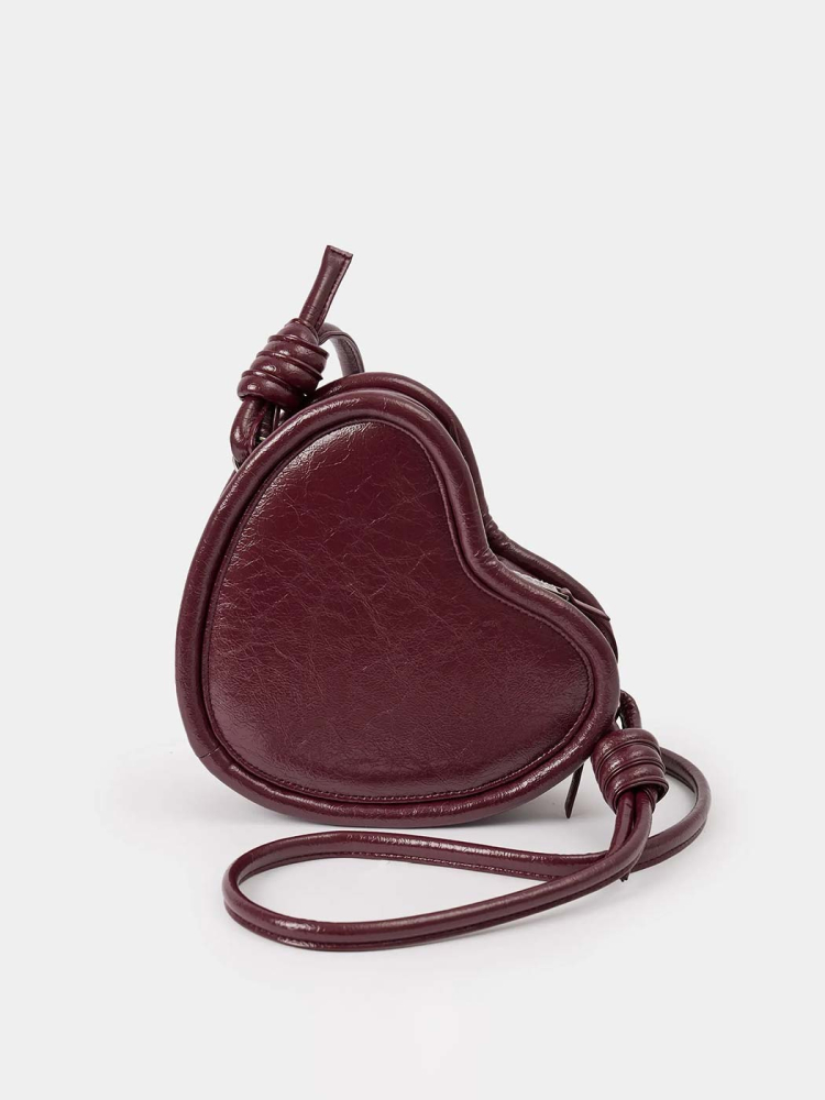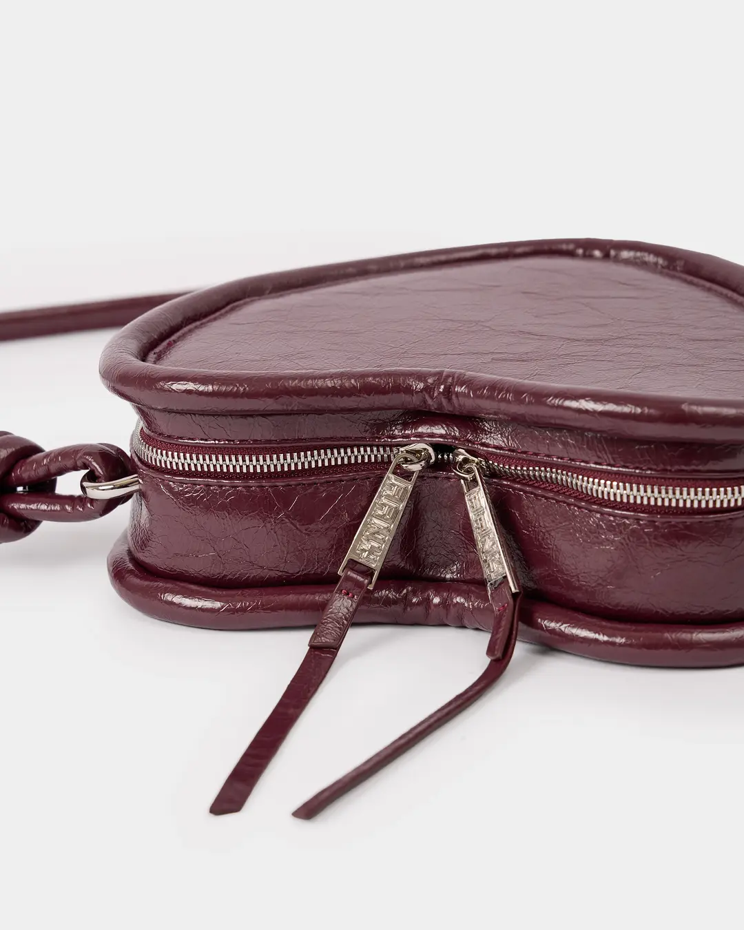 Каркасная сумка в форме сердца с ремнем-жгутом в цвете бордо кракле.
