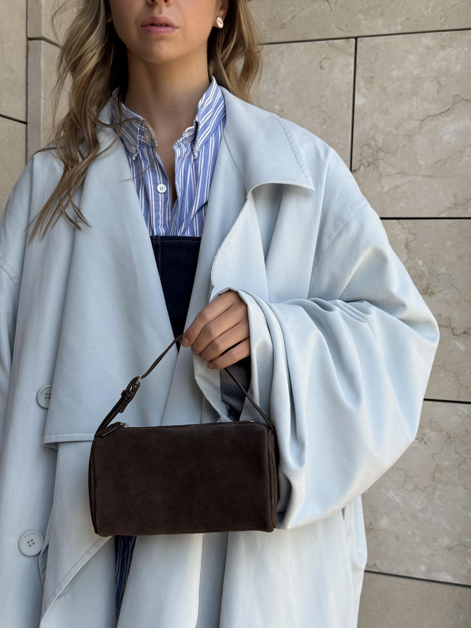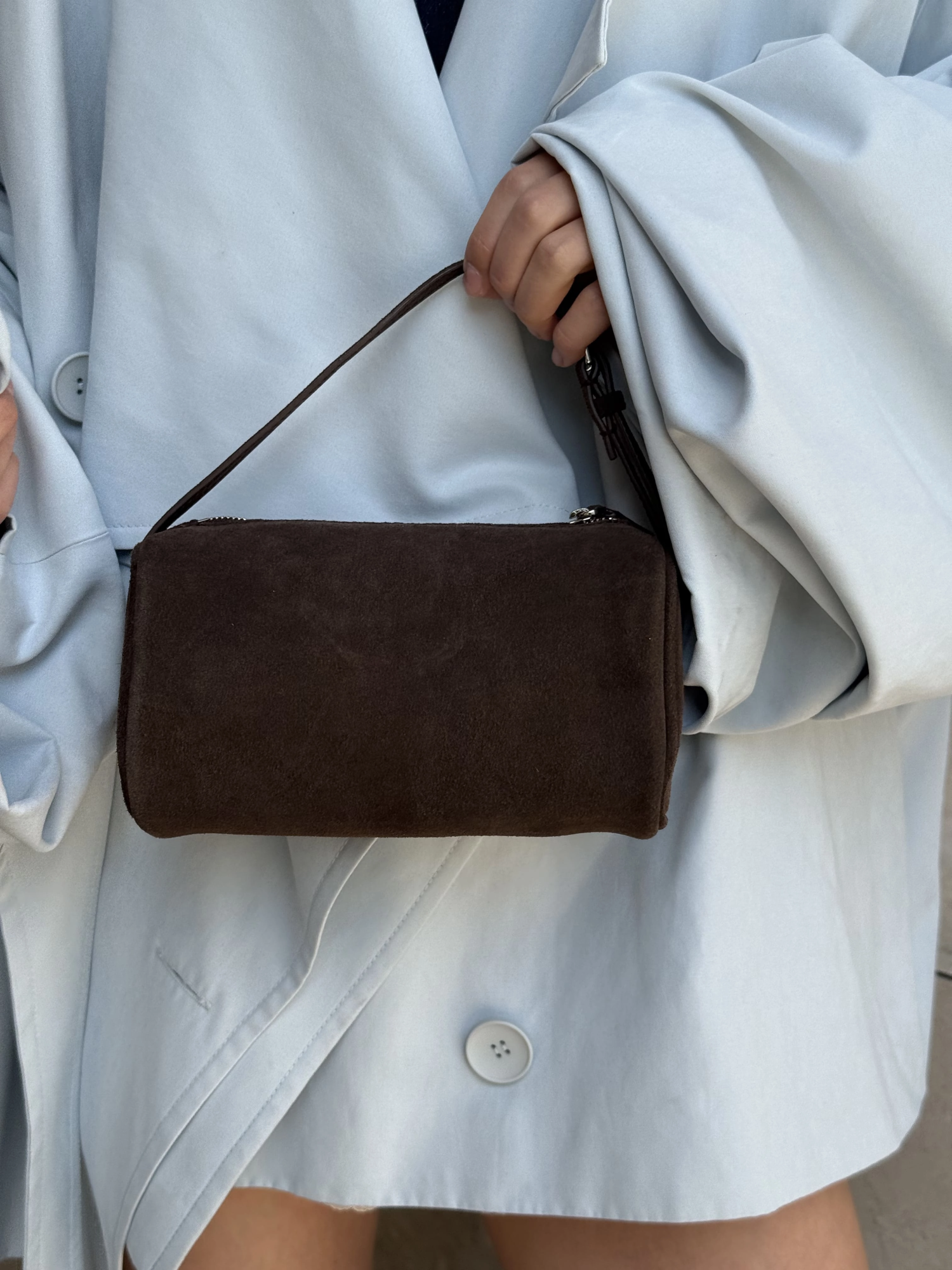 Мини сумка выполнена из натуральной замши. Представлена с коротким ремешком, но в комплекте есть доп. ремешок с регулировкой, что помогает носить сумку не только в руке, но и как модель кросс-боди.