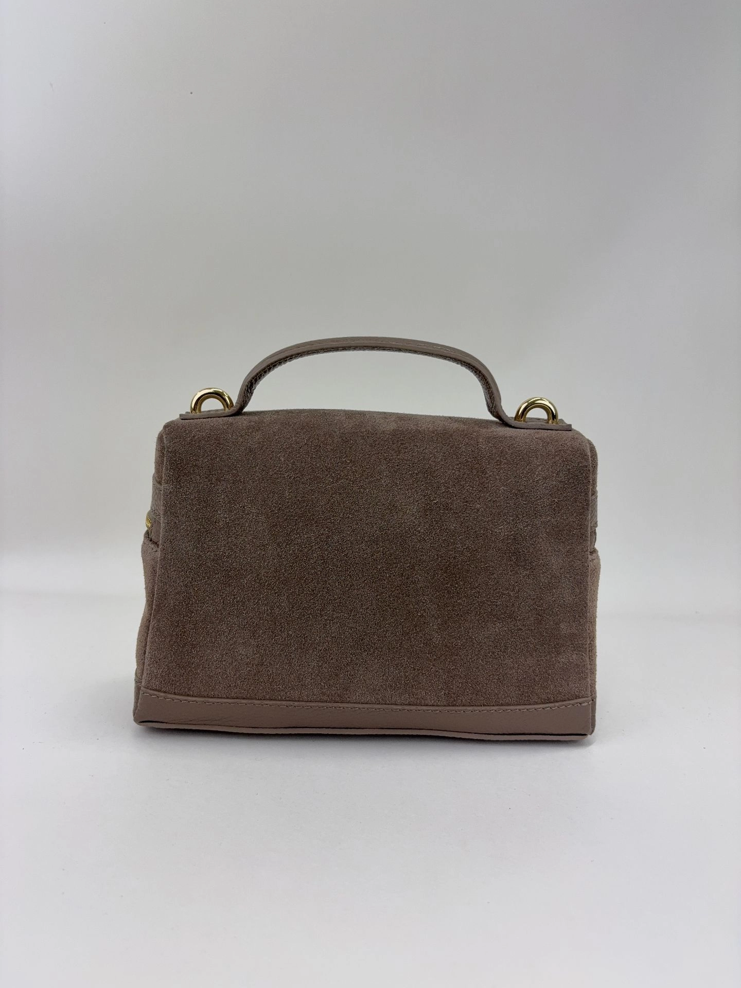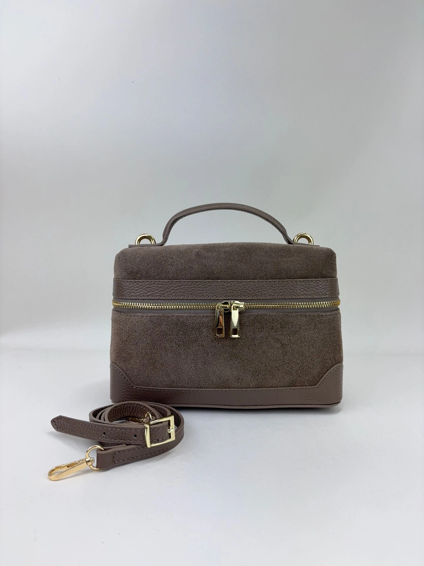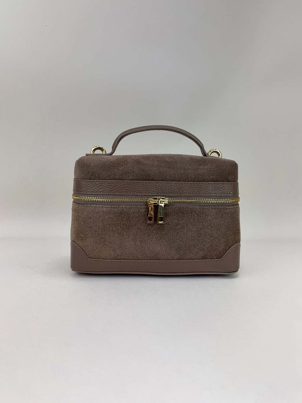 Популярная модель в формате мини размера на одной ручке в комбинации натуральной кожи и замши. Внутри одно отделение с дополнительным кармашком на молнии. Длинный кожаный ремень с регулировкой в комплекте