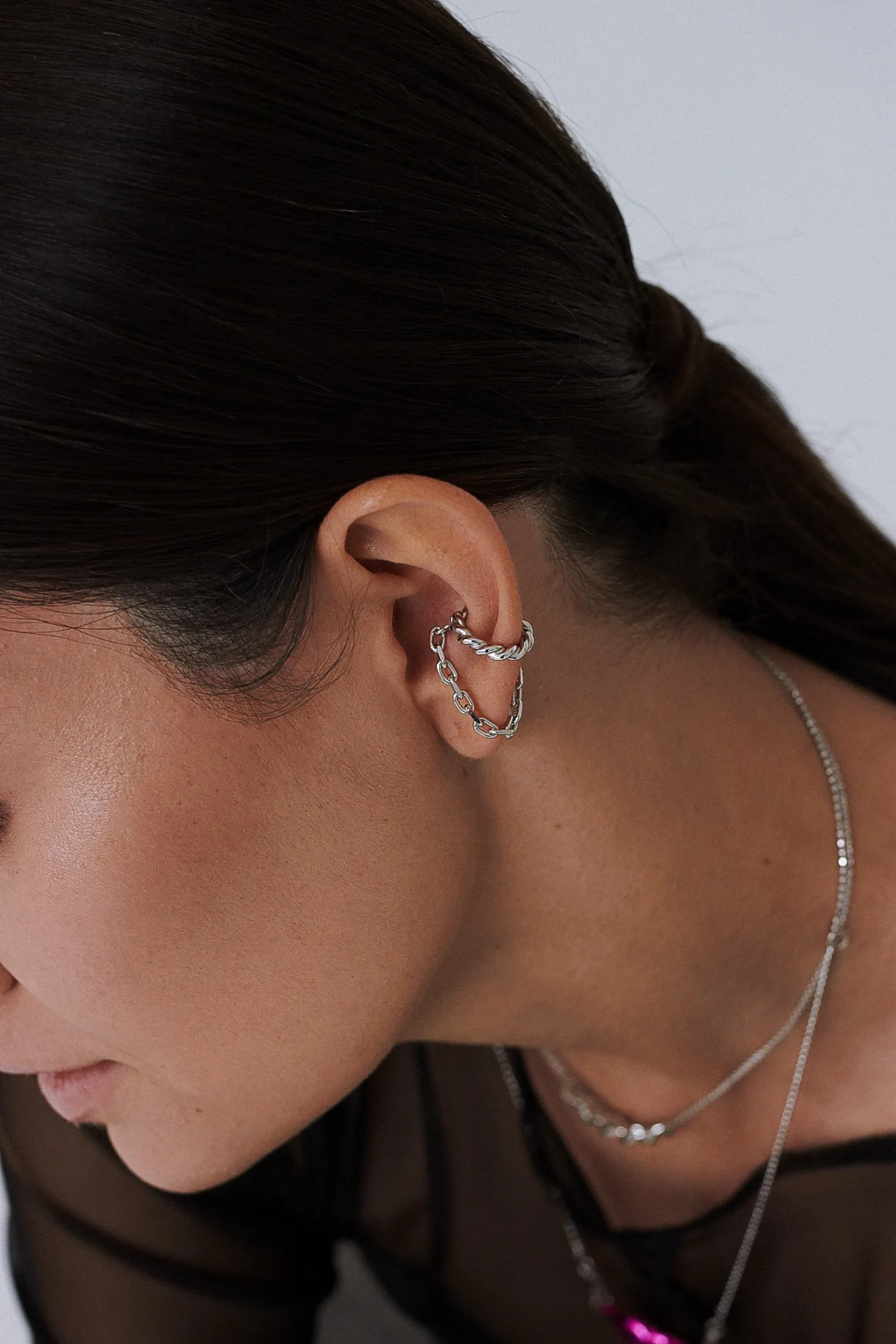Необычная форма каффа с жестким каркасом и цепочкой позволяет создать яркий акцент на ухе без дополнительных украшений и броских оттенков. Идеально для тех, кто ограничен дресс-кодом, но не может существовать без экспериментов.