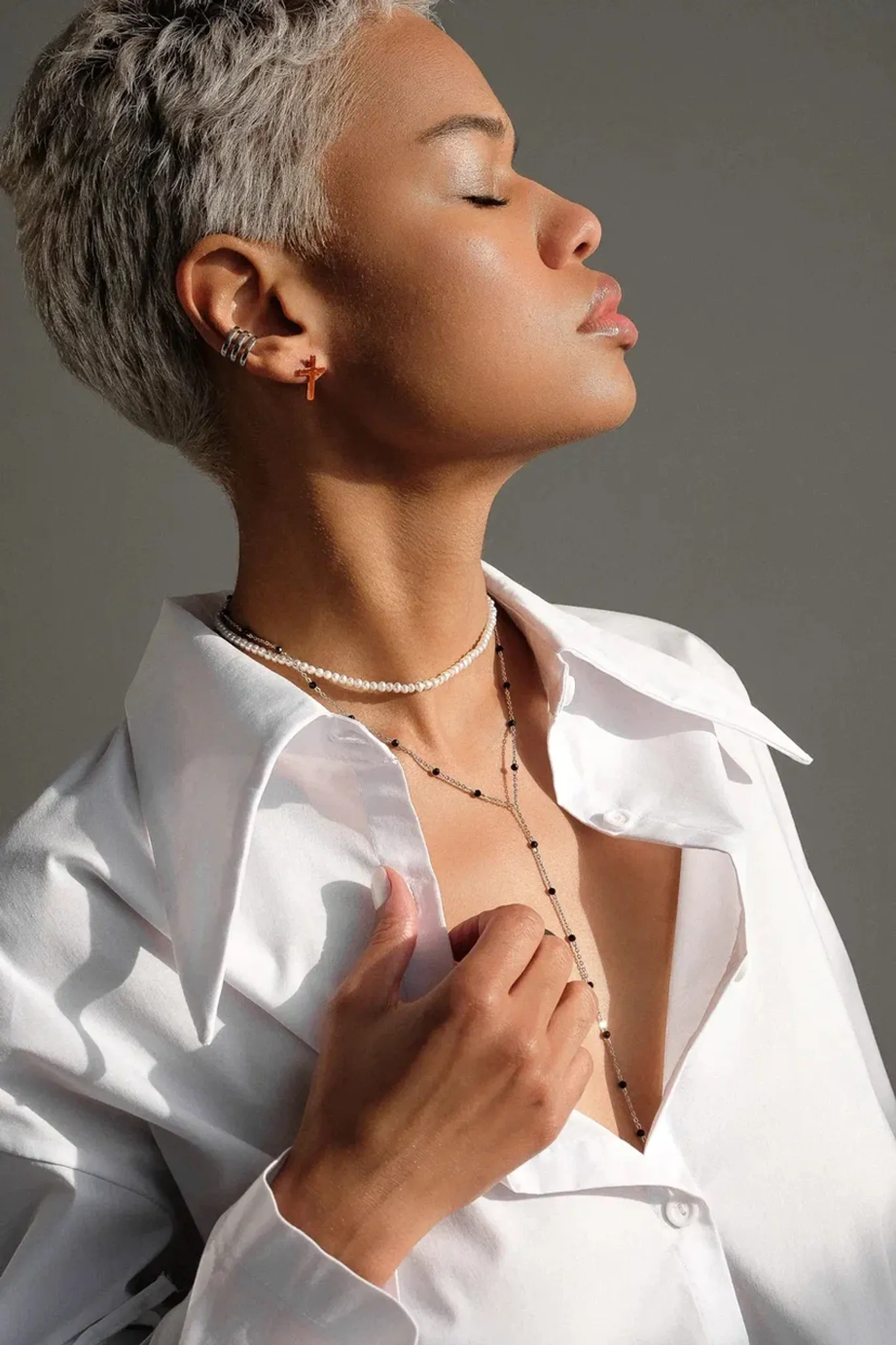 Нежное колье-чокер из шаровидных жемчужин среднего размера — лучшая ювелирная инвестиция, которая позволит добавить лаконичной элегантности как в повседневные, так и в праздничные образы.
