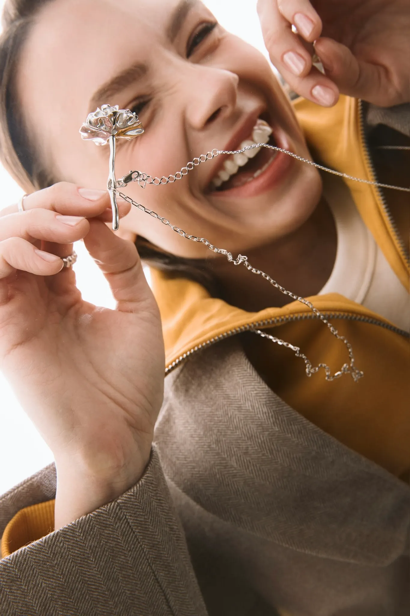 Нежный цветок, чью хрупкость мы воплотили в классическом серебряном оттенке. Вам останется только надеть его на любимую цепочку или элегантную хупу.