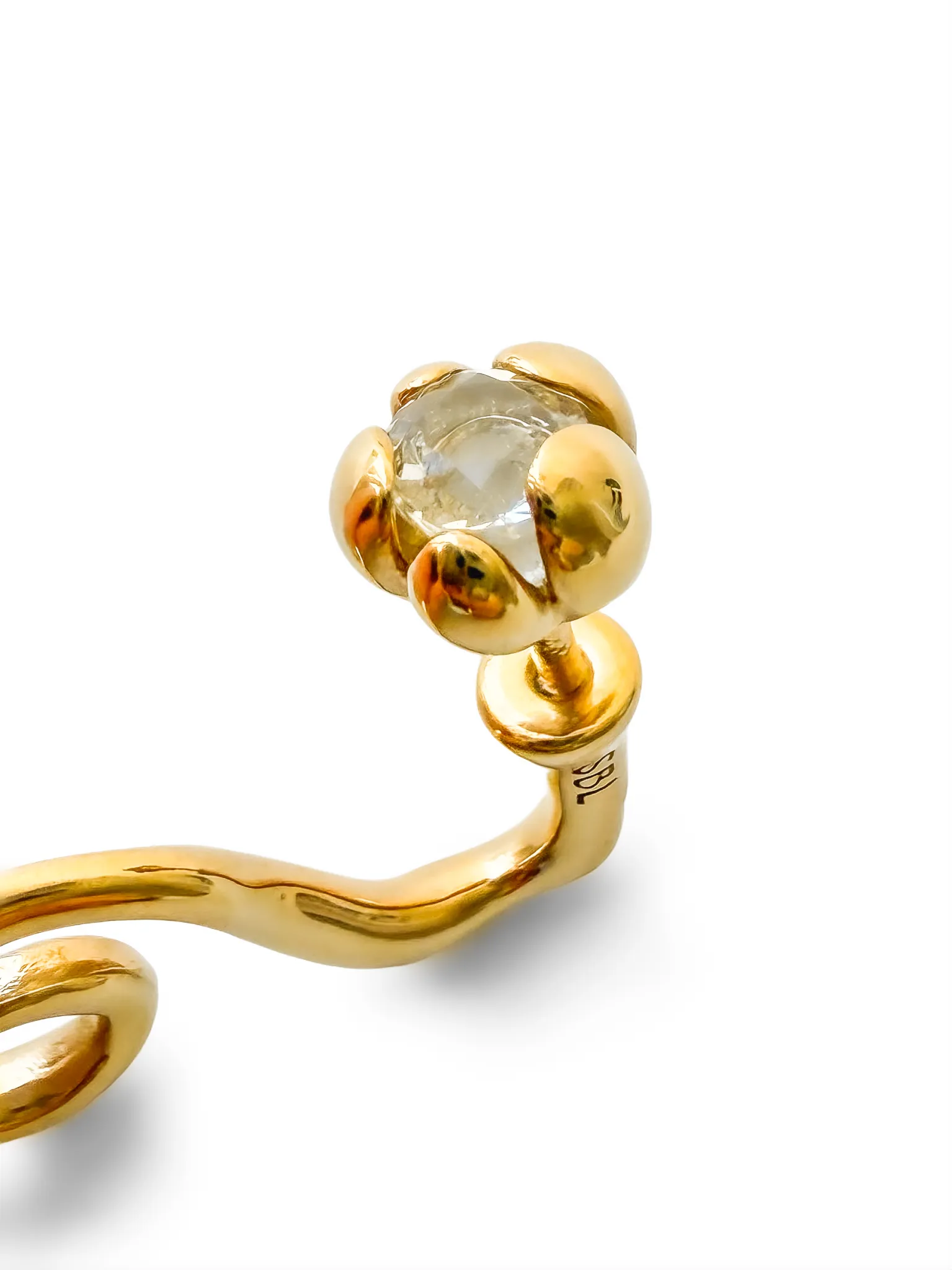 Хрупкая серебристая кувшинка, внутри которой спрятана бесконечная прозрачность горного хрусталя. «Поймали» цветок изгиб корня и получили необычное украшение, очень нежное и романтичное.