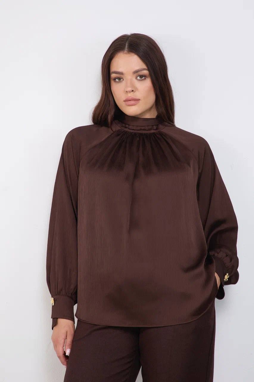 Блузка с воротником-стойка из шифона с акцентными пуговицами на манжетах. Ворот дополнен лентами, которые завязываются сзади или спереди в элегантный бант. Ткань с эффектом гофре придает блузке динамику и благородство. Блуза в коллекции прекрасно дополнит коричневый брючный костюм и юбку по косой в цвете шоколад.