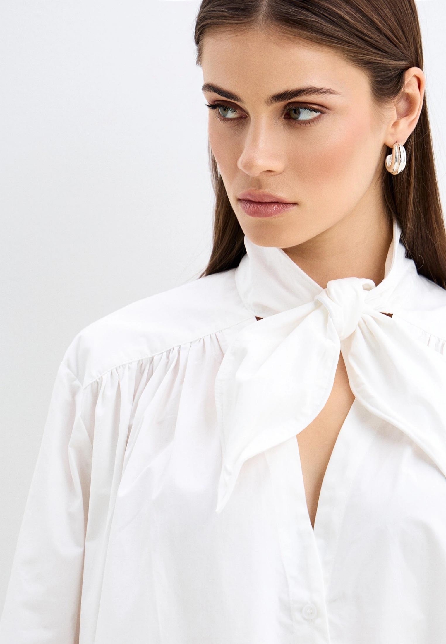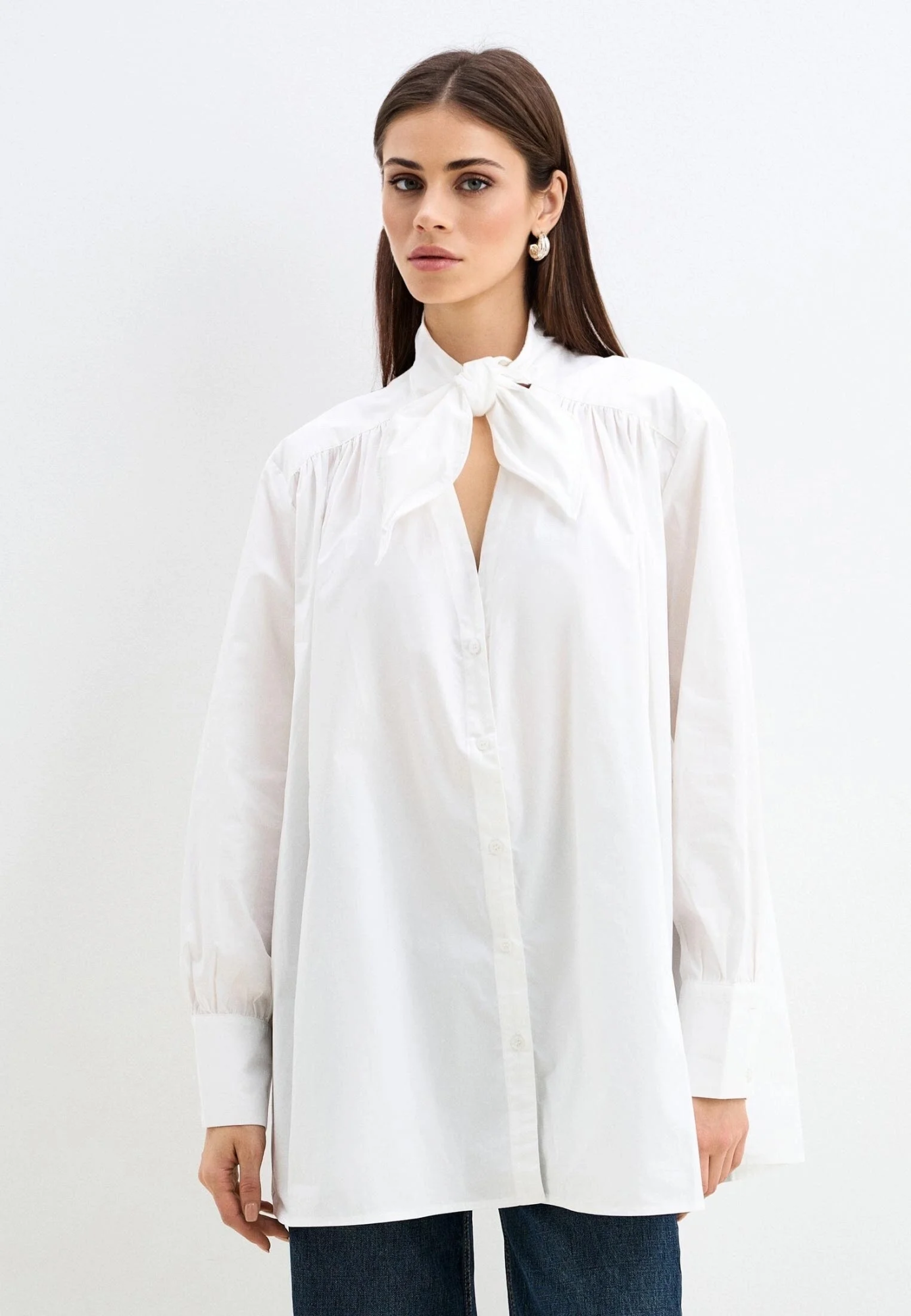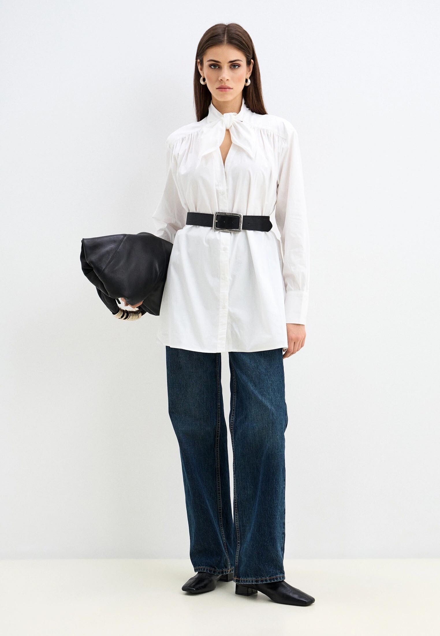 Белая рубашка с бантом — это классика, которая зазвучала по-новому. Лаконичный крой соединяется с утончённой деталью на шее, превращая базовую рубашку в акцент образа.