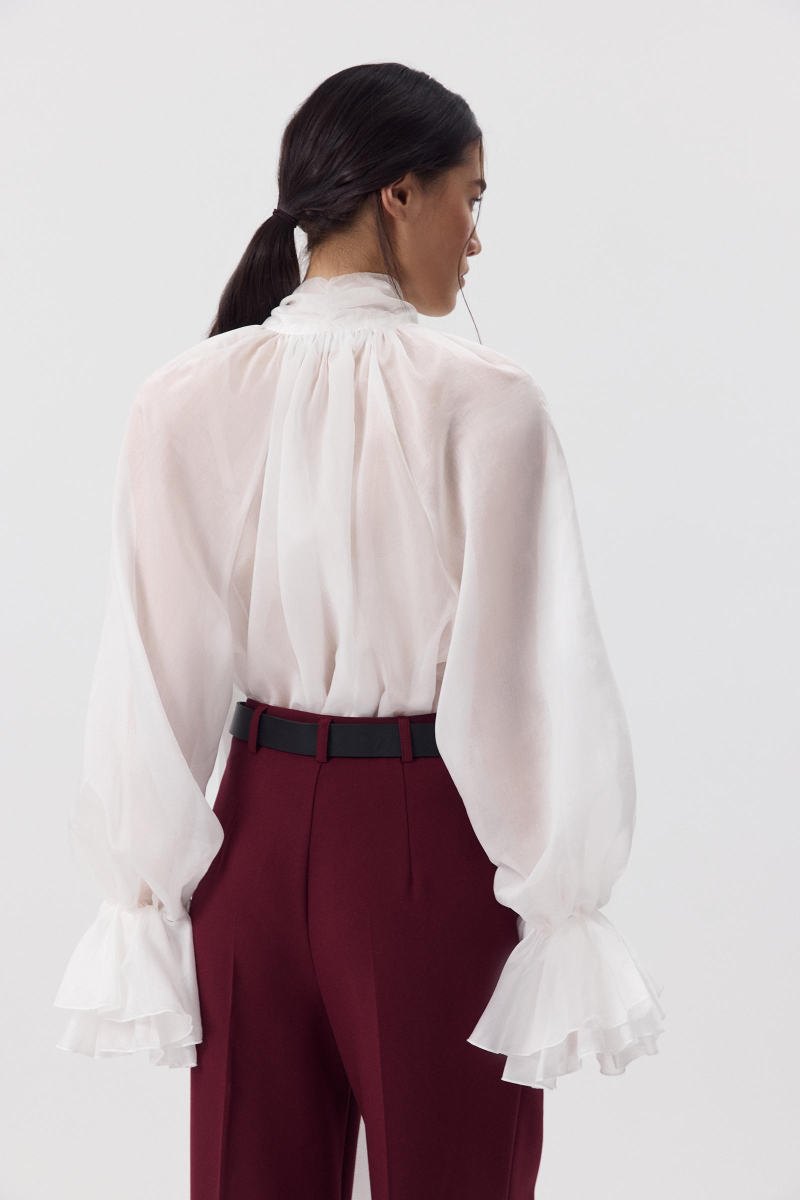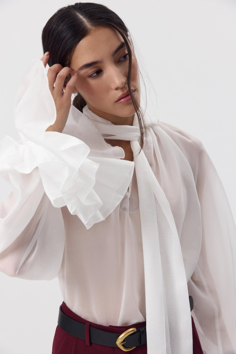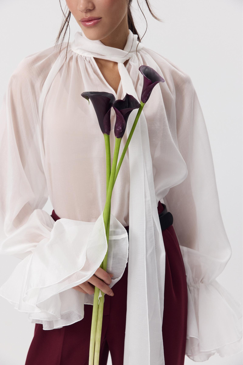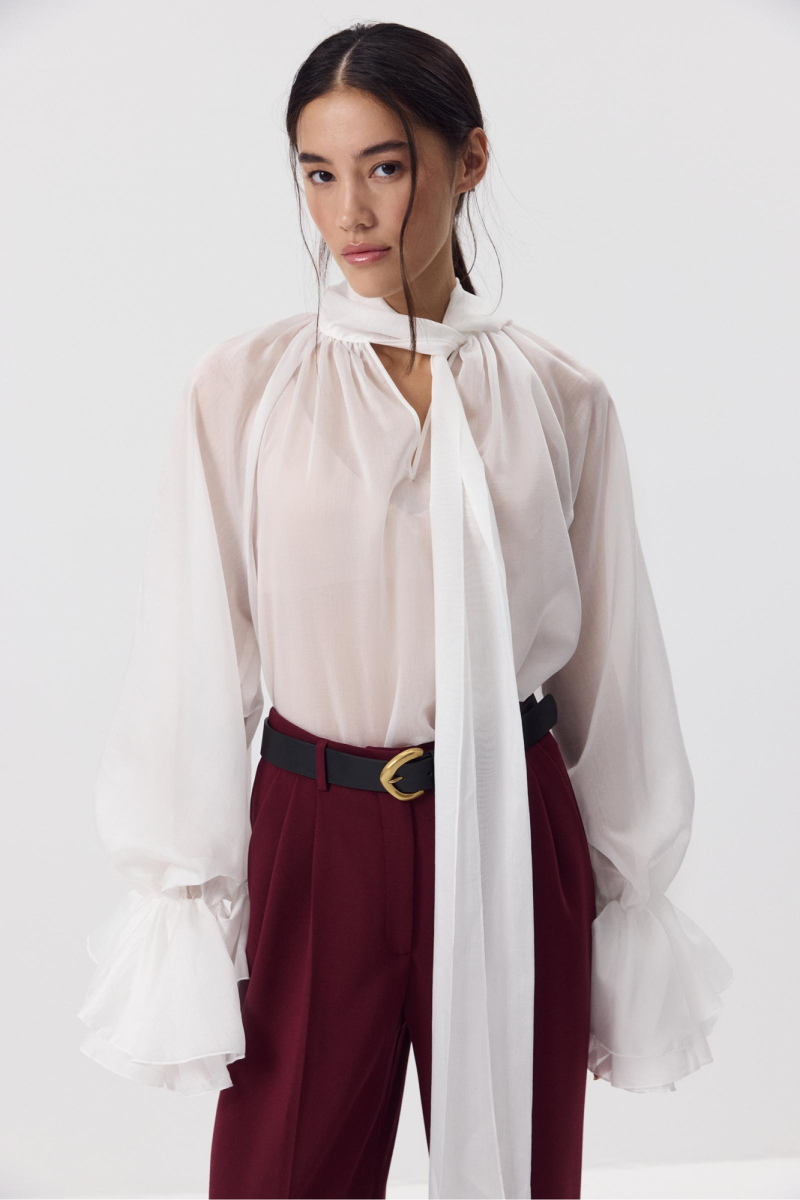 Воздушная блузка из полупрозрачной ткани. С лентами, которые вы можете оформить в бант или оставить ниспадающими. Объемные рукава с легкими сборками и резинками на манжетах добавляют нежности и объема.