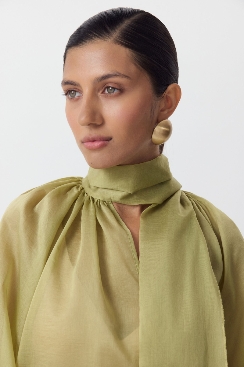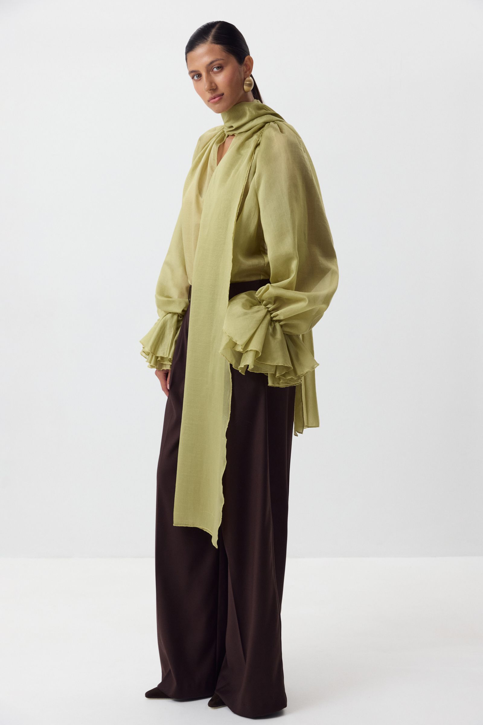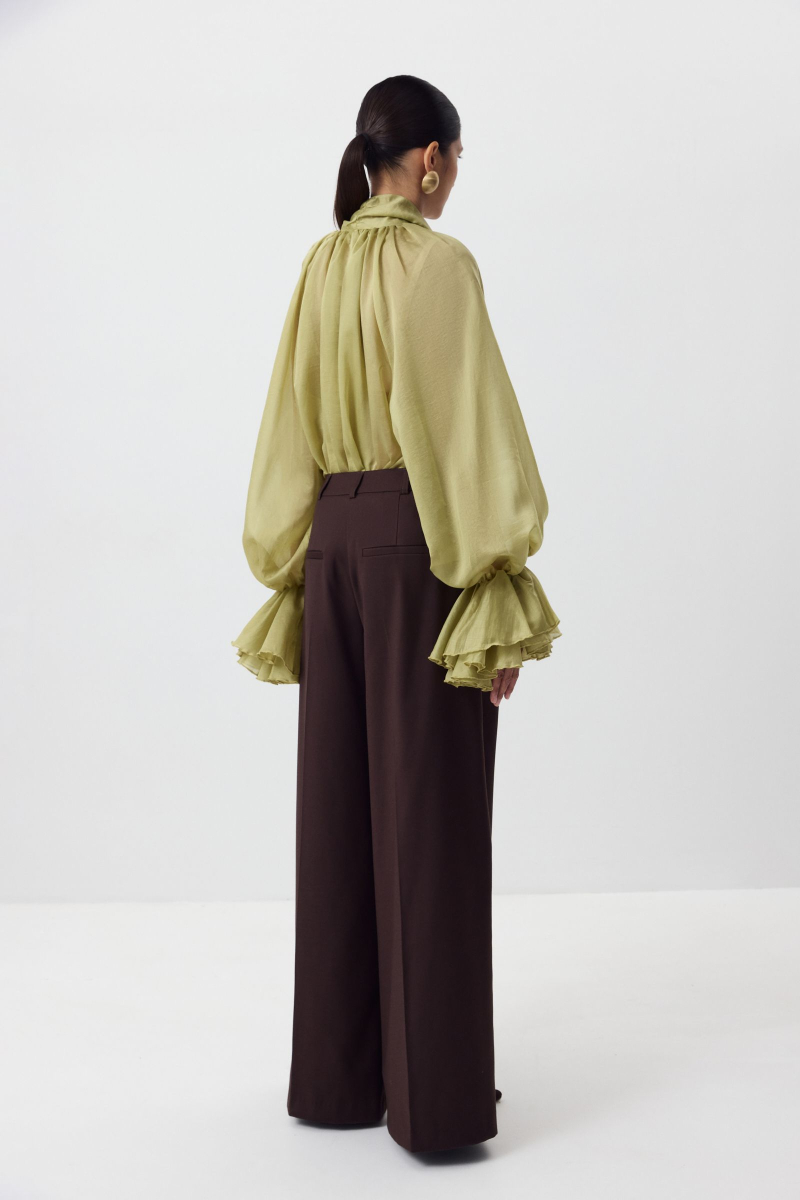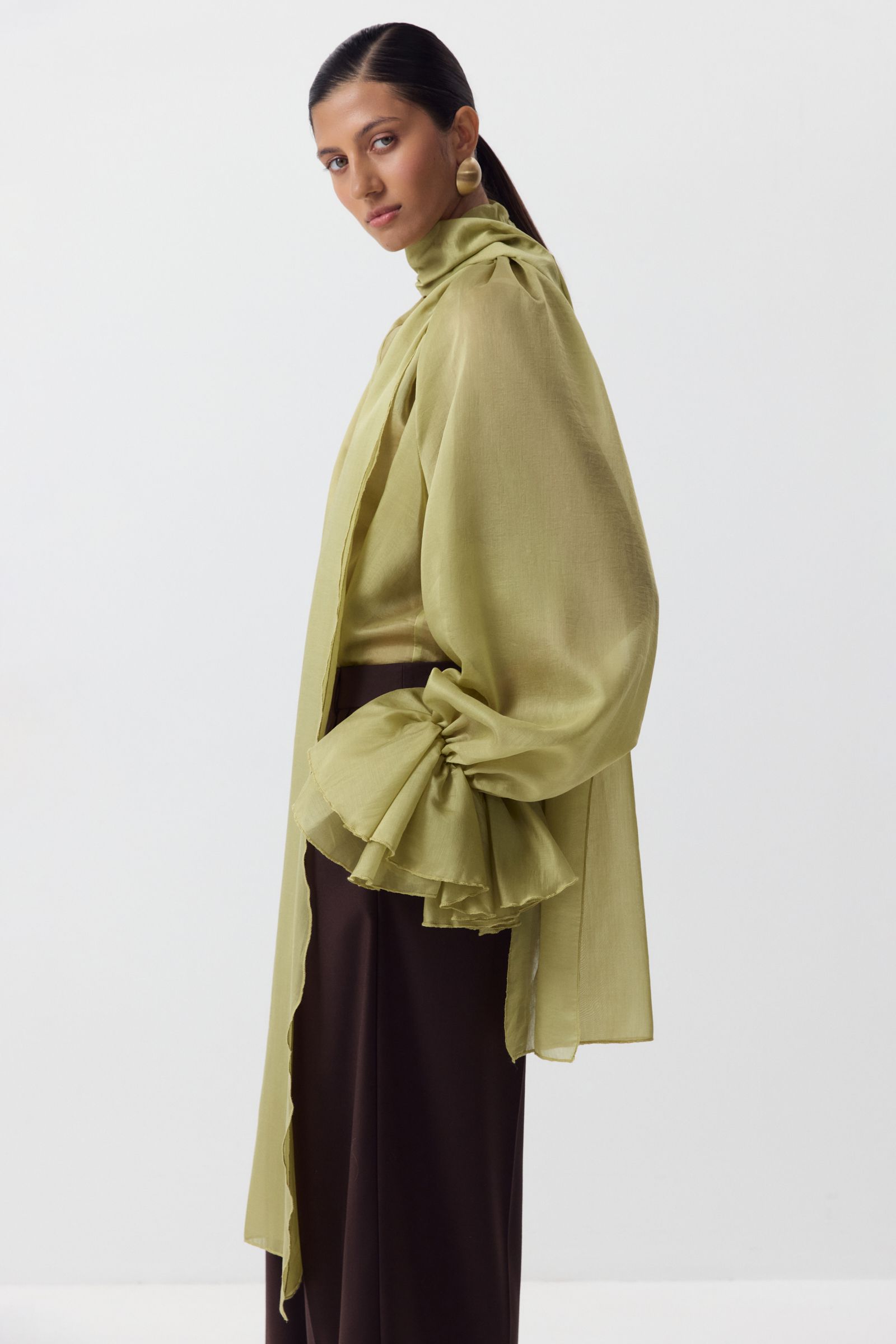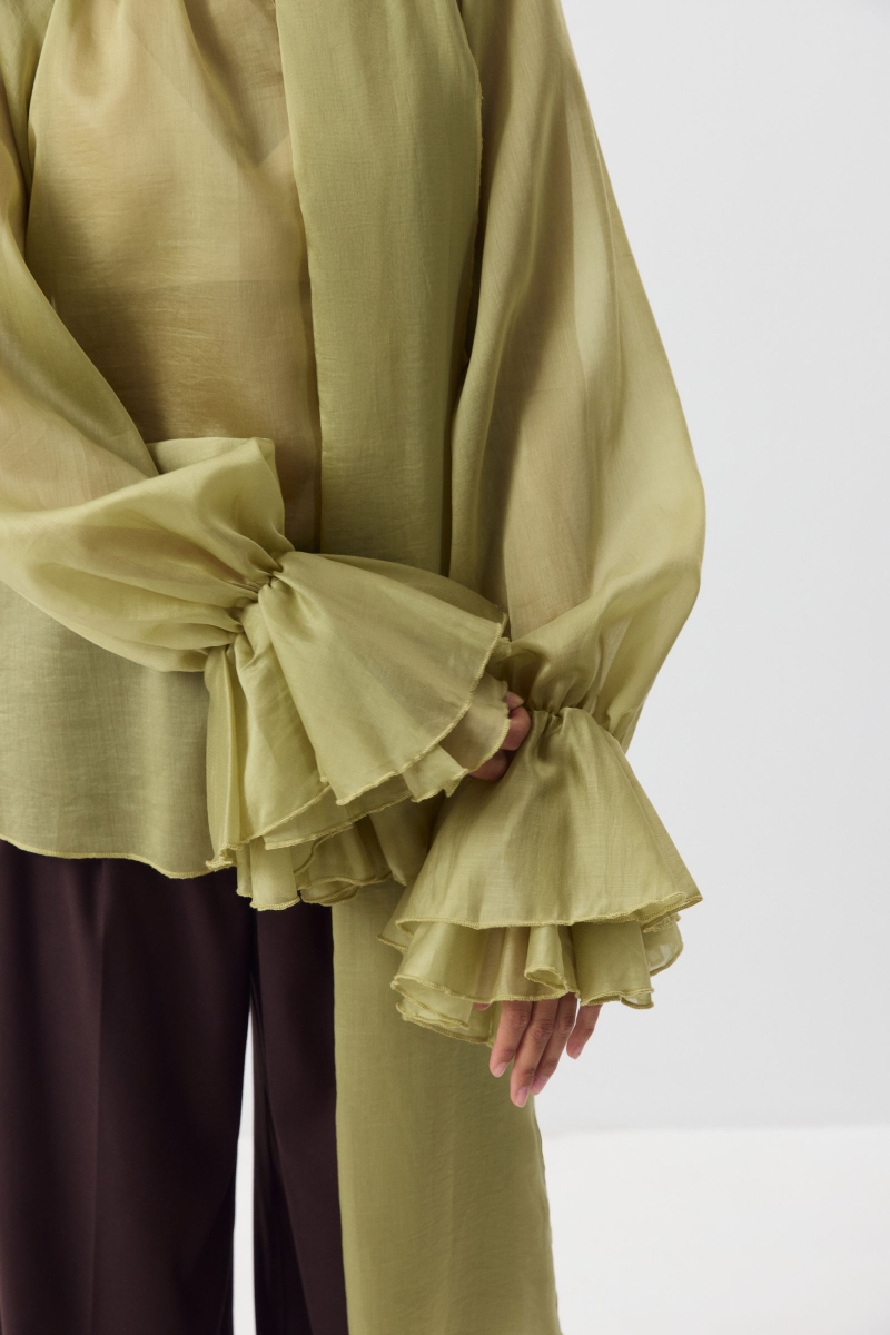 Воздушная блузка из полупрозрачной ткани. С лентами, которые вы можете оформить в бант или оставить ниспадающими. Объемные рукава с легкими сборками и резинками на манжетах добавляют нежности и объема.