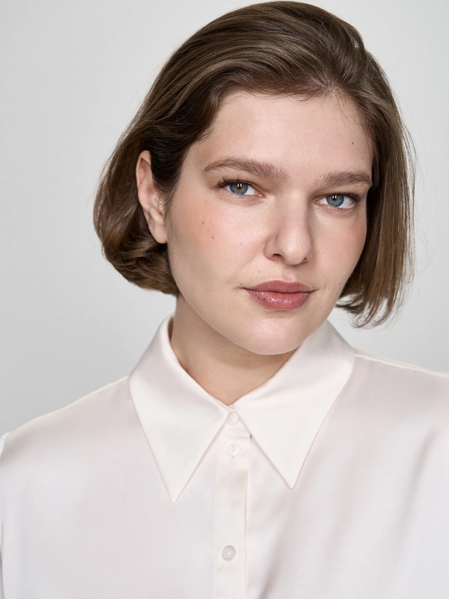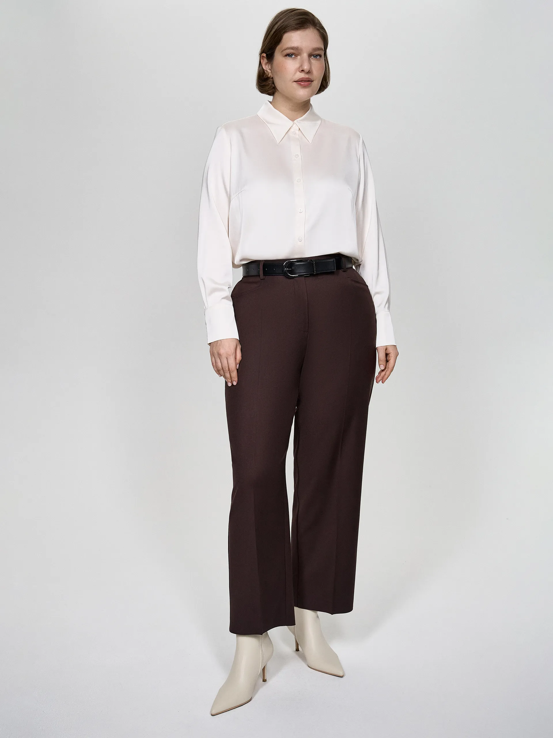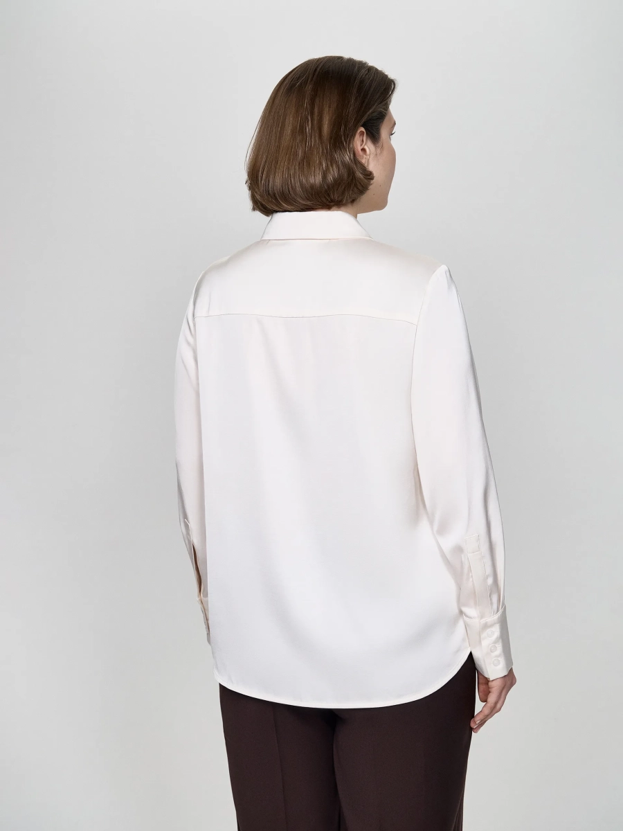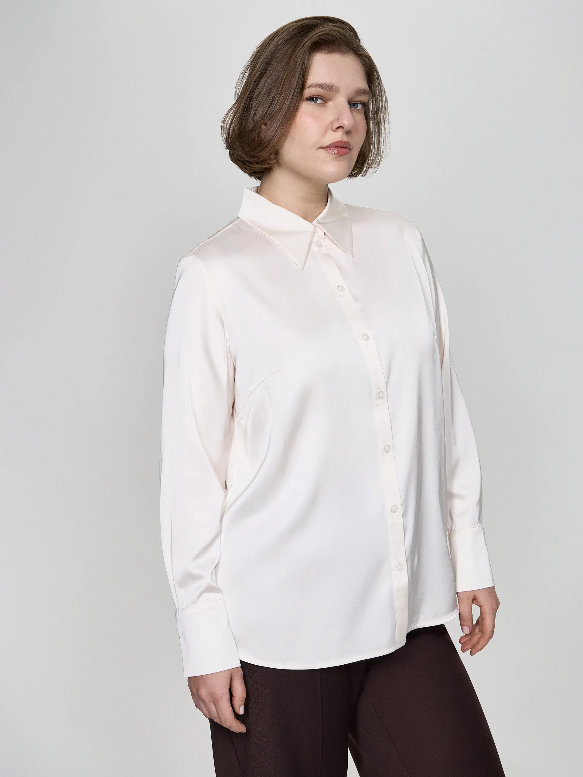 Блуза Elettra. Модель прямого силуэта, который легко адаптировать под любой низ и носить навыпуск или заправленной. Блуза выполнена из легкой атласной ткани, деликатно переливающейся на свету. Аккуратный воротник с заостренными уголками придает блузе изящности и завершенности. Классический кремовый цвет легко интегрировать в гардероб и подобрать гармоничные сочетания. Это идеальный вариант для делового дресс-кода.
