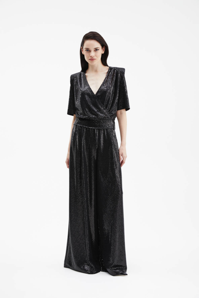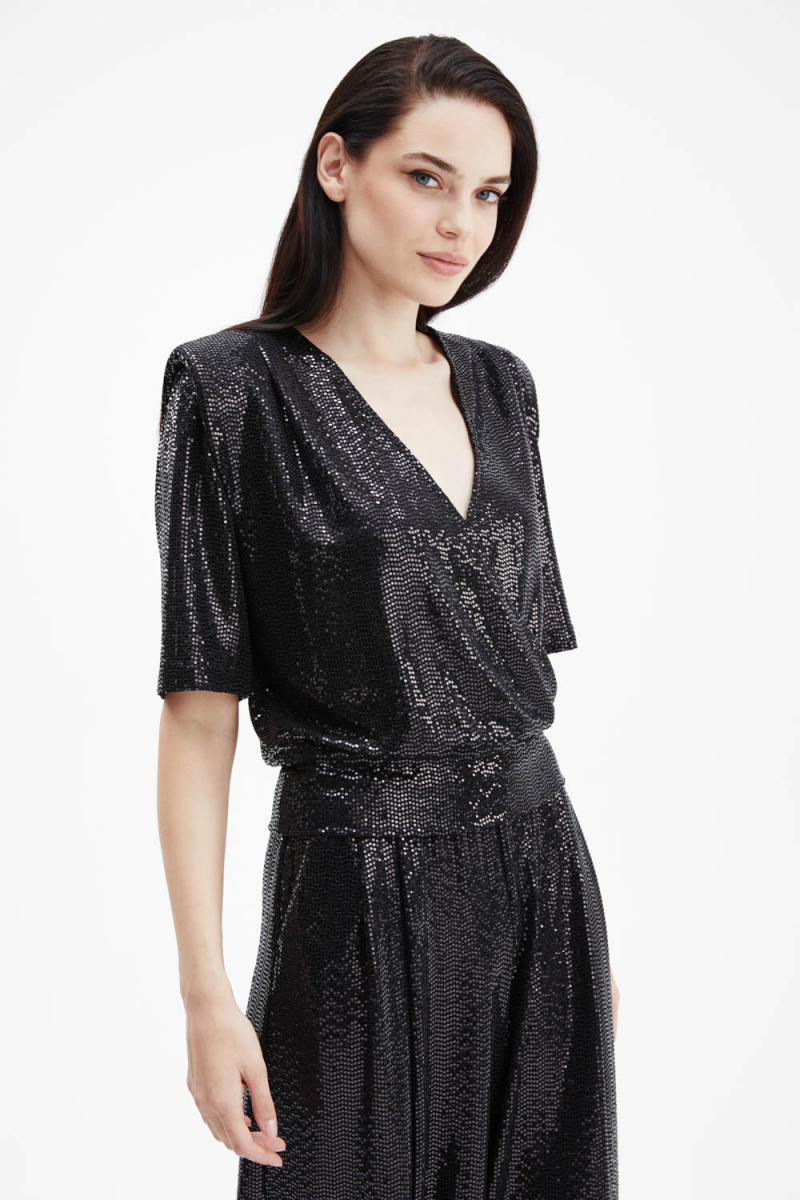 Роскошная блуза из пайеточной ткани с V-образным вырезом и короткими рукавами — элегантный акцент для вечернего образа. Легко сочетается с брюками из коллекции.