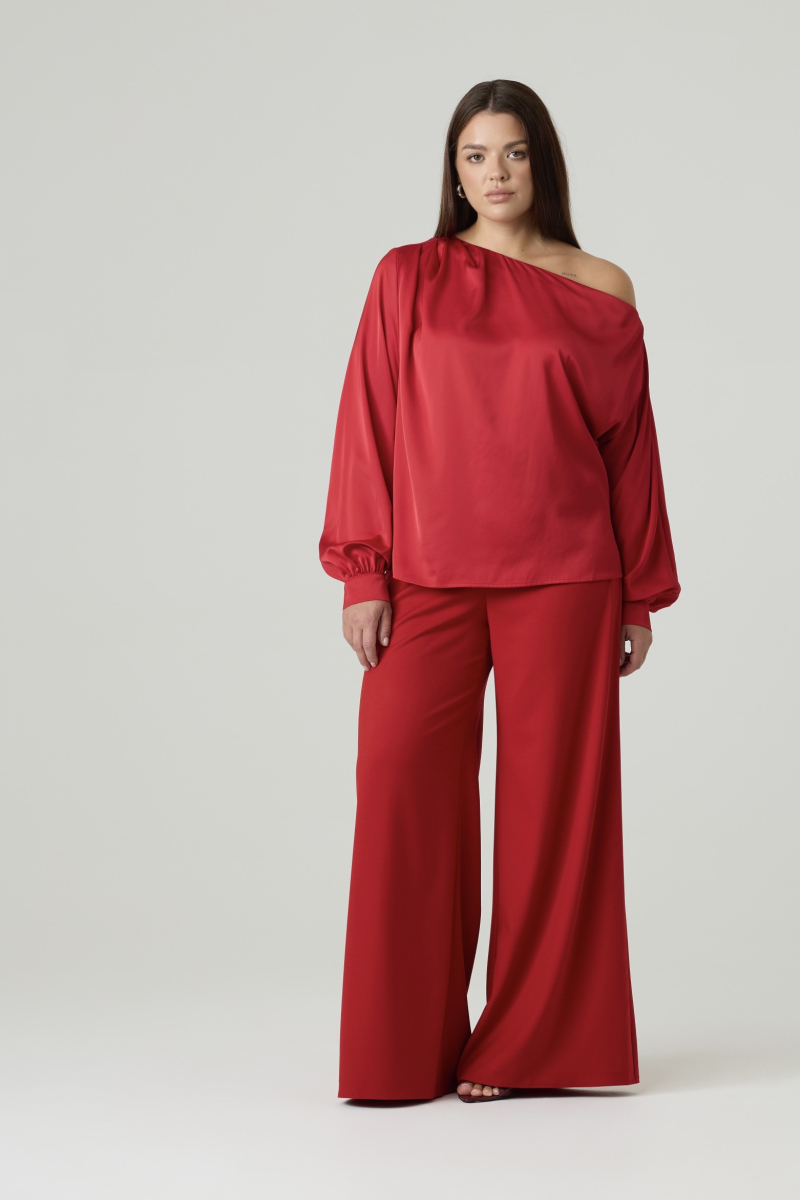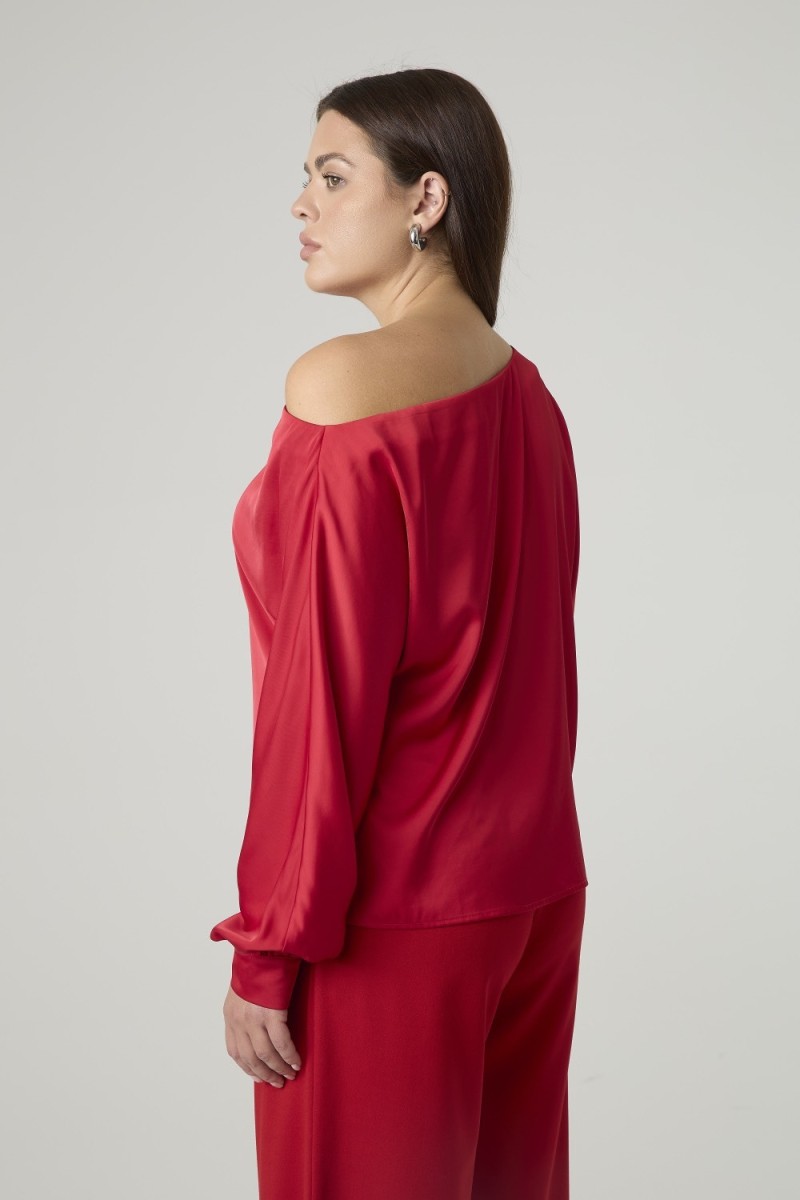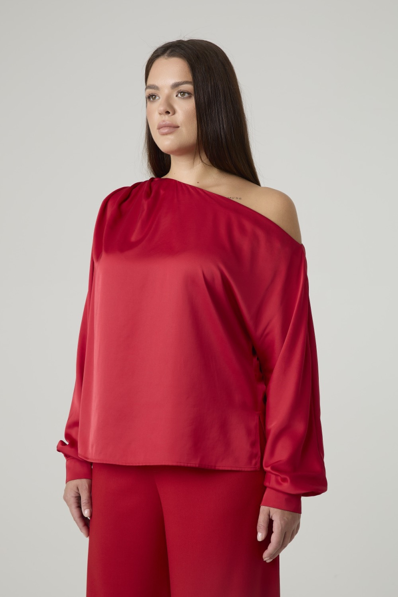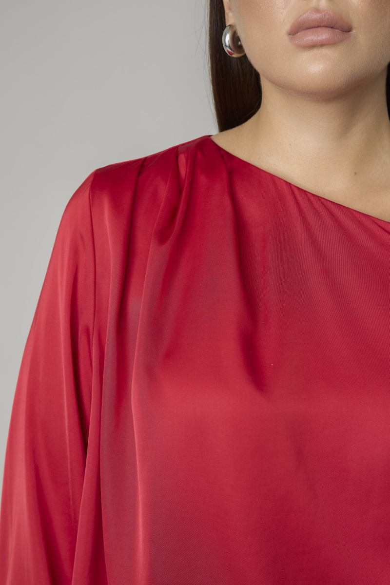 Женская блузка выполнена из гладкой, блестящей ткани насыщенного красного цвета, создающей праздничный и элегантный вид. Модель характеризуется свободным силуэтом и асимметричным вырезом с открытым плечом, что придает изделию современный и элегантный вид. Длинные рукава с объемной формой и манжетами на пуговицах обеспечивают аккуратную посадку.