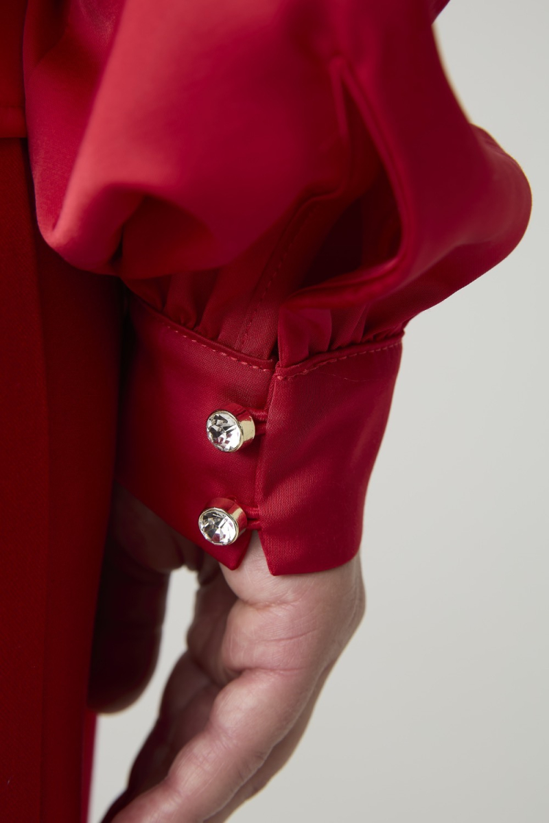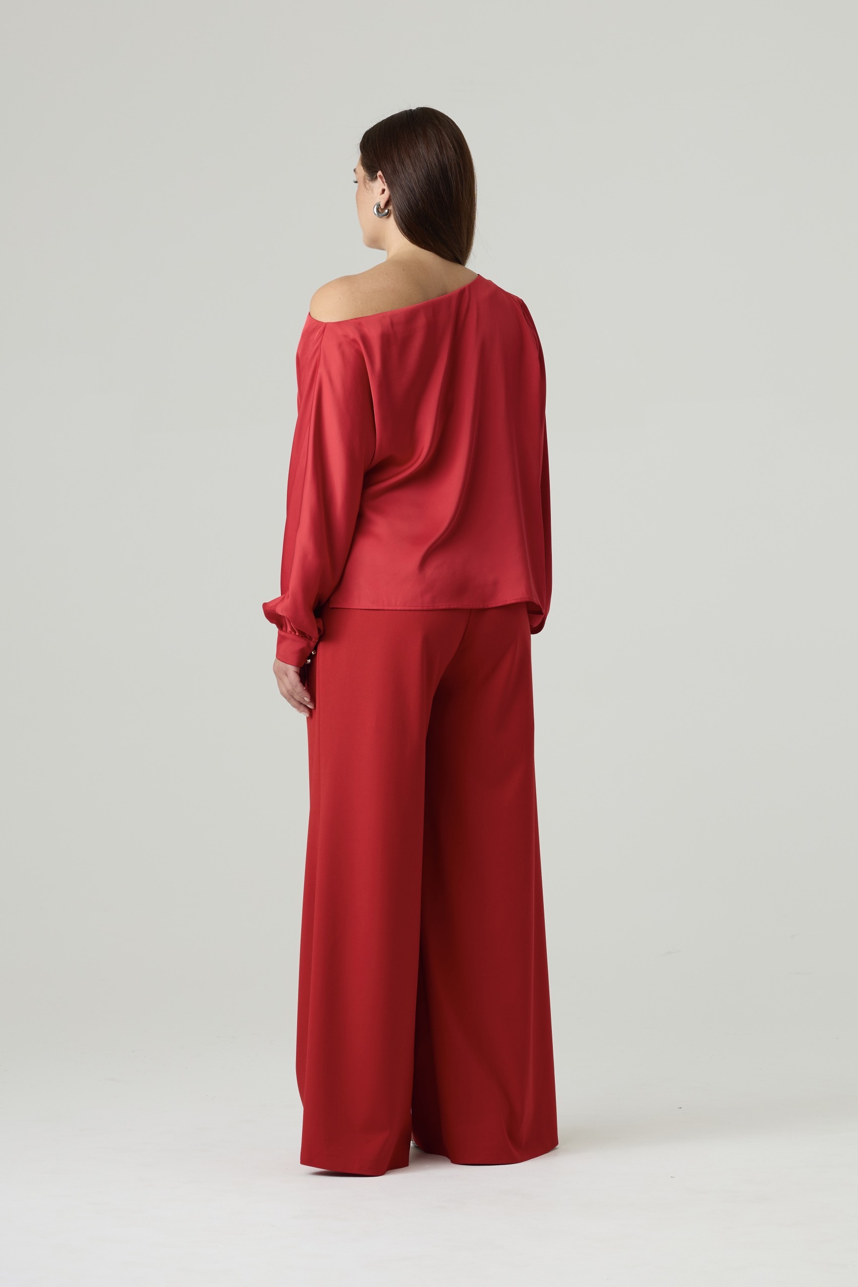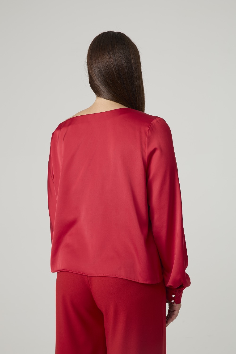 Женская блузка выполнена из гладкой, блестящей ткани насыщенного красного цвета, создающей праздничный и элегантный вид. Модель характеризуется свободным силуэтом и асимметричным вырезом с открытым плечом, что придает изделию современный и элегантный вид. Длинные рукава с объемной формой и манжетами на пуговицах обеспечивают аккуратную посадку.