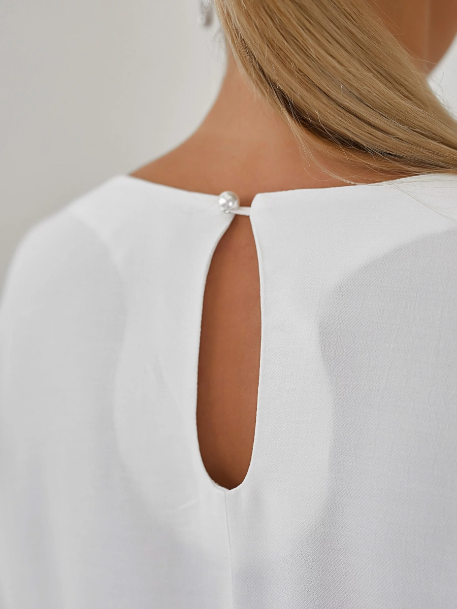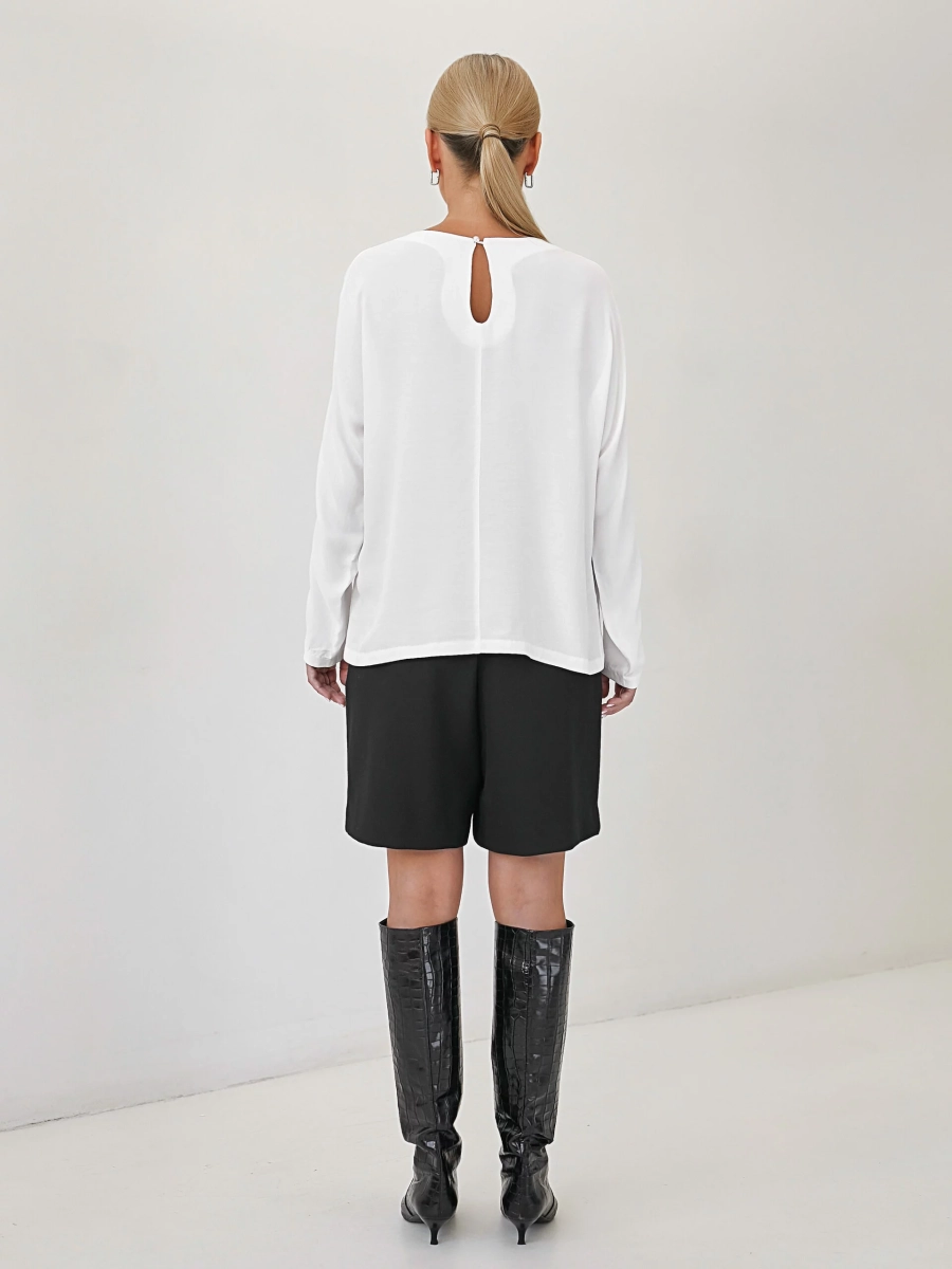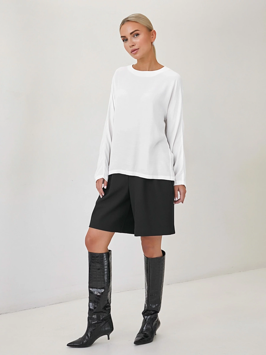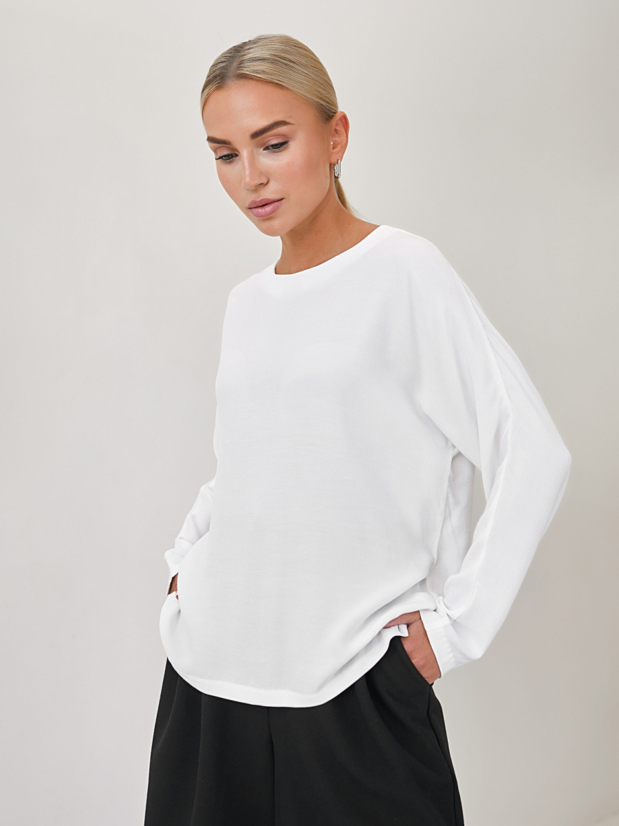 Блуза прямого силуэта с цельнокроеным зауженным к низу рукавом. Круглый вырез, застежка – пуговица.