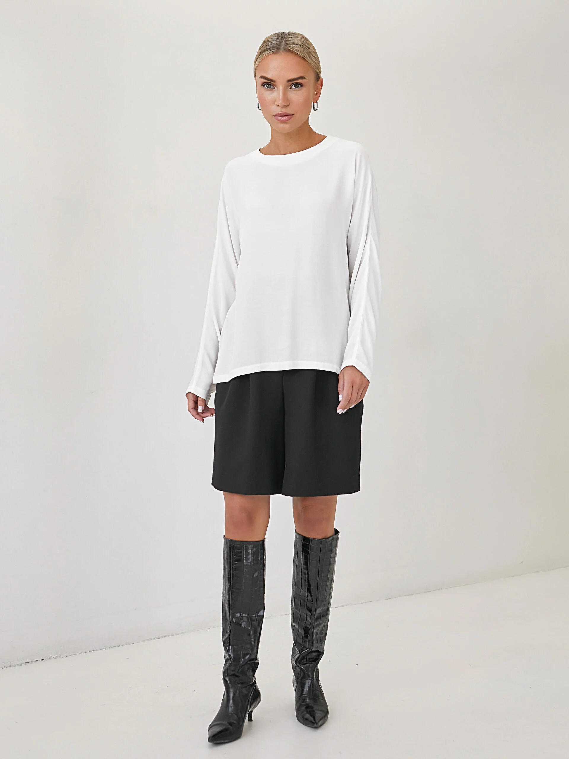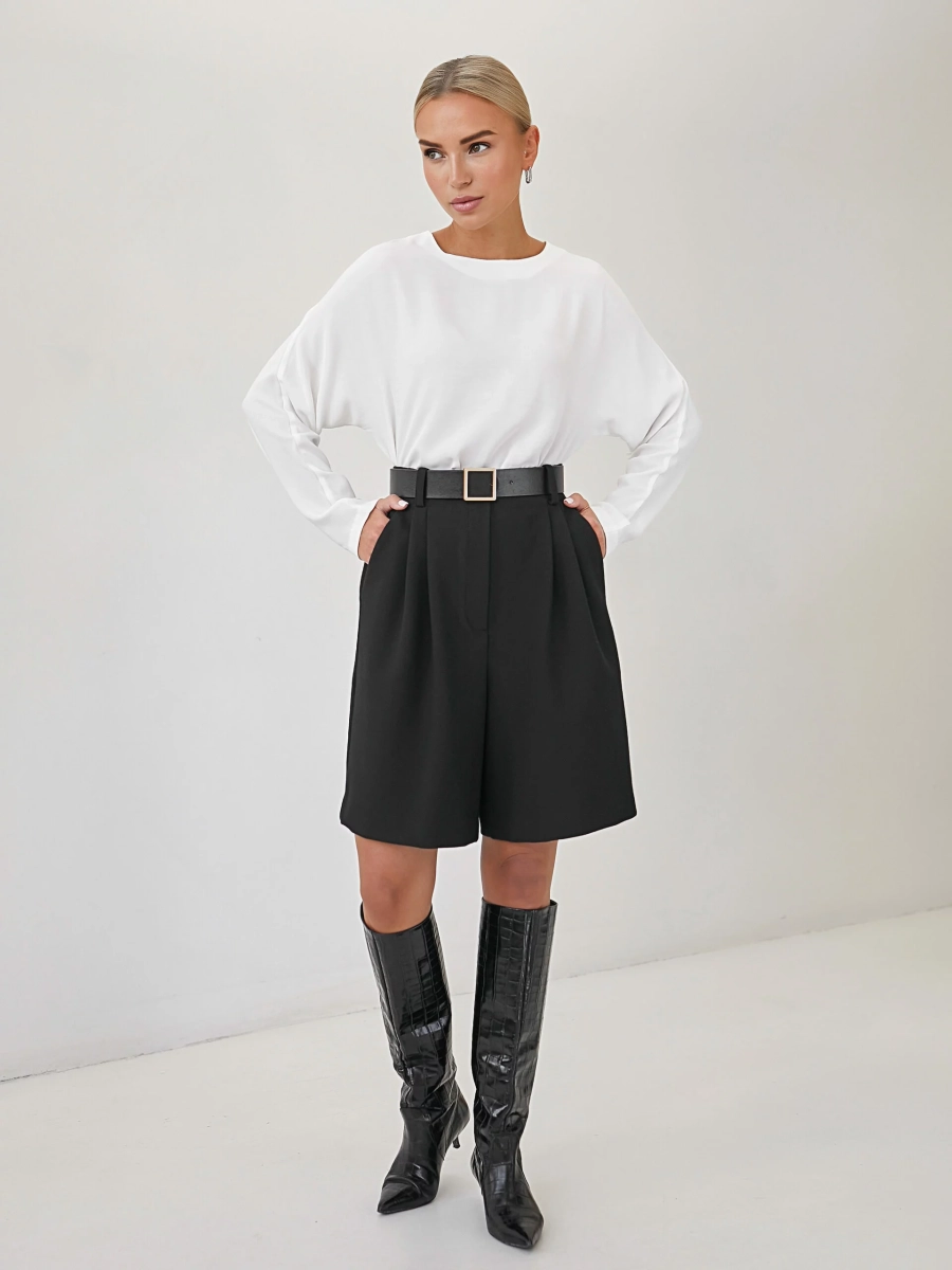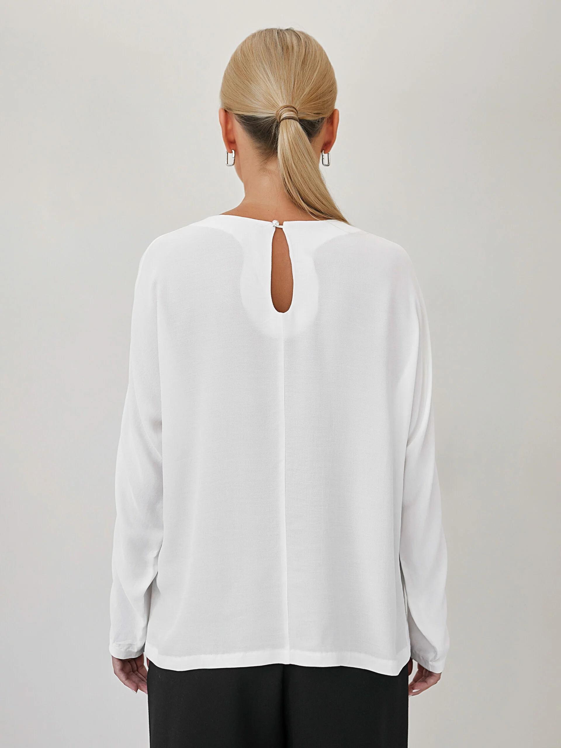 Блуза прямого силуэта с цельнокроеным зауженным к низу рукавом. Круглый вырез, застежка – пуговица.