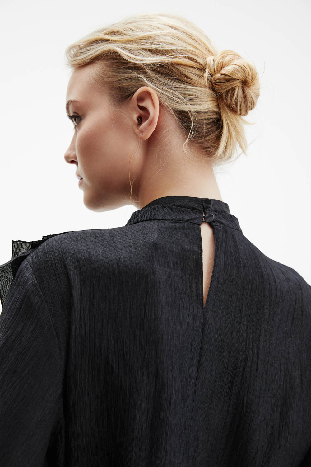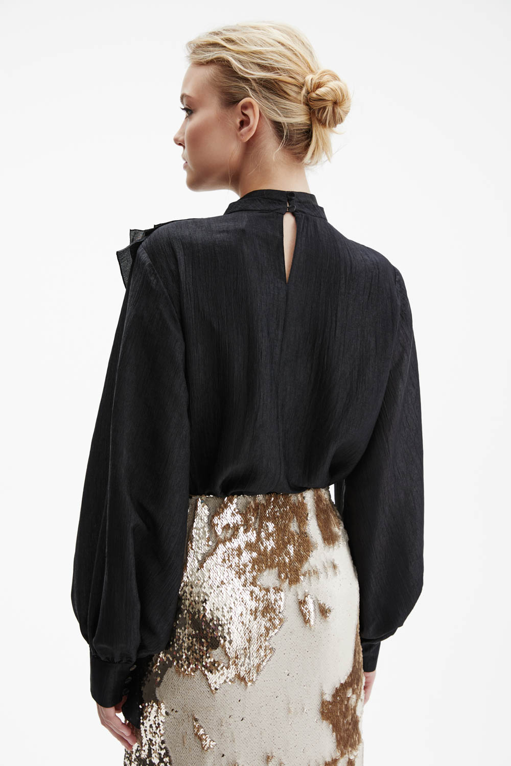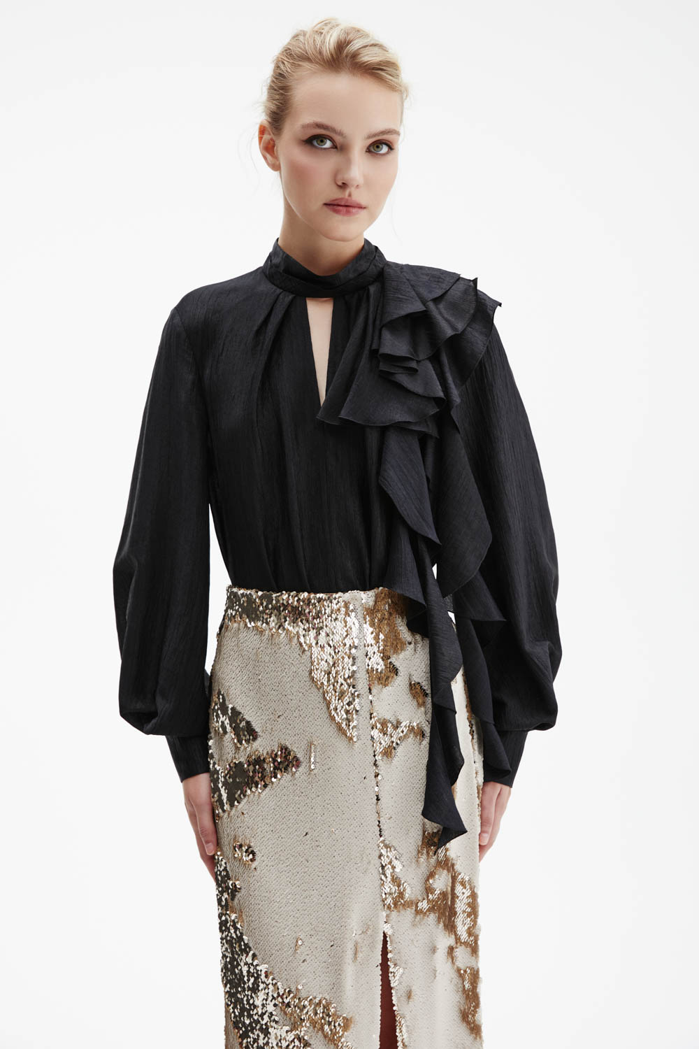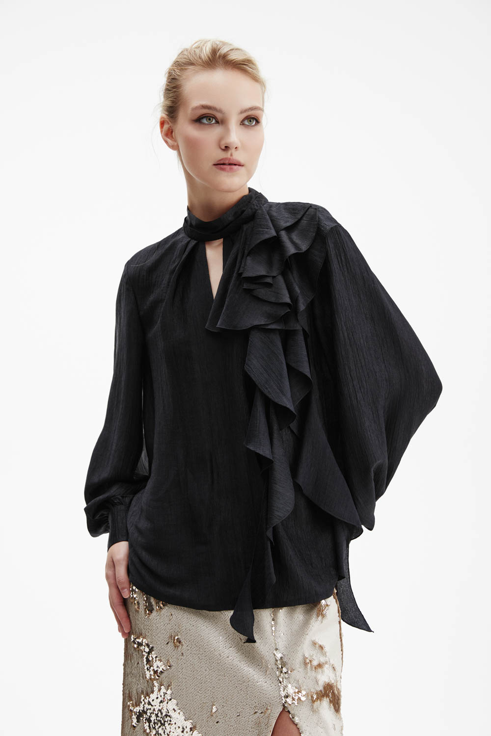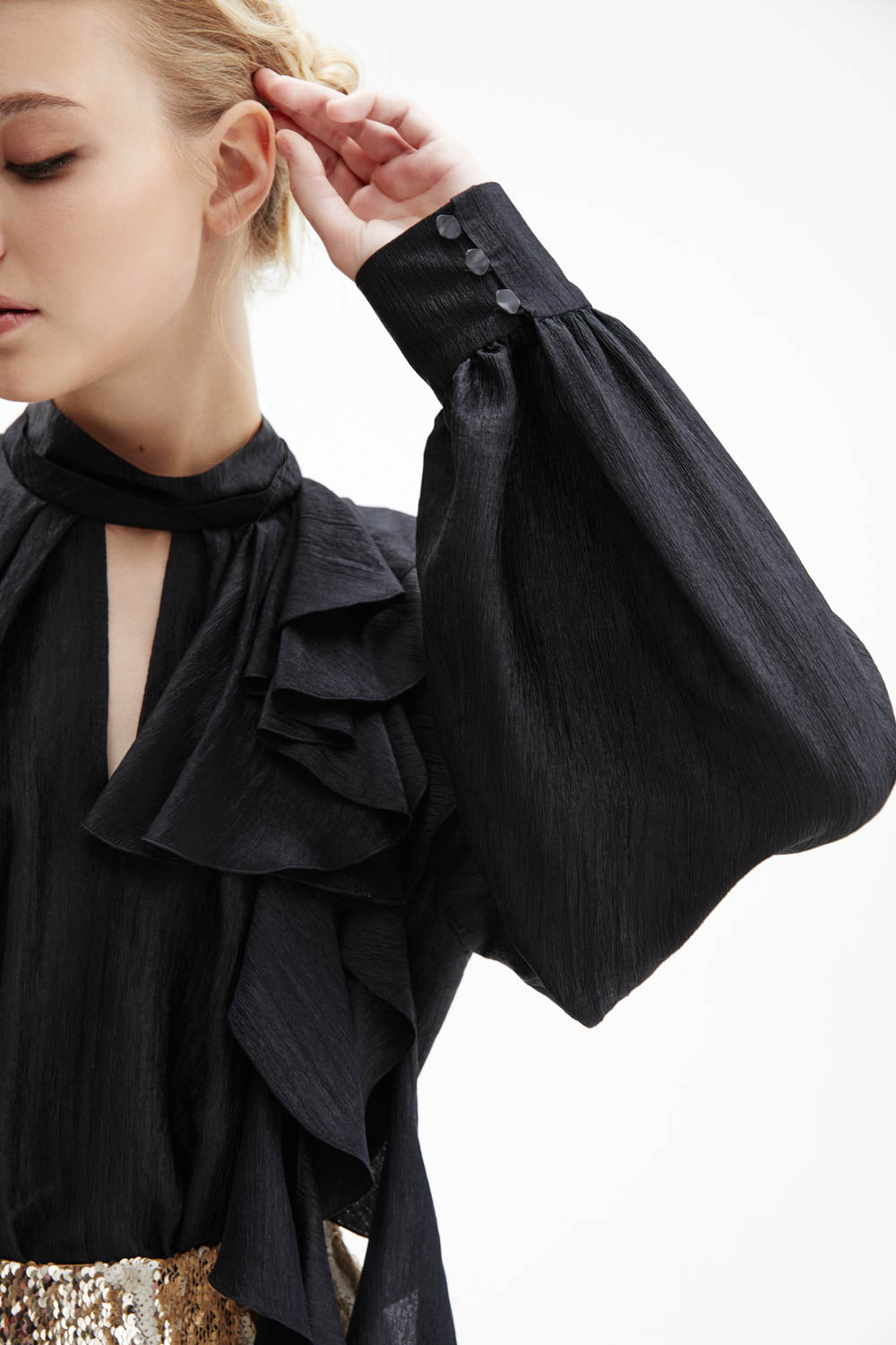 Элегантная чёрная блузка с объёмным воланом и шейным бантом — идеальный выбор для образа, сочетающего в себе драматичность и женственность. Лёгкая фактурная ткань и свободный крой создают эффект плавных линий, а глубокий вырез придаёт изюминку. Идеально сочетается как с вечерними юбками, так и с джинсами.