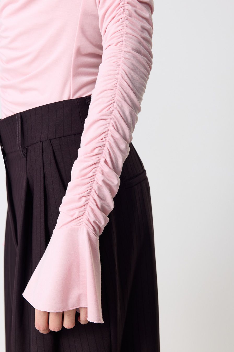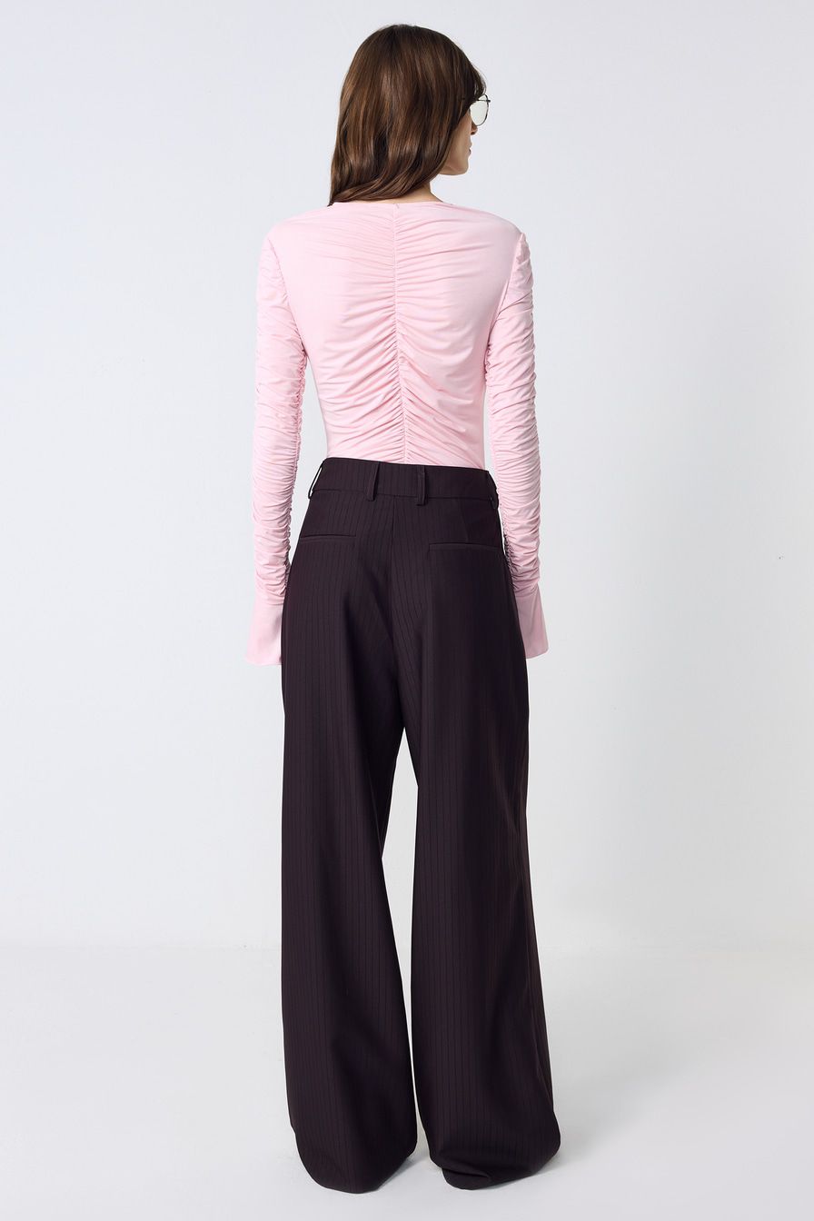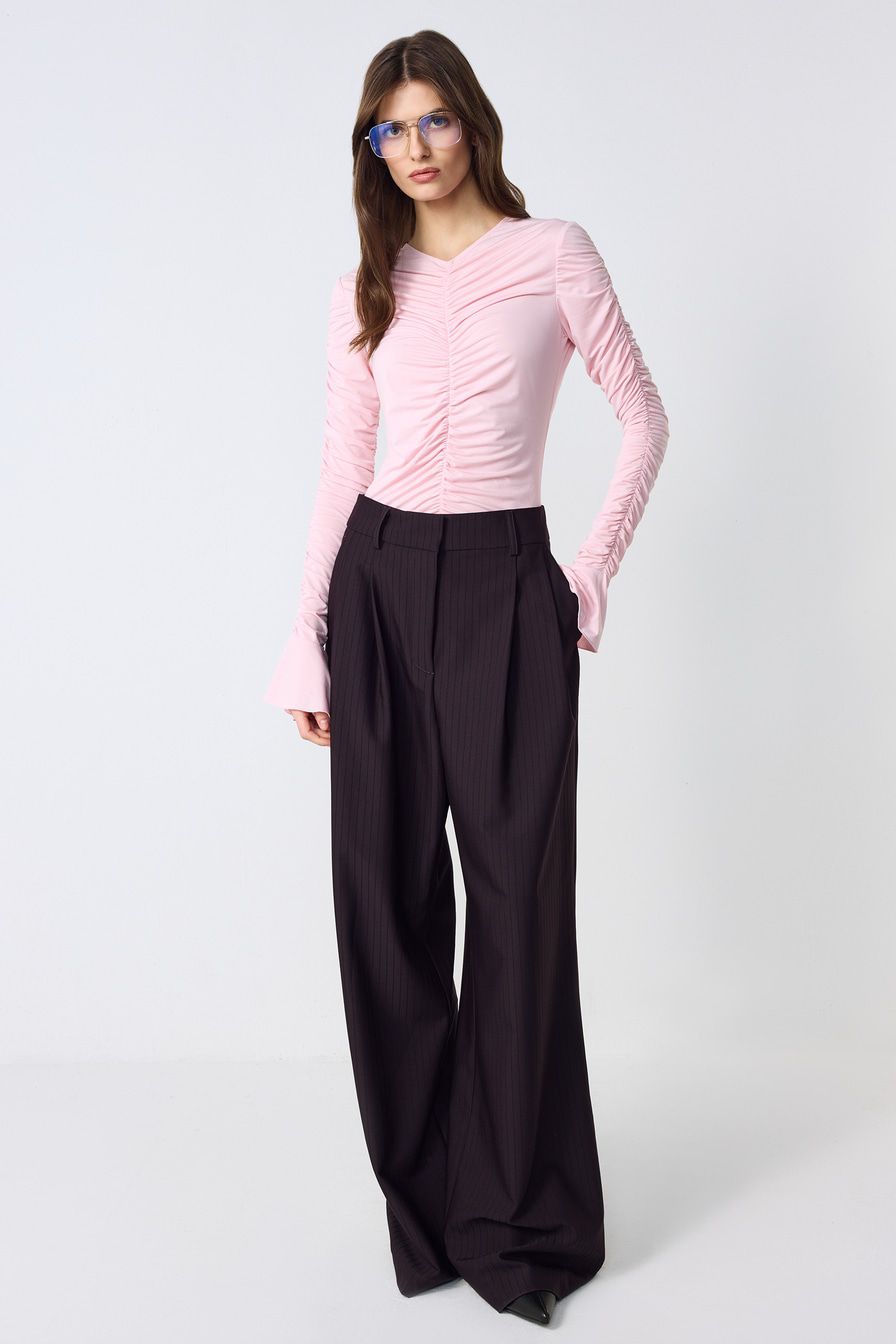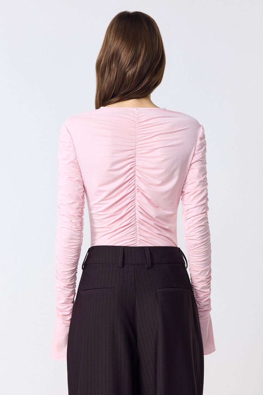 Розовое боди из мягкого бамбукового волокна – модель с длинными рукавами и V-образным вырезом. Боди декорировано складками по центру и на рукавах.
