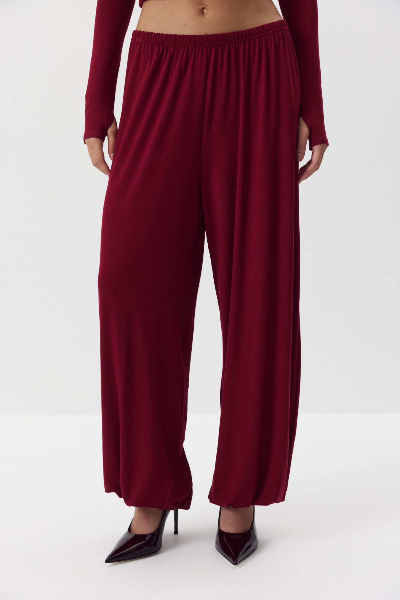 Джоггеры из вискозы. Легкие брюки на эластичном поясе из вискозного мягкого трикотажа. По низу изделия манжета с тонкой резинкой, что позволяет создать объемный О-образный силуэт.