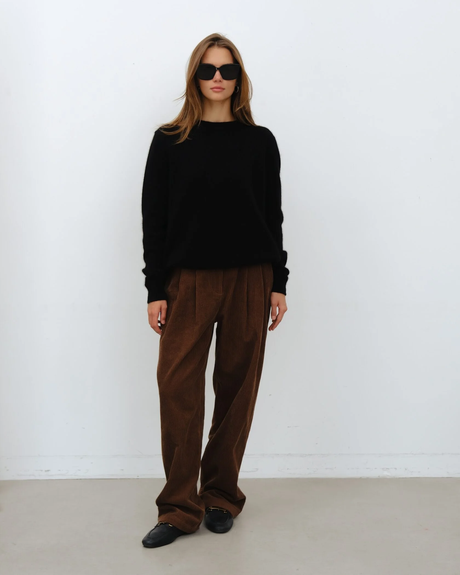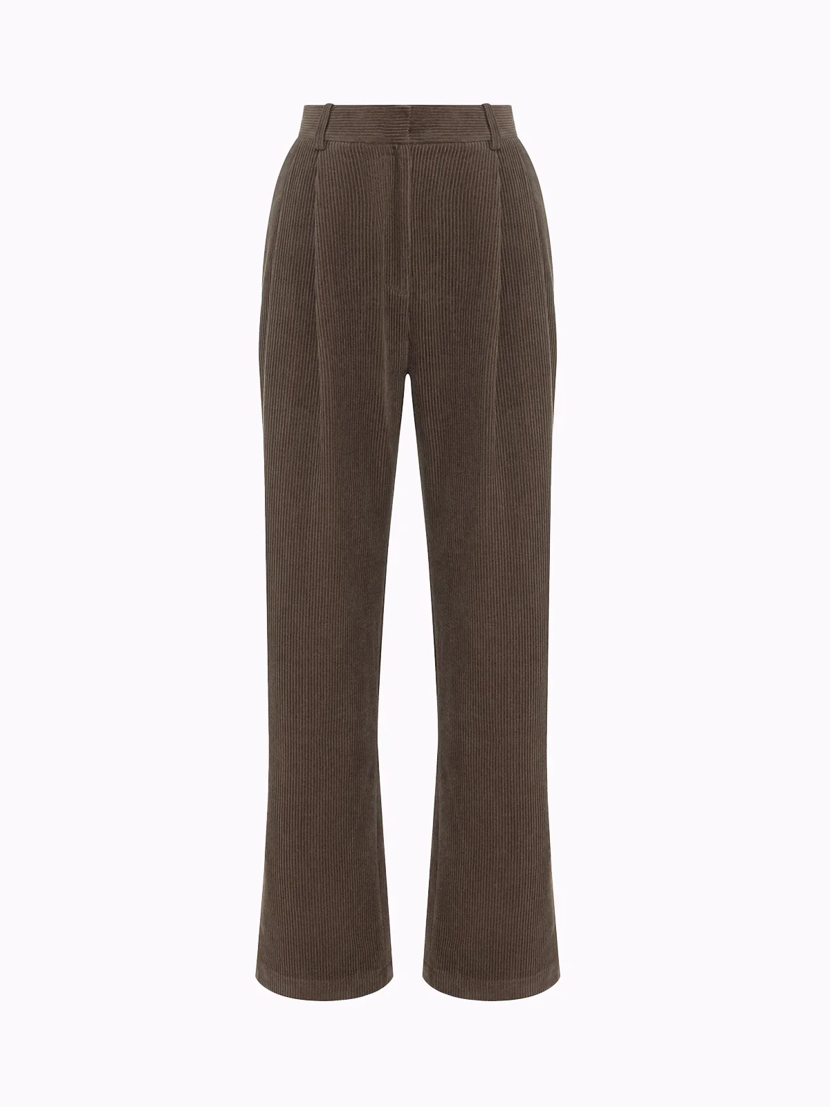 Стильный и комфортный элемент гардероба. Коричневый цвет придаёт брюкам универсальность, позволяя сочетать их с различными верхами. Защипы на талии создают изящный силуэт и подчёркивают фигуру. Вельветовая ткань обеспечивает приятные тактильные ощущения и долговечность изделия. Эти брюки станут отличным выбором для создания уютных повседневных образов.