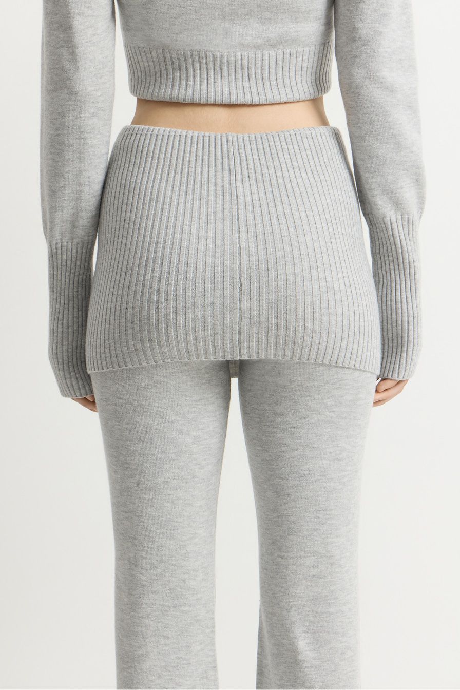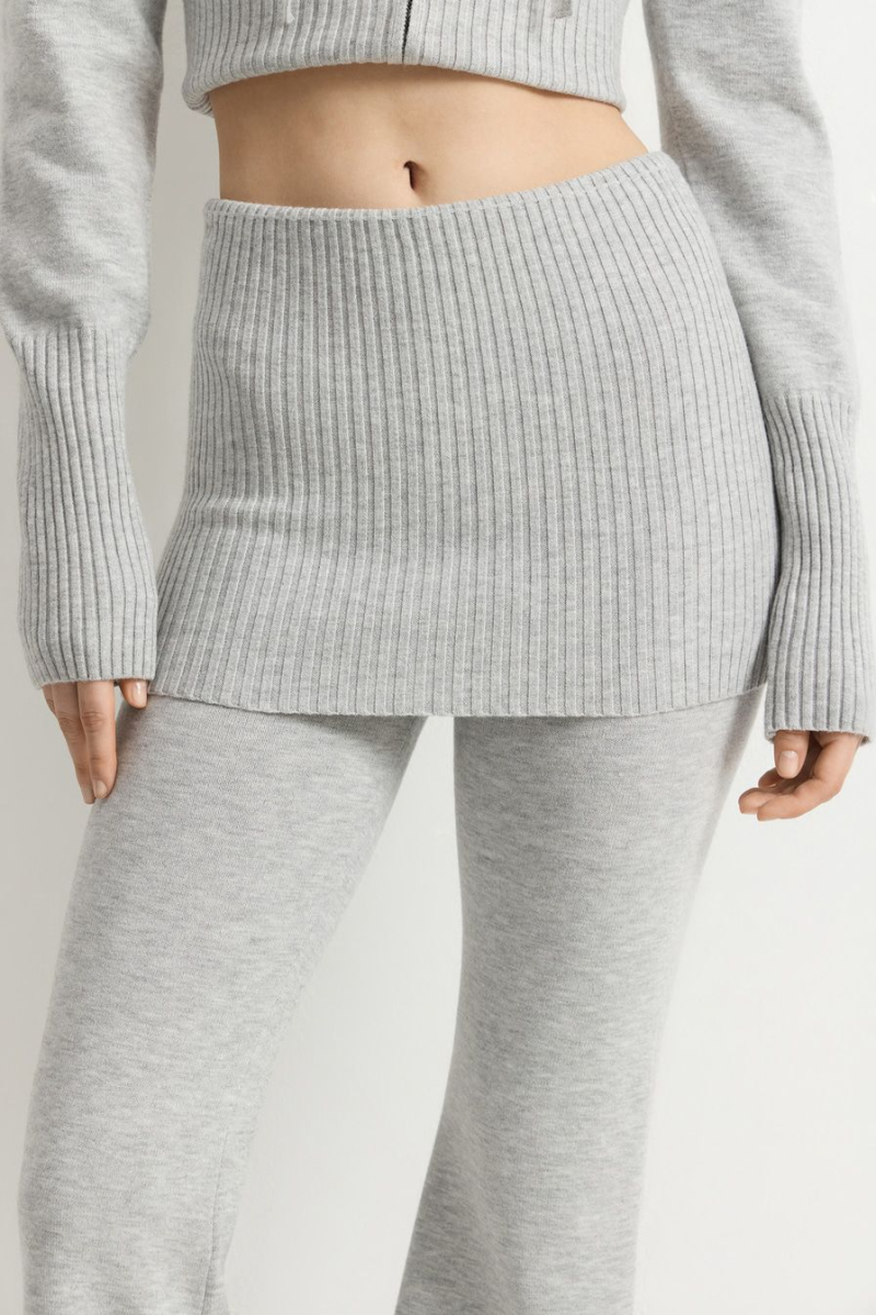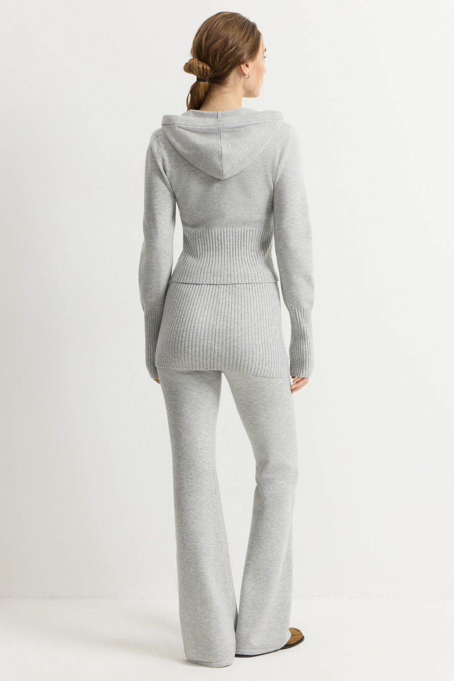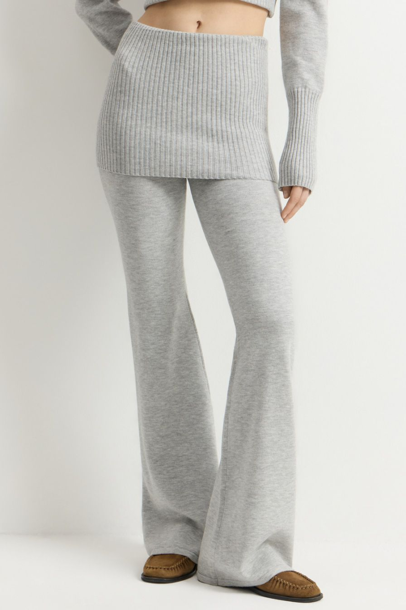 Трикотажные серые брюки из смесовой ткани с добавлением шерсти – модель расклешенного книзу кроя. Брюки дополнены отворотом с фактурой в крупный рубчик.