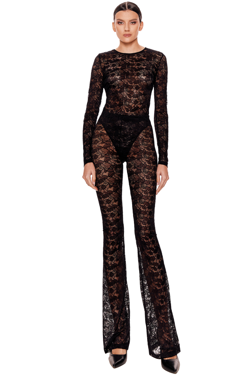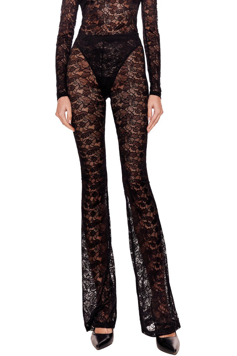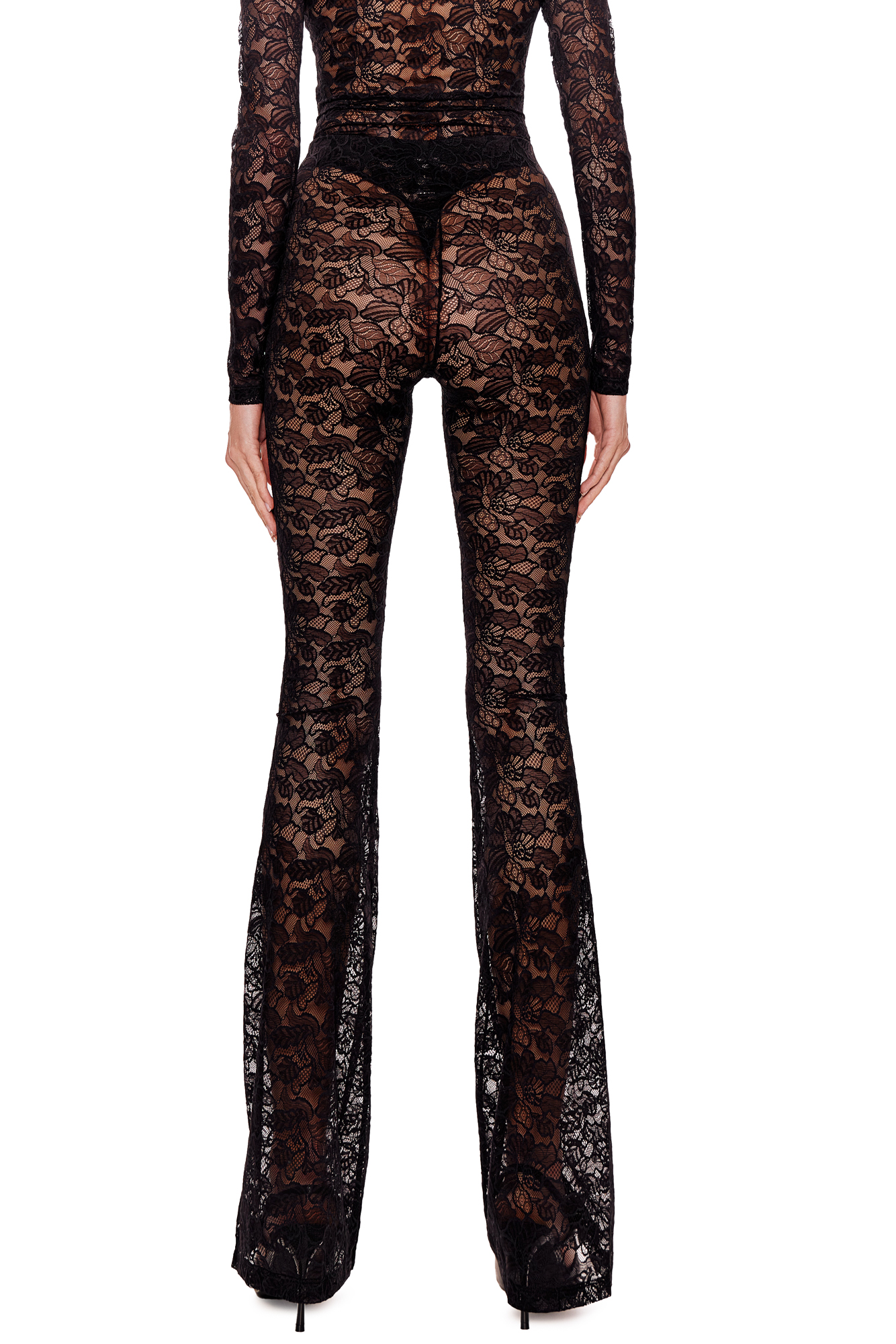 Брюки-клёш выполнены из ажурной гипюровой ткани с флористическим узором. Материал не утрачивает форму, приятен при контакте с телом, по краям брюки имеют безупречную контурную обработку. Модель в стиле дерзкого шика с нотами романтизма интегрируется в неординарные образы. Например, с топами и лонгсливами из гипюра в стиле «total lace», а также с футболками оверсайз, курткой косухой, активными аксессуарами. Экспериментируй смело и дерзко!