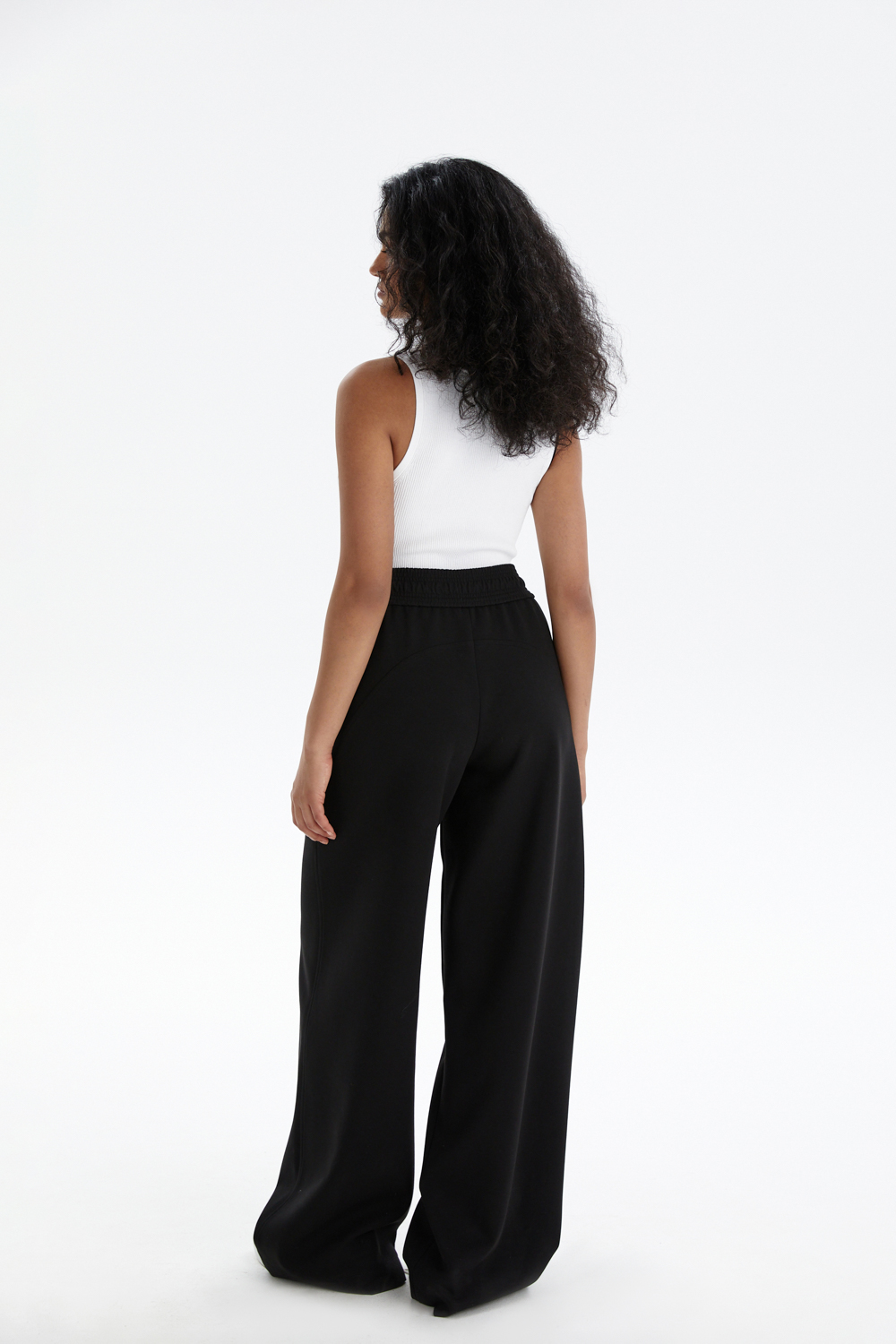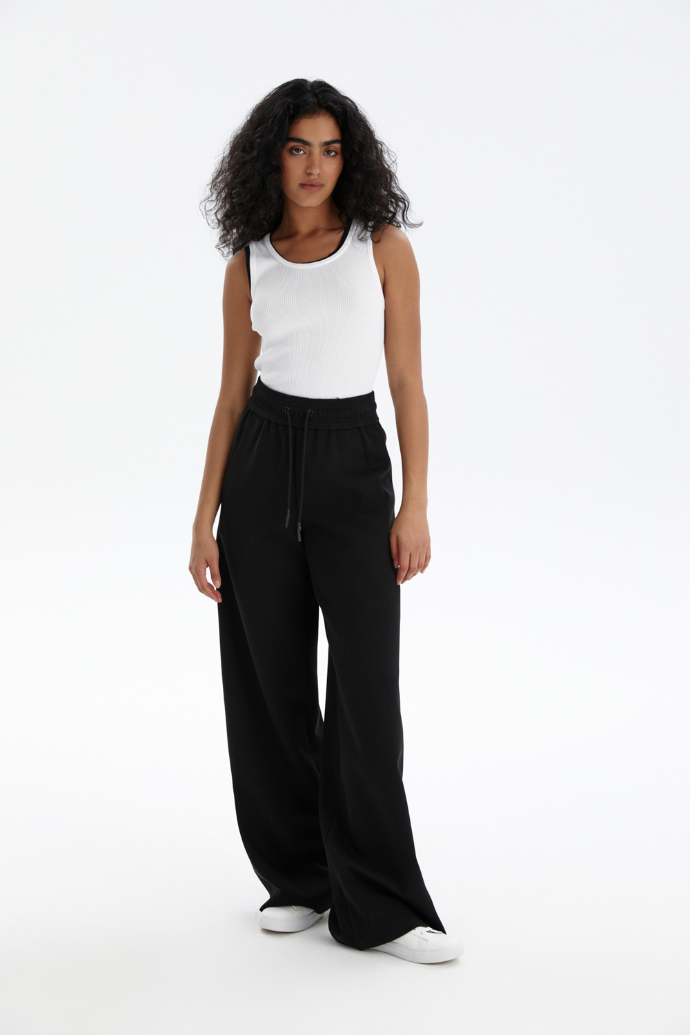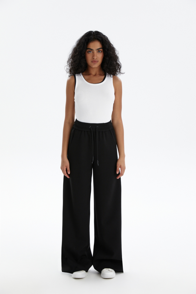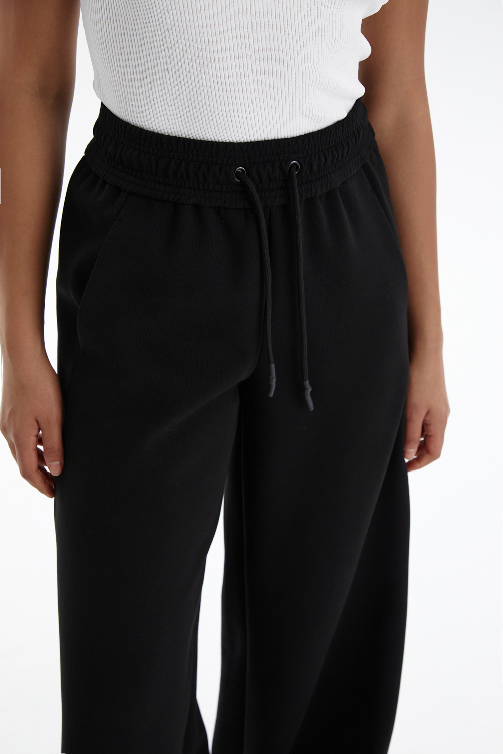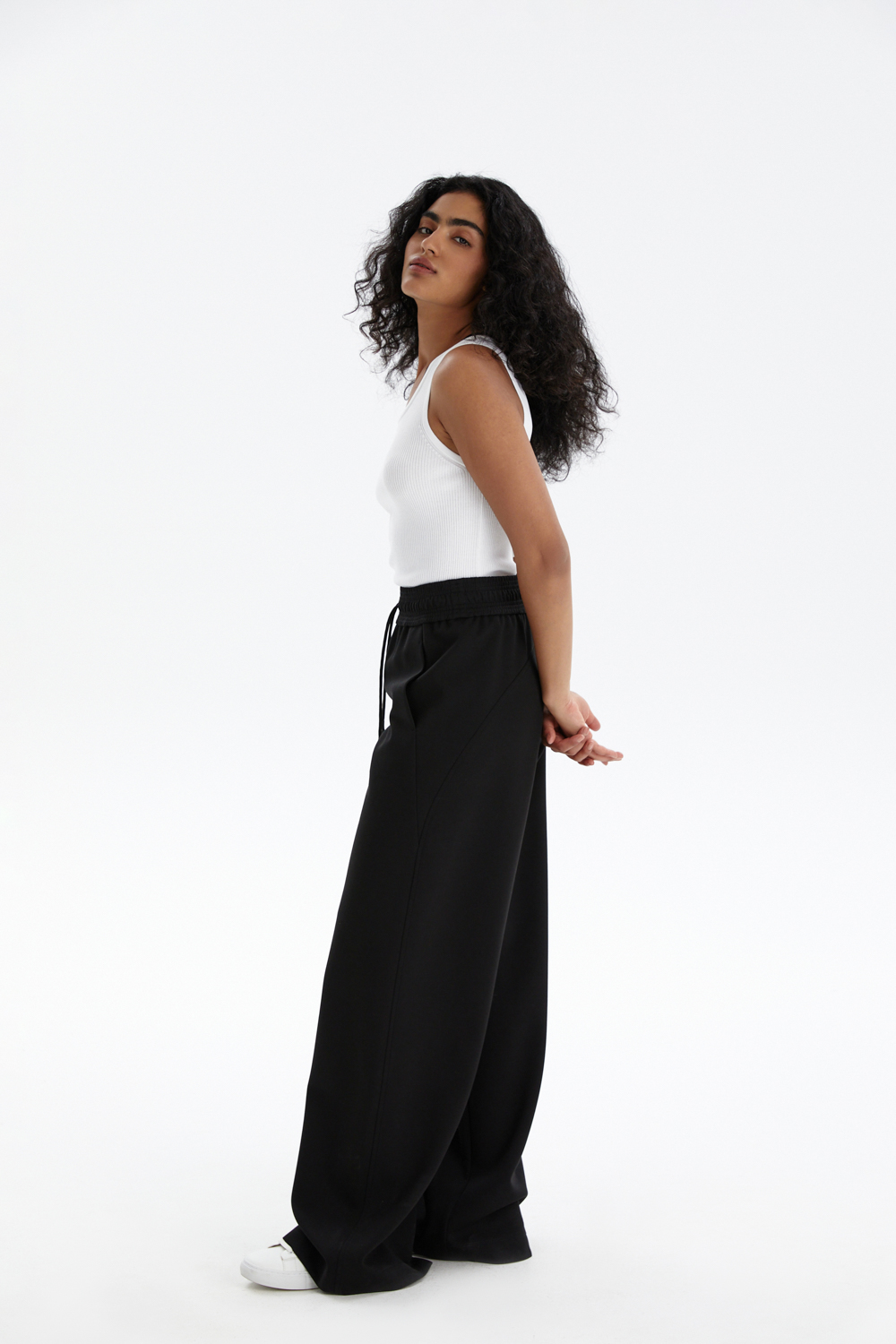 Брюки выполнены из мягкого и эластичного трикотажа в классическом чёрном цвете. Свободный крой и высокая посадка на удобной резинке со шнурком обеспечивают комфорт и свободу движений, а прямые широкие штанины визуально удлиняют силуэт. Боковые карманы добавляют практичности, сохраняя при этом лаконичный и современный вид. Эта модель универсальна в сочетаниях: носите брюки с худи или свитшотом для уютного кэжуал-образа, дополняйте футболками и кроссовками для повседневного стиля или комбинируйте с жакетами и рубашками для расслабленного городского аутфита.